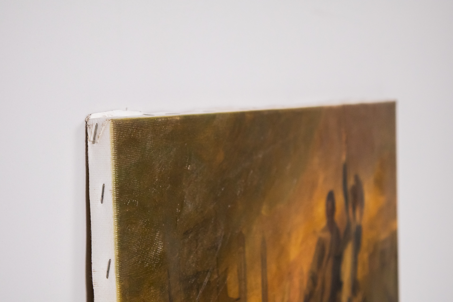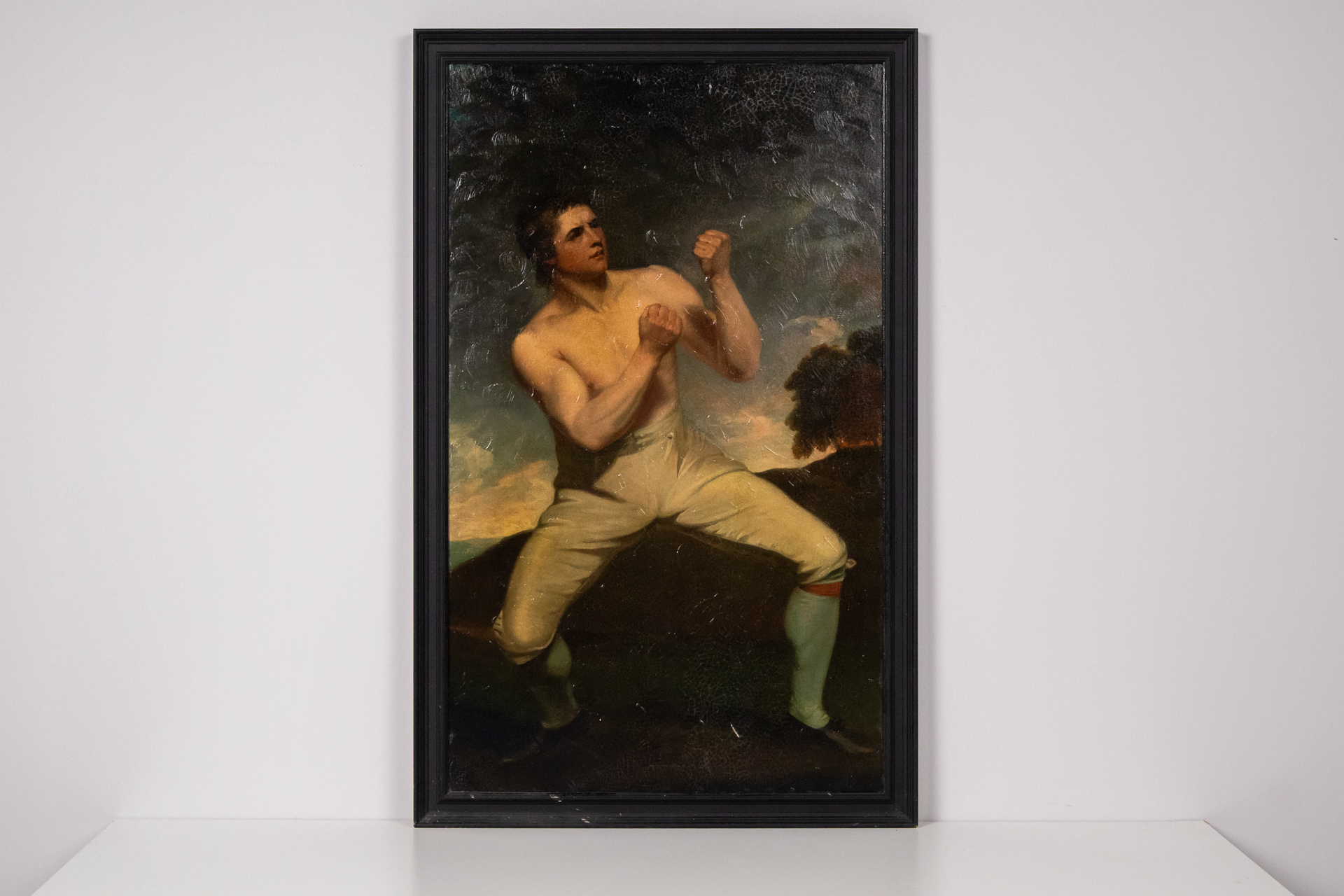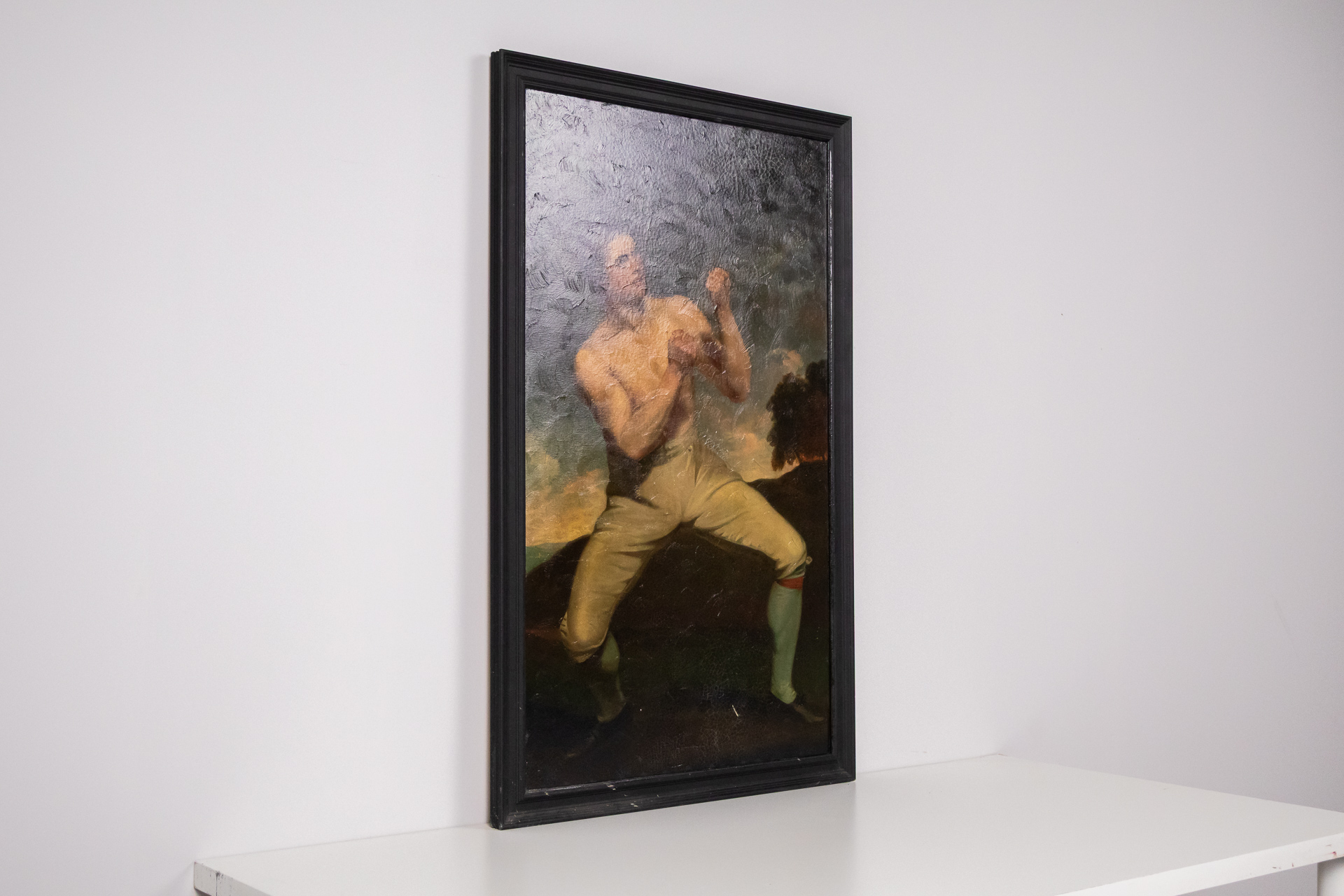 A festmény egy izmos sportolót ábrázol, aki harci pozícióban áll, félmeztelenül, fehér nadrágban és zöld-sárga csíkos zokniban. A háttérben sötét felhők és egy naplemente látható, amely meleg árnyalatokat kölcsönöz a...