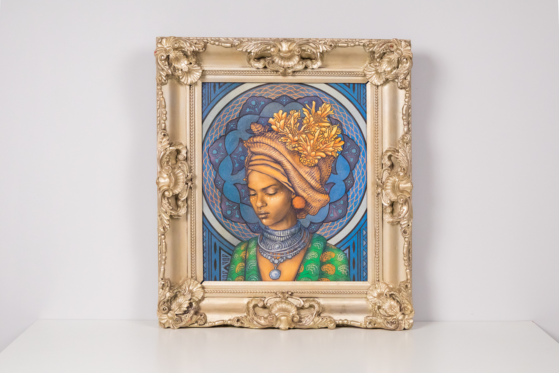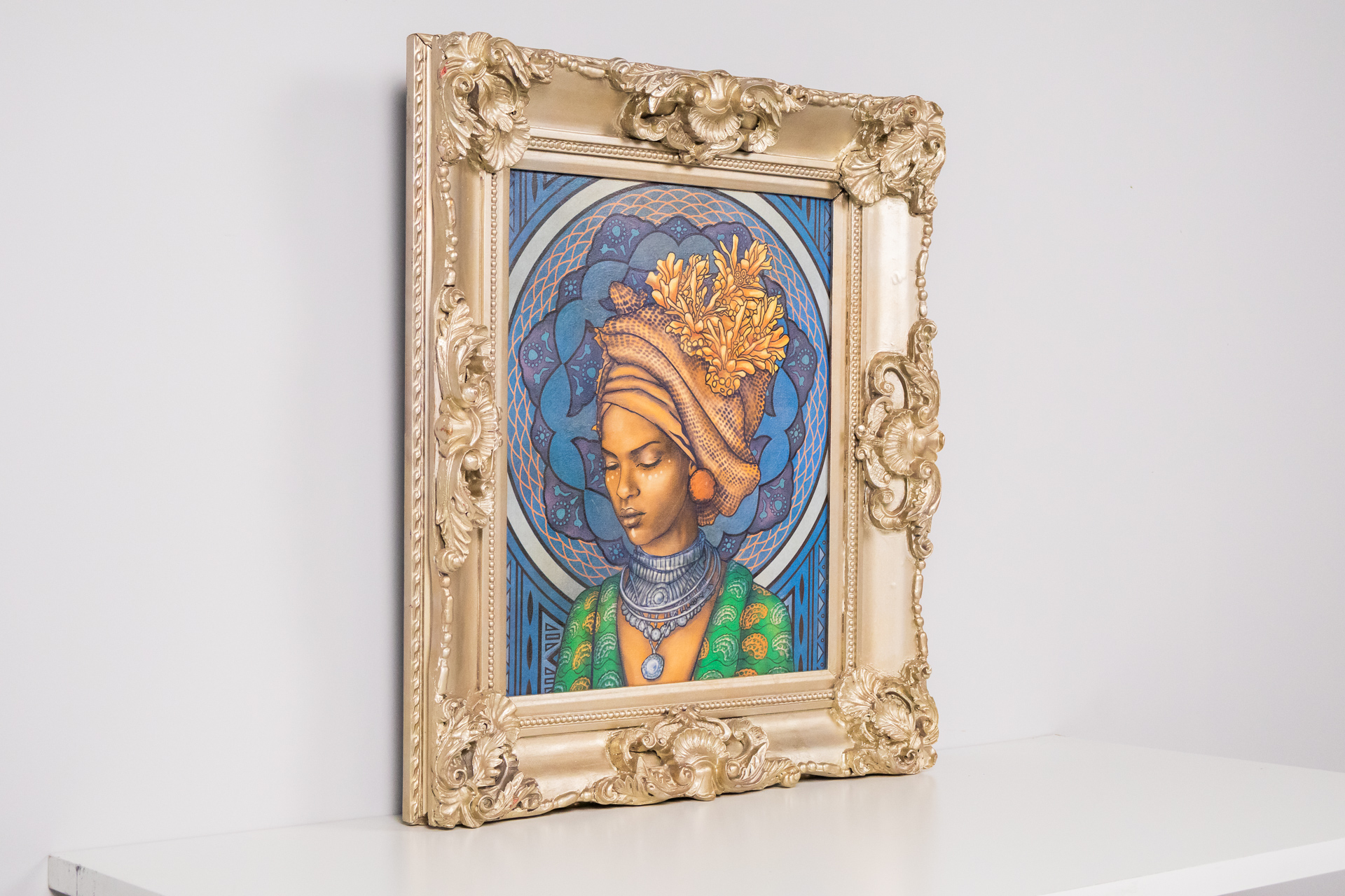 A kép egy fiatal női portrét ábrázol, gazdag színekben, kiemelkedő részletekkel. A nő fején virágmotívumokkal díszített kendő található, míg a háttér geometrikus mintázattal van ellátva, dominálva a kék és zöld...