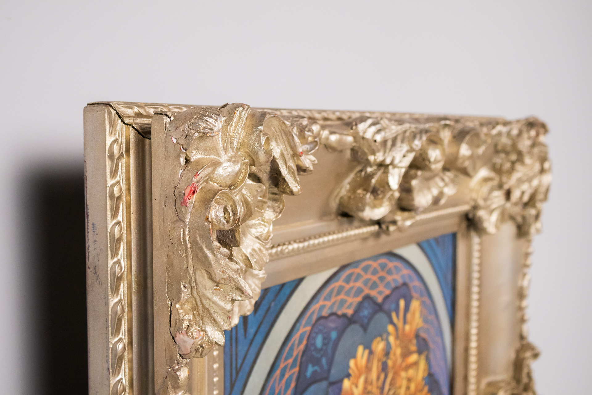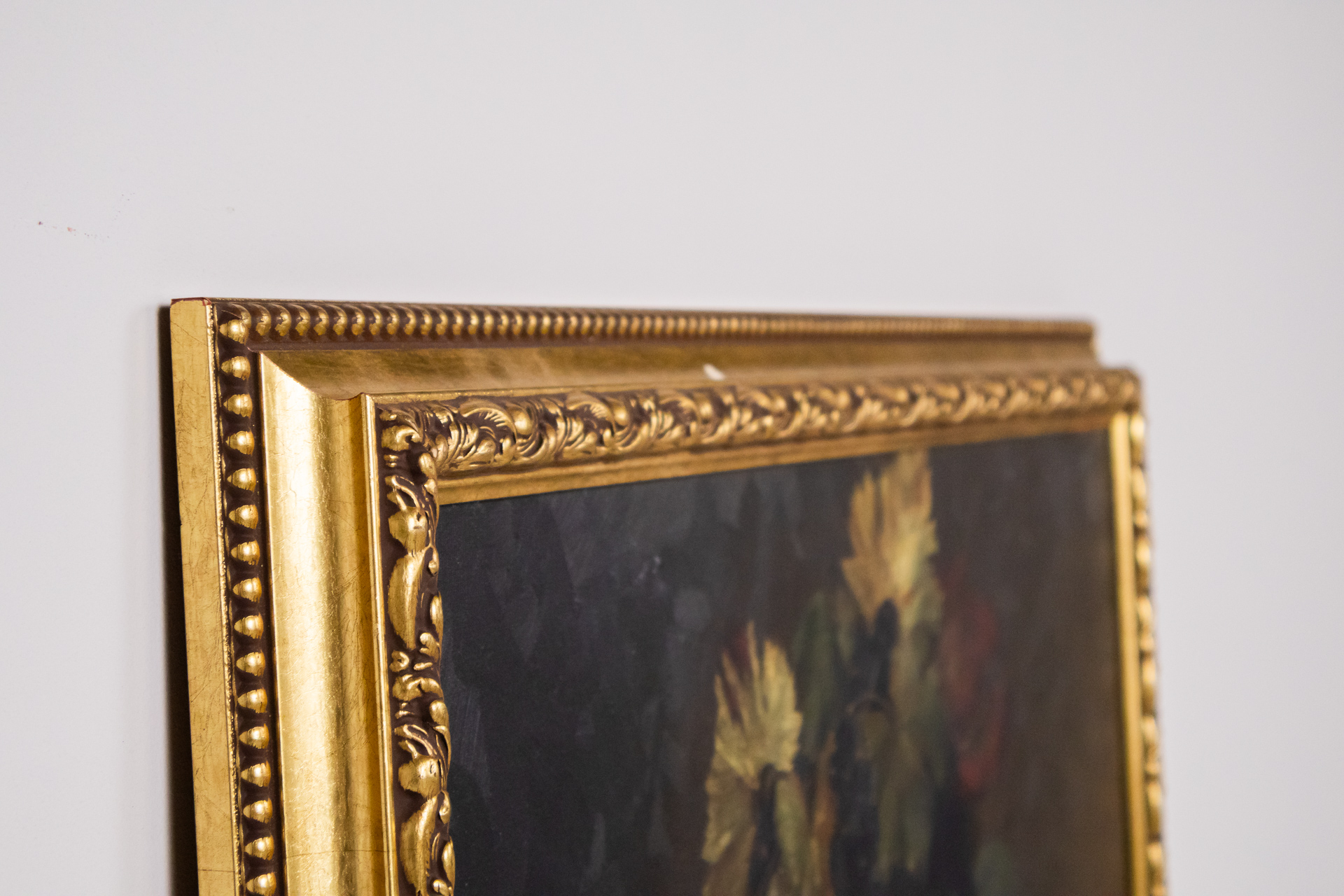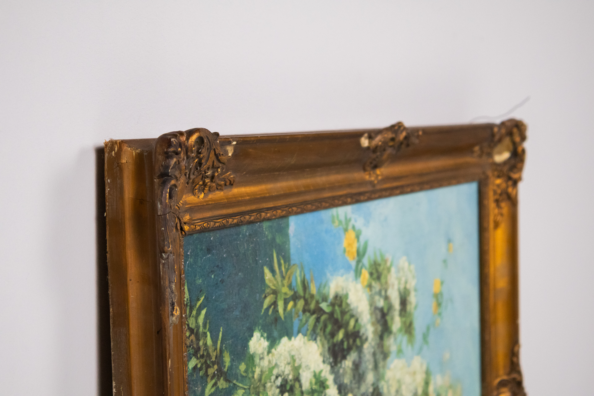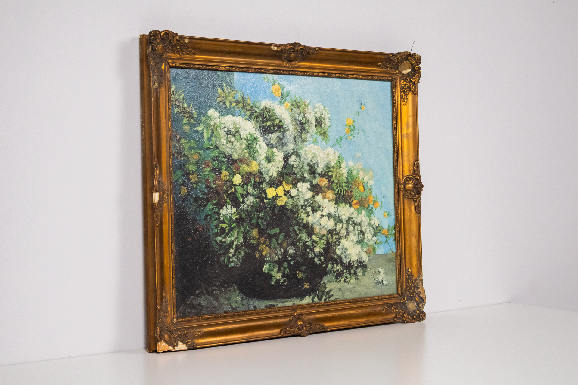 Színes virágcsokrot ábrázoló olajfestmény, amely gazdag zöld és fehér árnyalatokban pompázik, sárga és narancssárga virágokkal kiegészítve. A háttér világoskék, ami kontrasztot ad a virágoknak. A festmény aranyozott,...