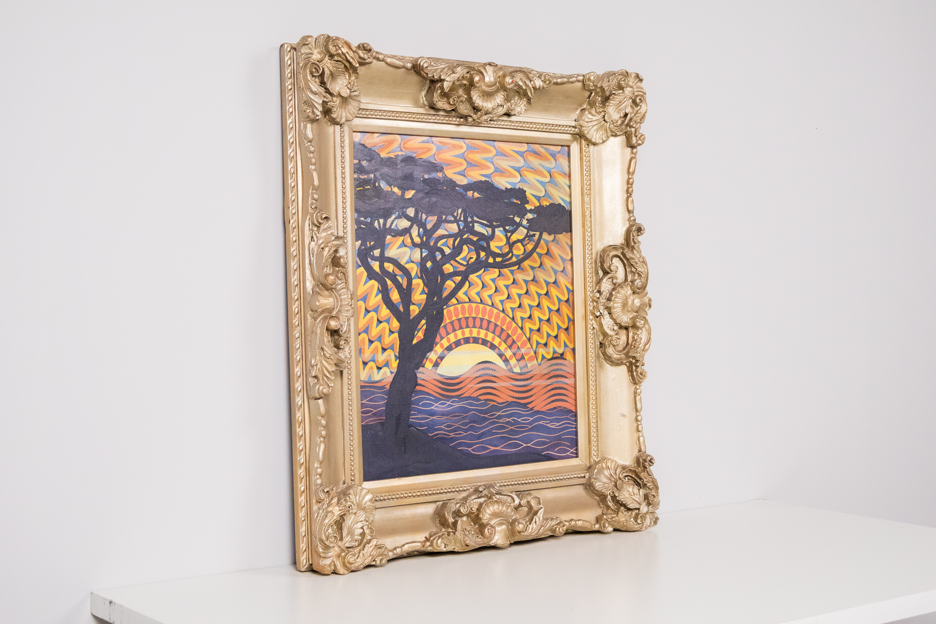Absztrakt stílusú tájkép, amely egy fát és naplementét ábrázol élénk színekkel és hullámzó mintákkal. A háttérben narancssárga, sárga és kék árnyalatok keverednek, míg a fa sziluettje sötét tónusú. A keret gazdagon...