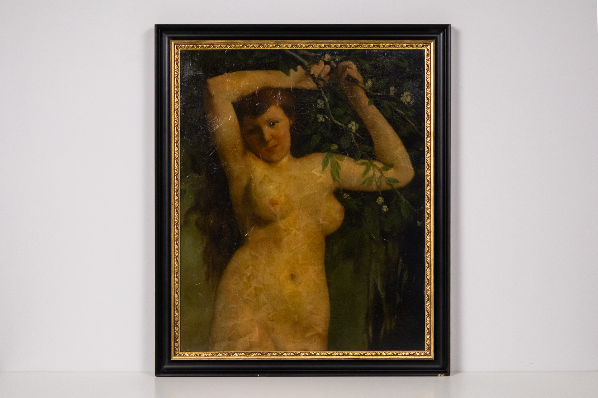 A festmény egy női aktot ábrázol, aki virágokat tart a kezében, és a háttérben lágy, zöld árnyalatok dominálnak. A figura finom vonásai és a test arányai realista stílusban készültek, lágy világítással. A festmény...