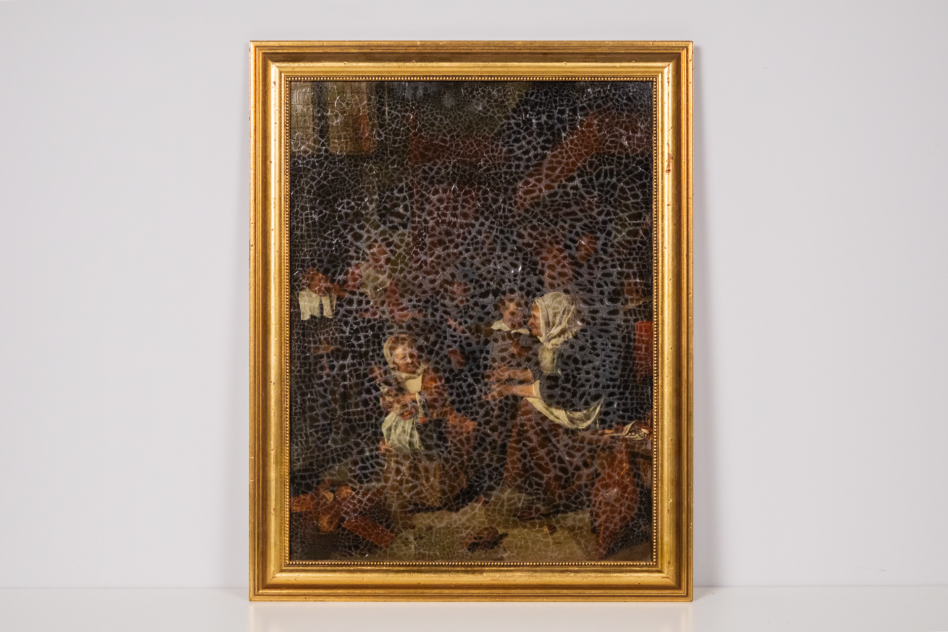 A kép egy családi jelenetet ábrázol, ahol felnőttek és gyermekek interakcióban vannak, valószínűleg egy otthoni környezetben. A festmény részletei elmosódottak, de a színek melegek, dominál a barna és a sárga...