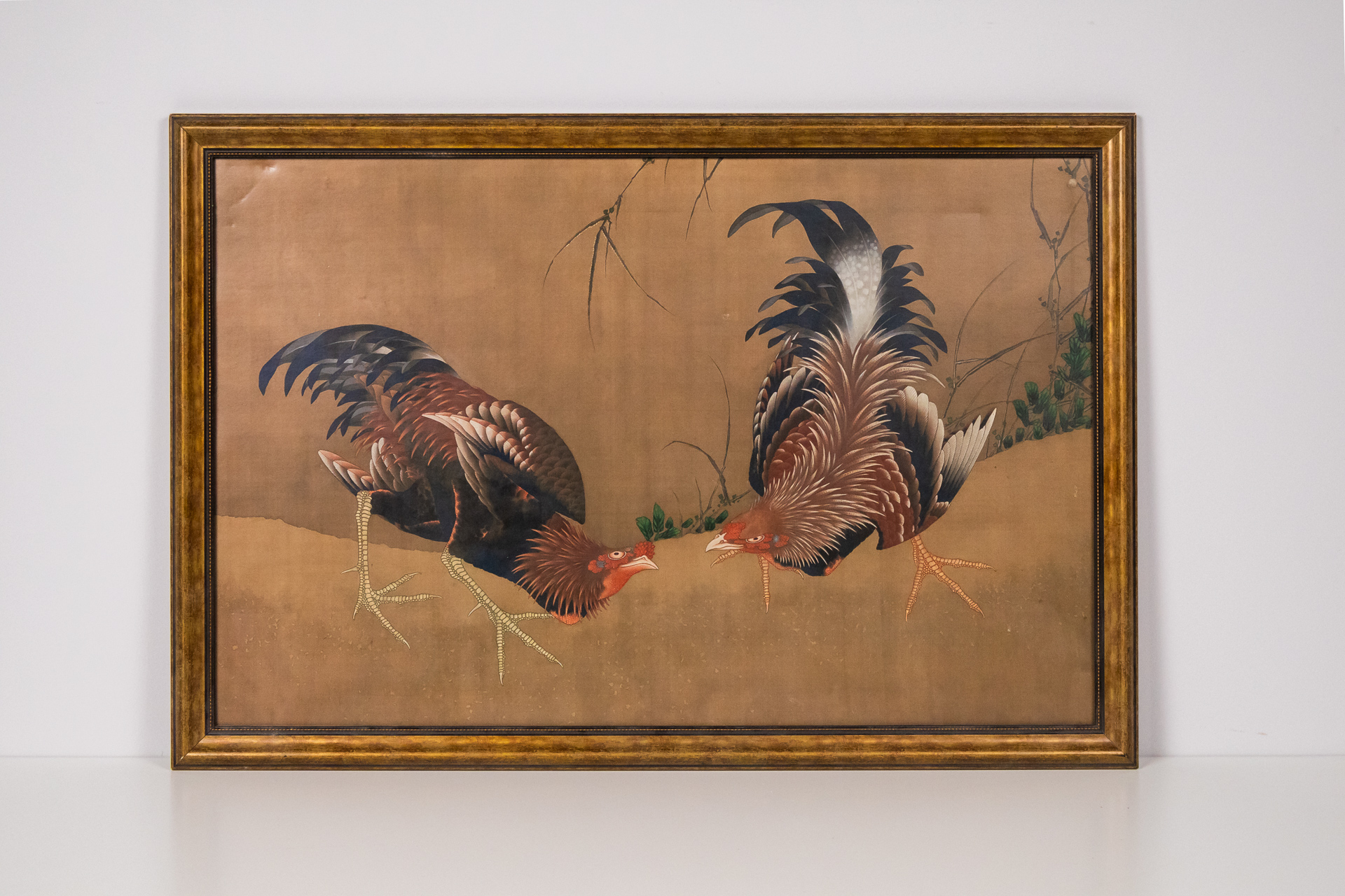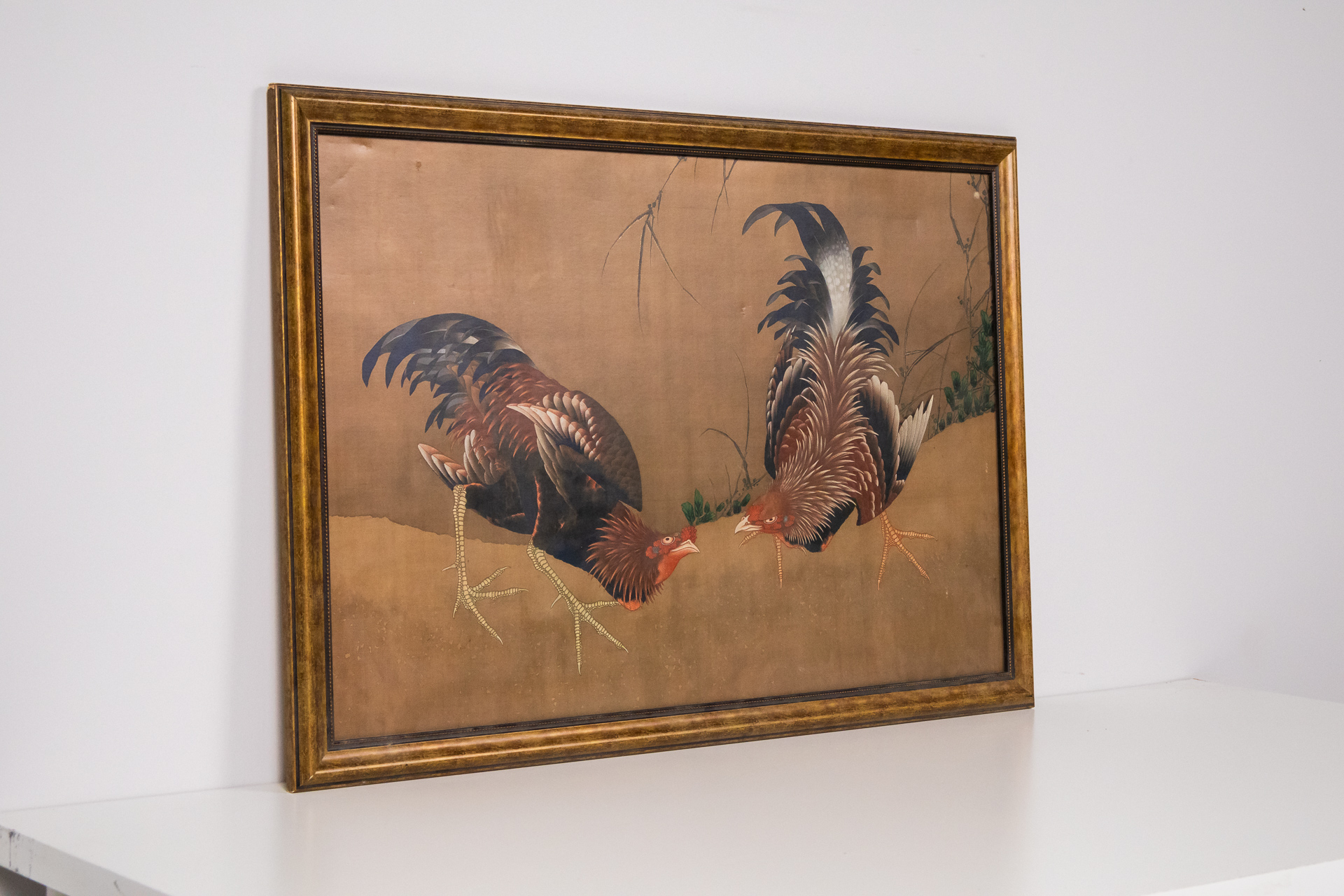 Hagyományos keleti stílusú festmény, amely két kakast ábrázol, amint egymással küzdenek. A háttér színei meleg barnák és bézsek, míg a kakasok élénk piros, fekete és fehér árnyalatokban pompáznak. A festmény...
