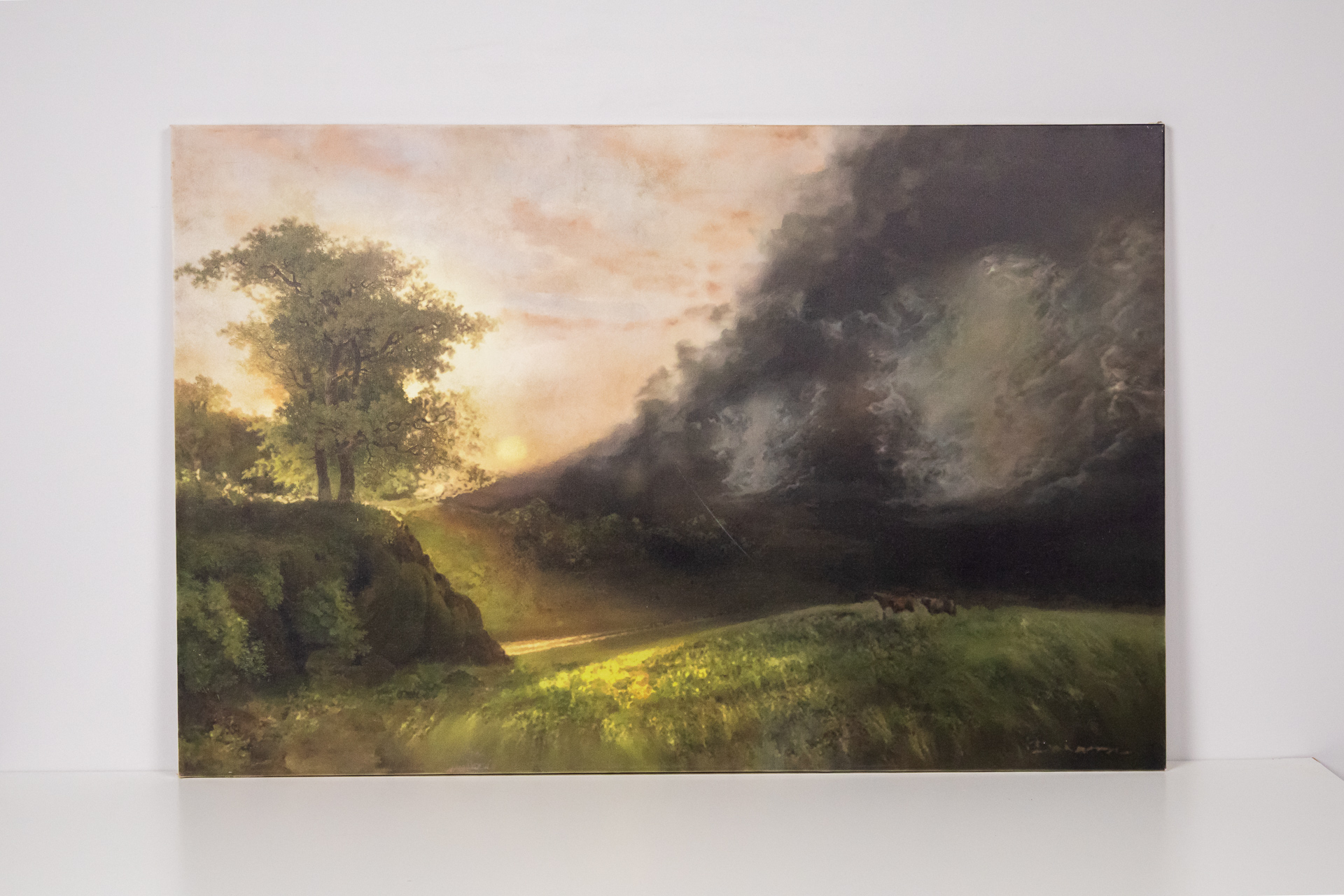Romantikus stílusú tájkép, amely egy zöld domboldalt és egy viharos égboltot ábrázol. A kép bal oldalán zöld fák láthatók, míg a jobb oldalon sötét felhők gyülekeznek. A napfény lágyan világít a tájra, a színek...