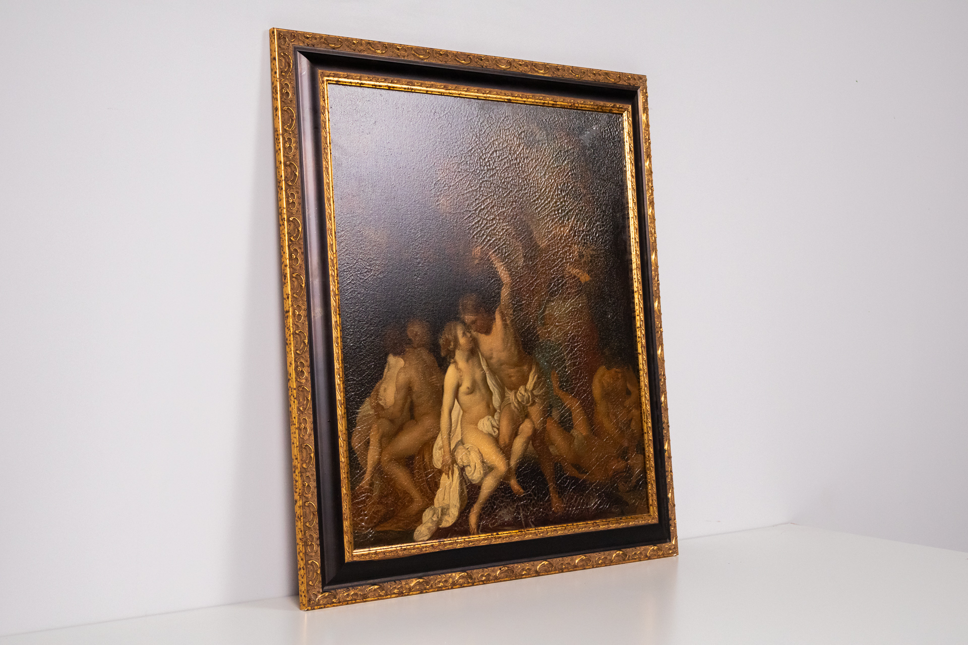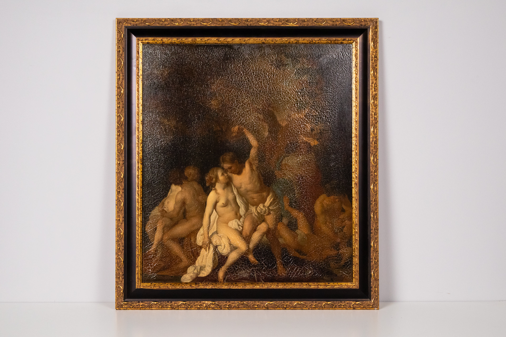 Barokk stílusú akt festmény, amely mitológiai jelenetet ábrázol, öt meztelen alakot mutatva, akik különböző pozíciókban ülnek és állnak. A festmény sötét háttérrel rendelkezik, amely kiemeli a figurák lágy kontúrjait...