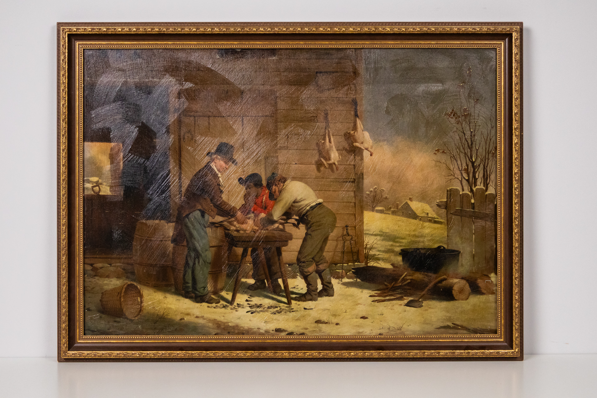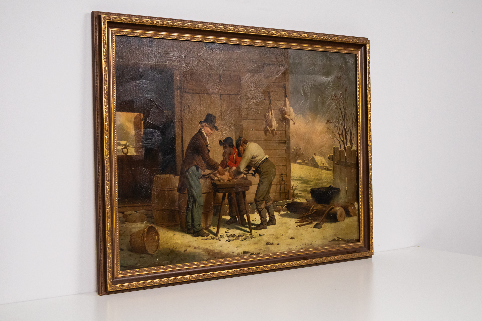 Realista stílusú festmény, amely három férfit ábrázol, akik egy fából készült asztalnál dolgoznak, valószínűleg húsfeldolgozással foglalkoznak. A háttérben egy vidéki táj látható, ahol fák és házak találhatók. A...