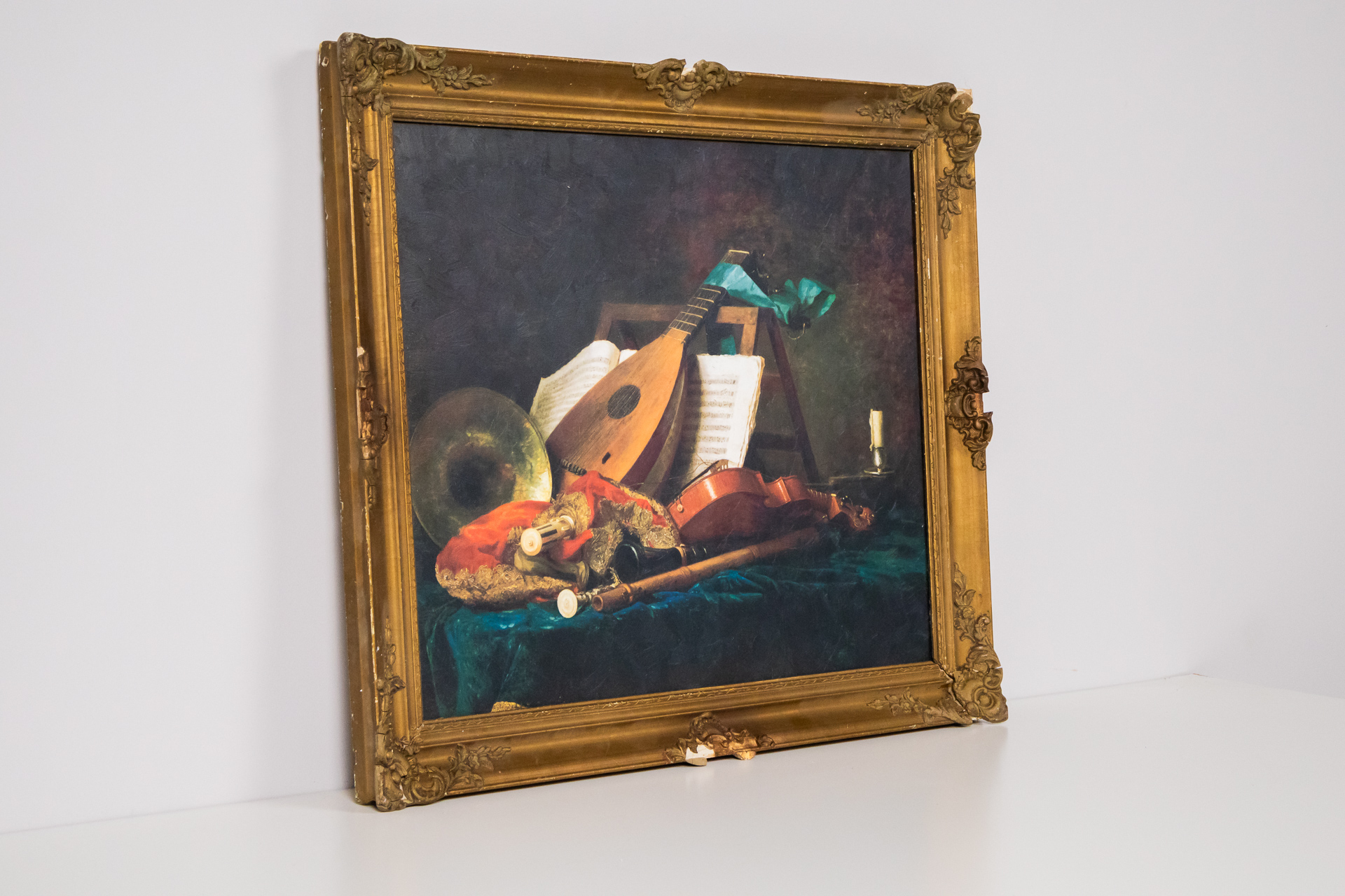 Csendélet, amely különböző hangszereket ábrázol, mint például hegedű, lúd, és fúvós hangszerek, egy zöld szöveten elhelyezve. A háttér sötét, gazdag színekben játszik, a világítás pedig kiemeli a hangszerek...