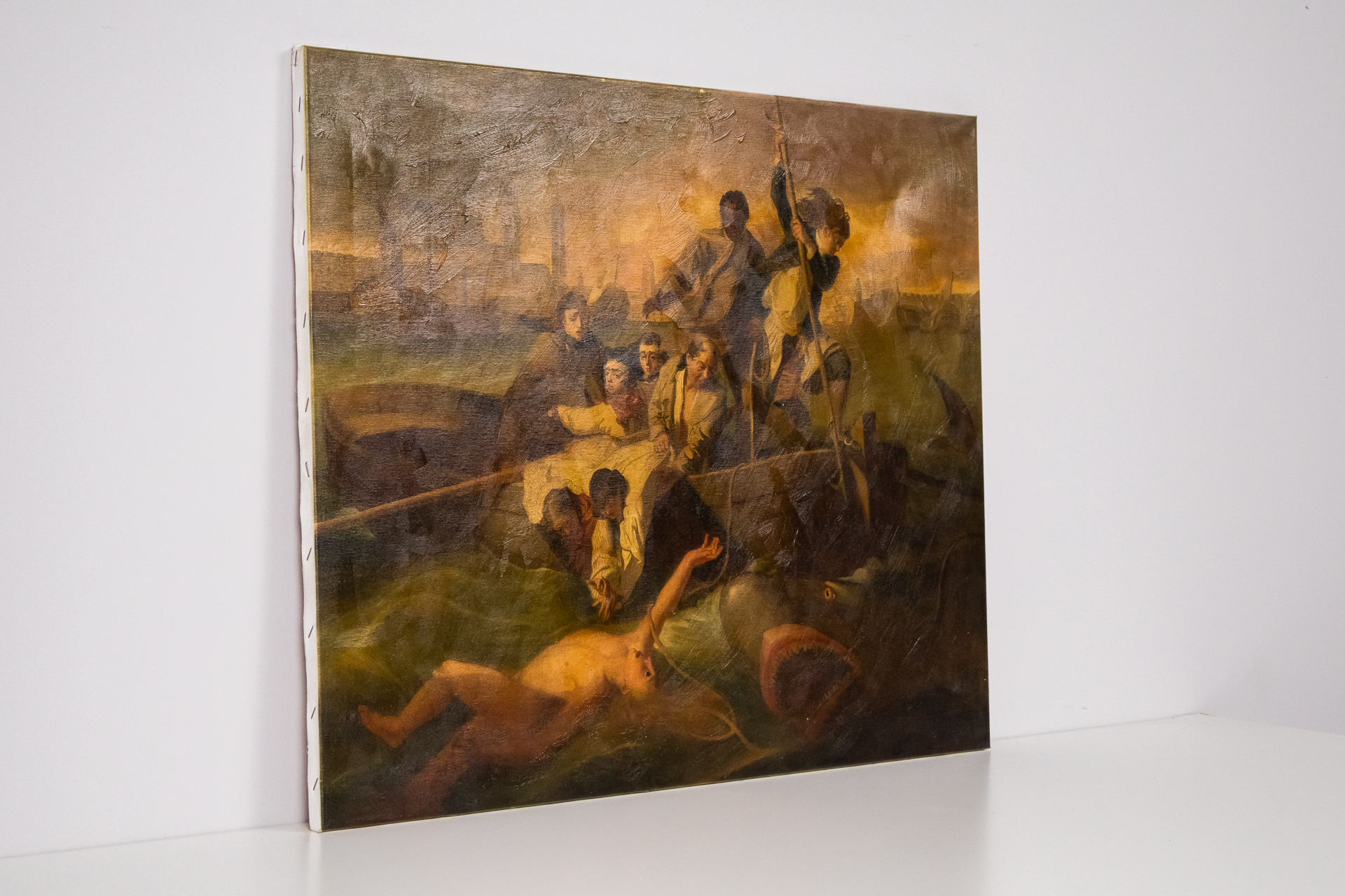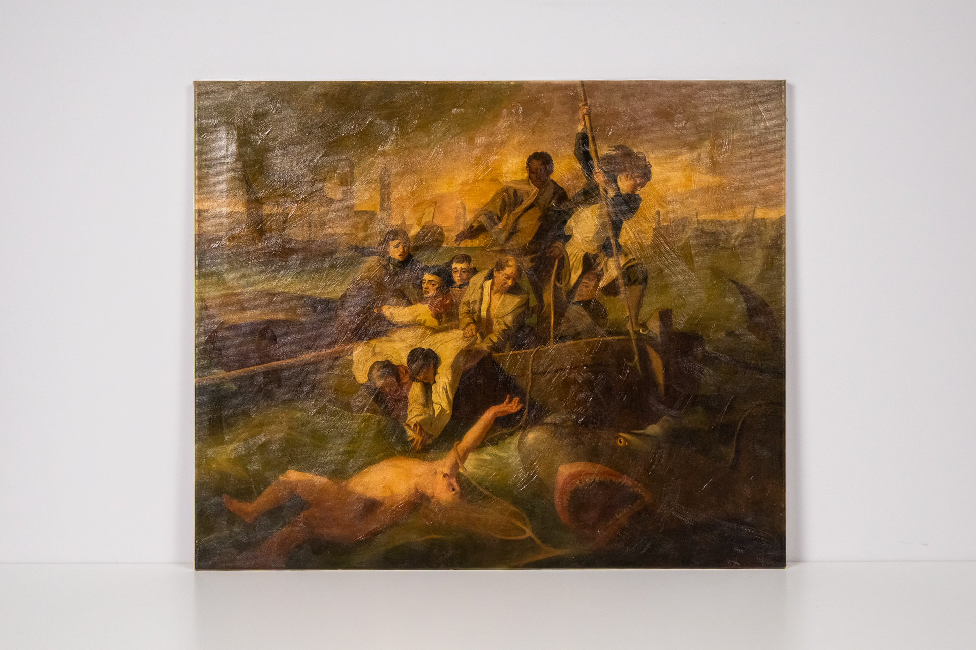 A festmény egy drámai tengeri csatát ábrázol, ahol a hajón álló emberek küzdenek a vízben úszó cápákkal. A háttérben sötét felhők és viharos tenger látható, a színek dominálják a sötétzöld, barna és sárgás...