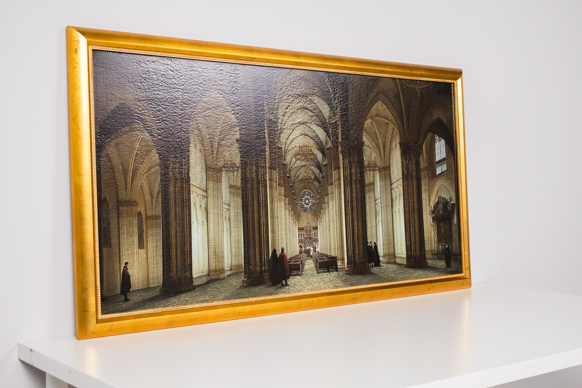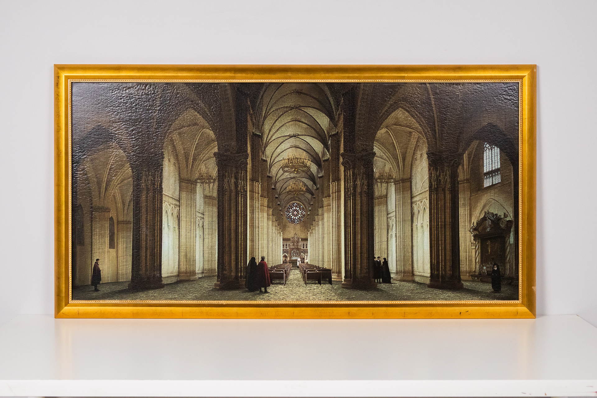 A kép egy gótikus templom belső terét ábrázolja, magas íves boltozatokkal és részletes oszlopokkal. A kompozícióban emberek láthatók, akik a templomban tartózkodnak, a fény a nagy ablakokon keresztül árad be,...