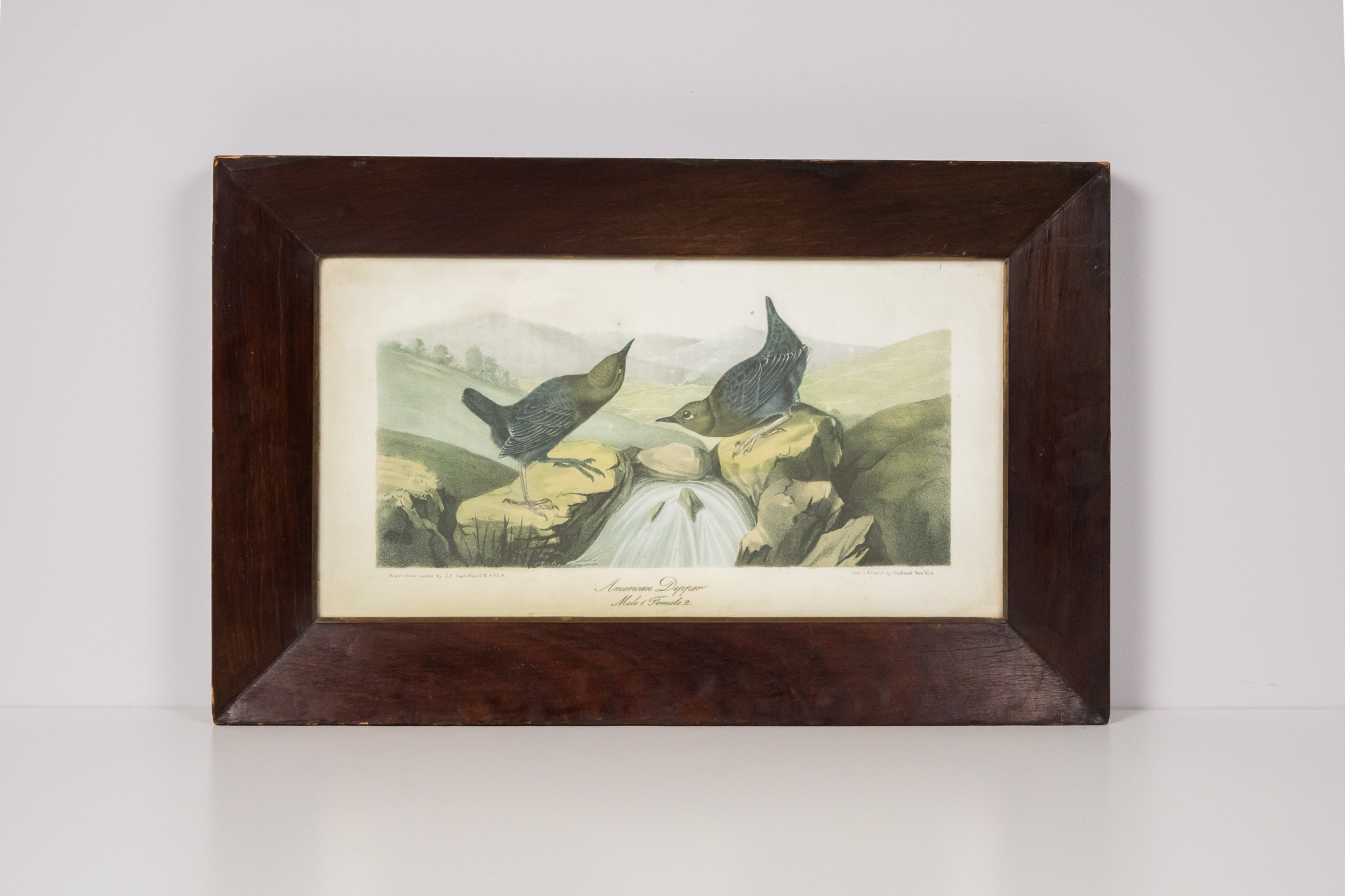 A kép egy vízesés mellett álló madarakat ábrázol, részletesen kidolgozott, színes litográfiával készült. A háttérben dombos táj látható, lágy zöld és kék árnyalatokkal. A madarak természetes élőhelyükön, sziklákon...