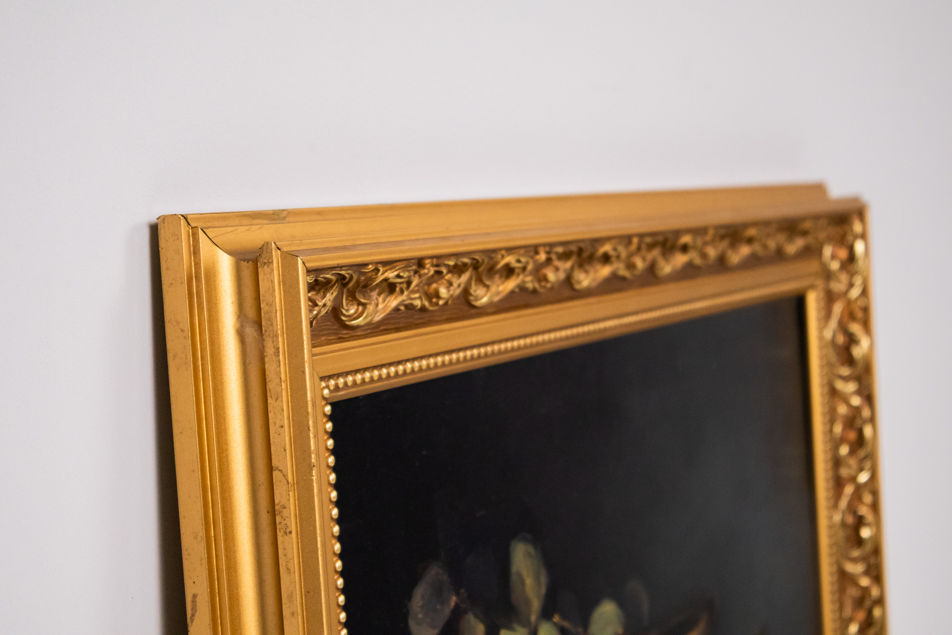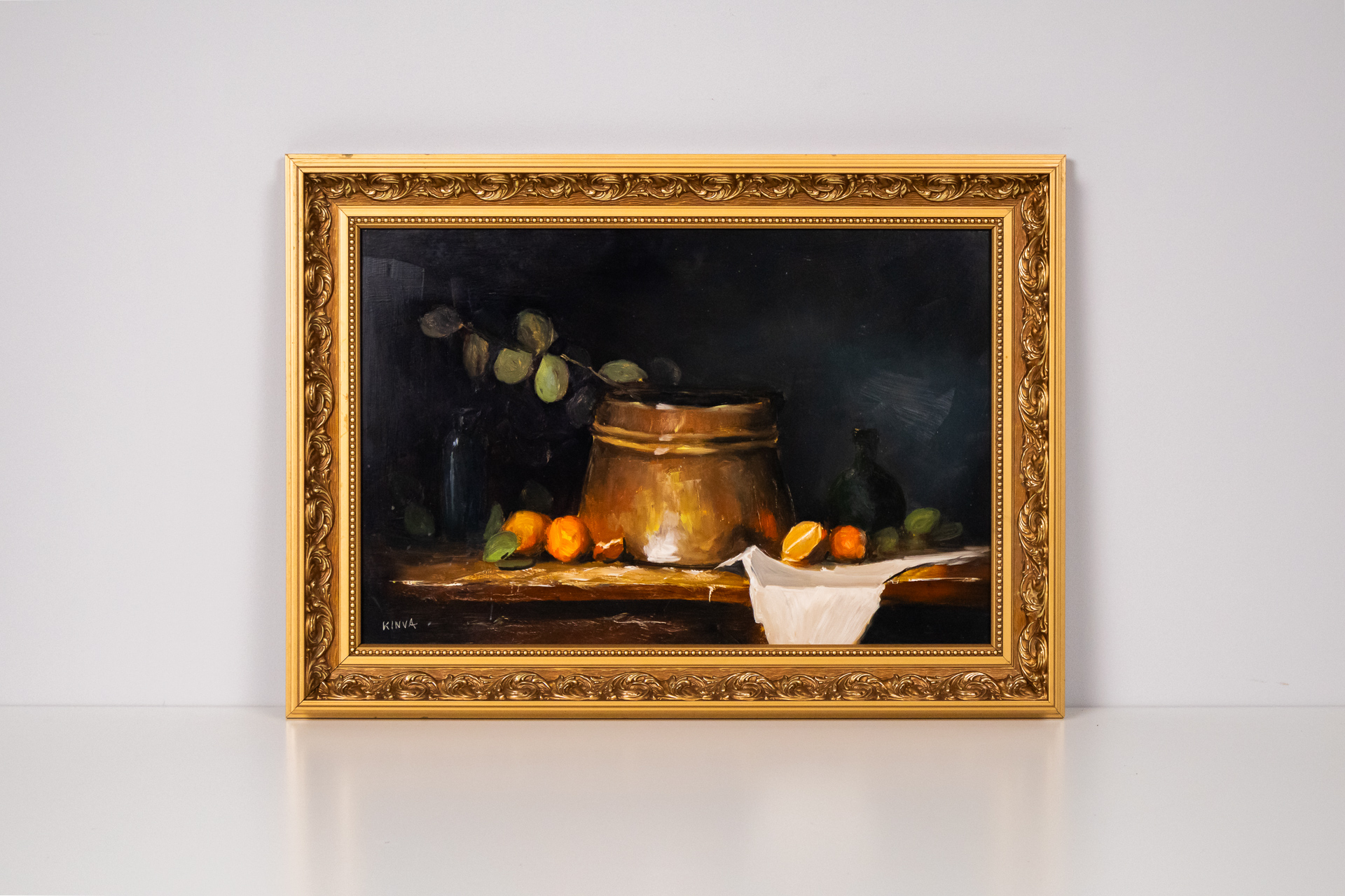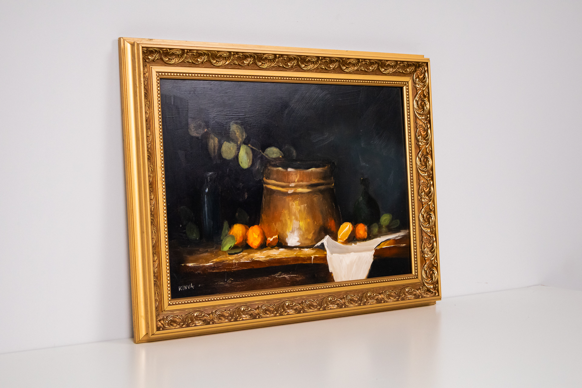 Csendélet, amely egy barna edényt, citrusféléket és egy üveg palackot ábrázol sötét háttér előtt. Az olajfestmény gazdag színvilága és lágy ecsetvonásai hangsúlyozzák a gyümölcsök textúráját és a fény-árnyék játékát....