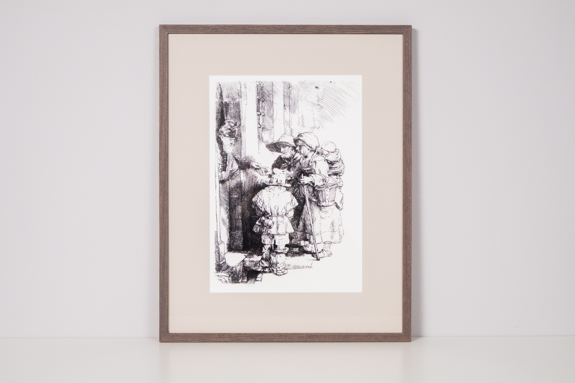 A kép egy fekete-fehér grafikát ábrázol, amelyen gyermekek és felnőttek csoportja látható, amint egy ajtóhoz közel állnak. A részletes vonalrajz és árnyékolás a karakterek érzelmeit és interakcióját hangsúlyozza. A...