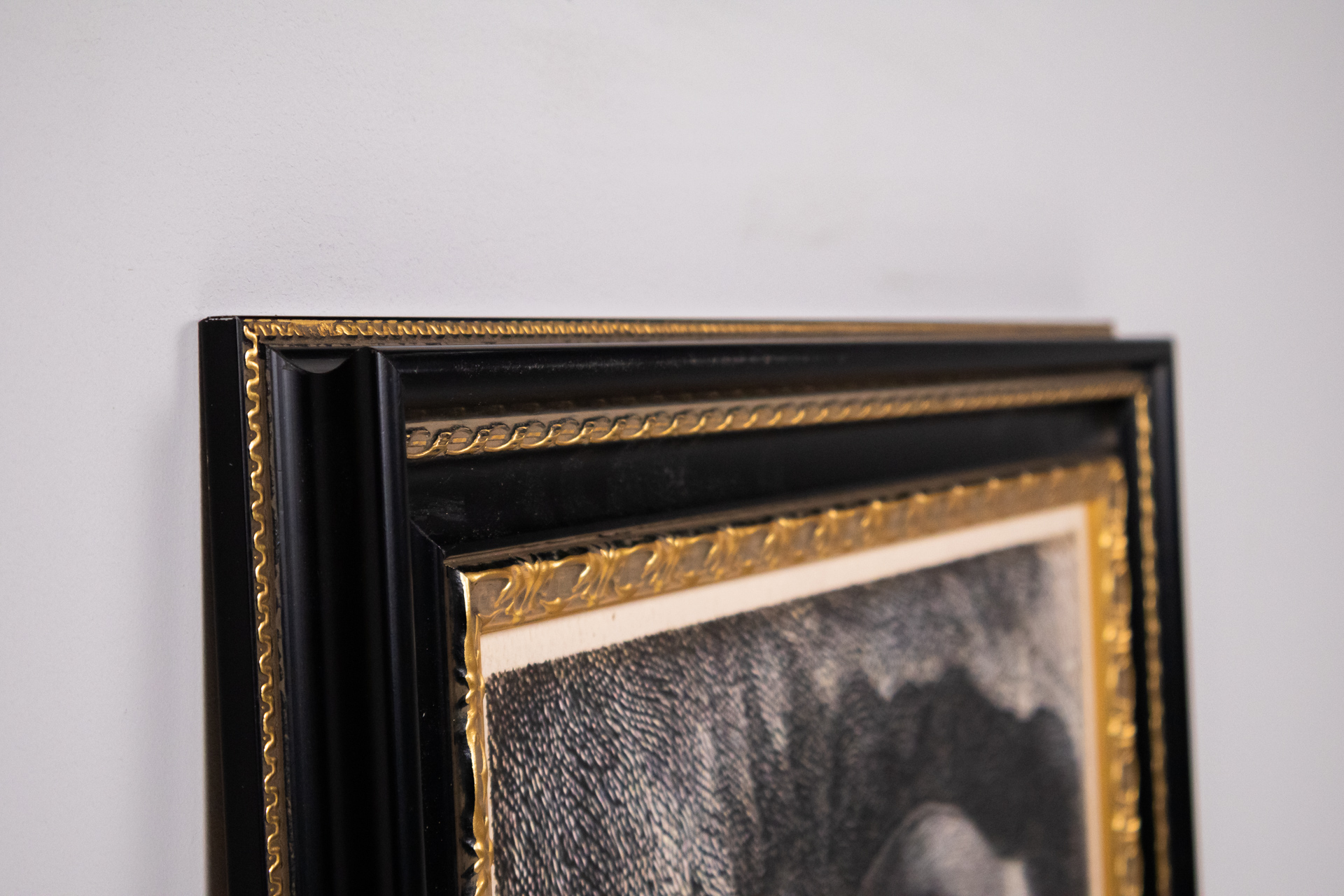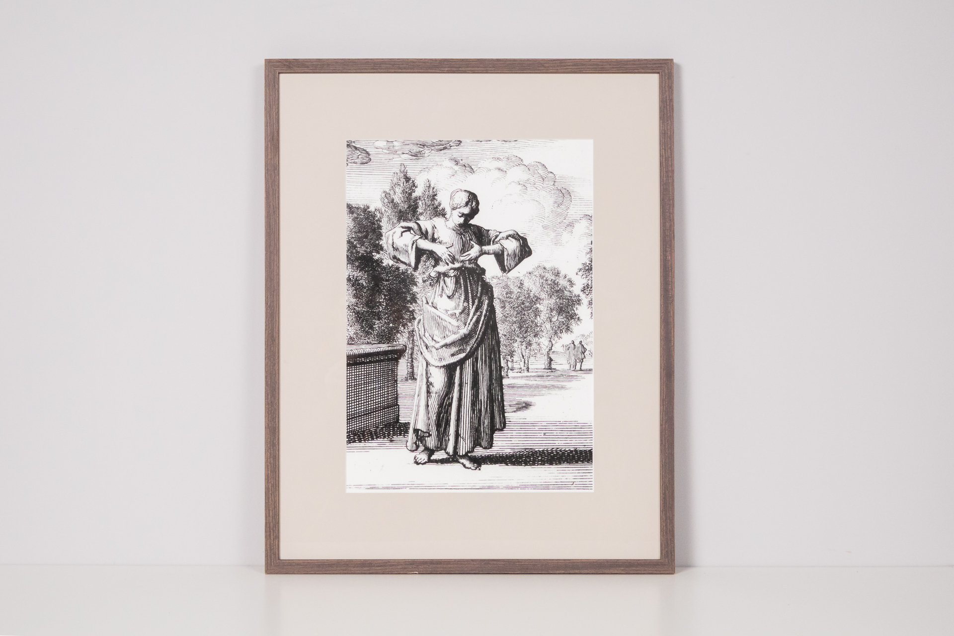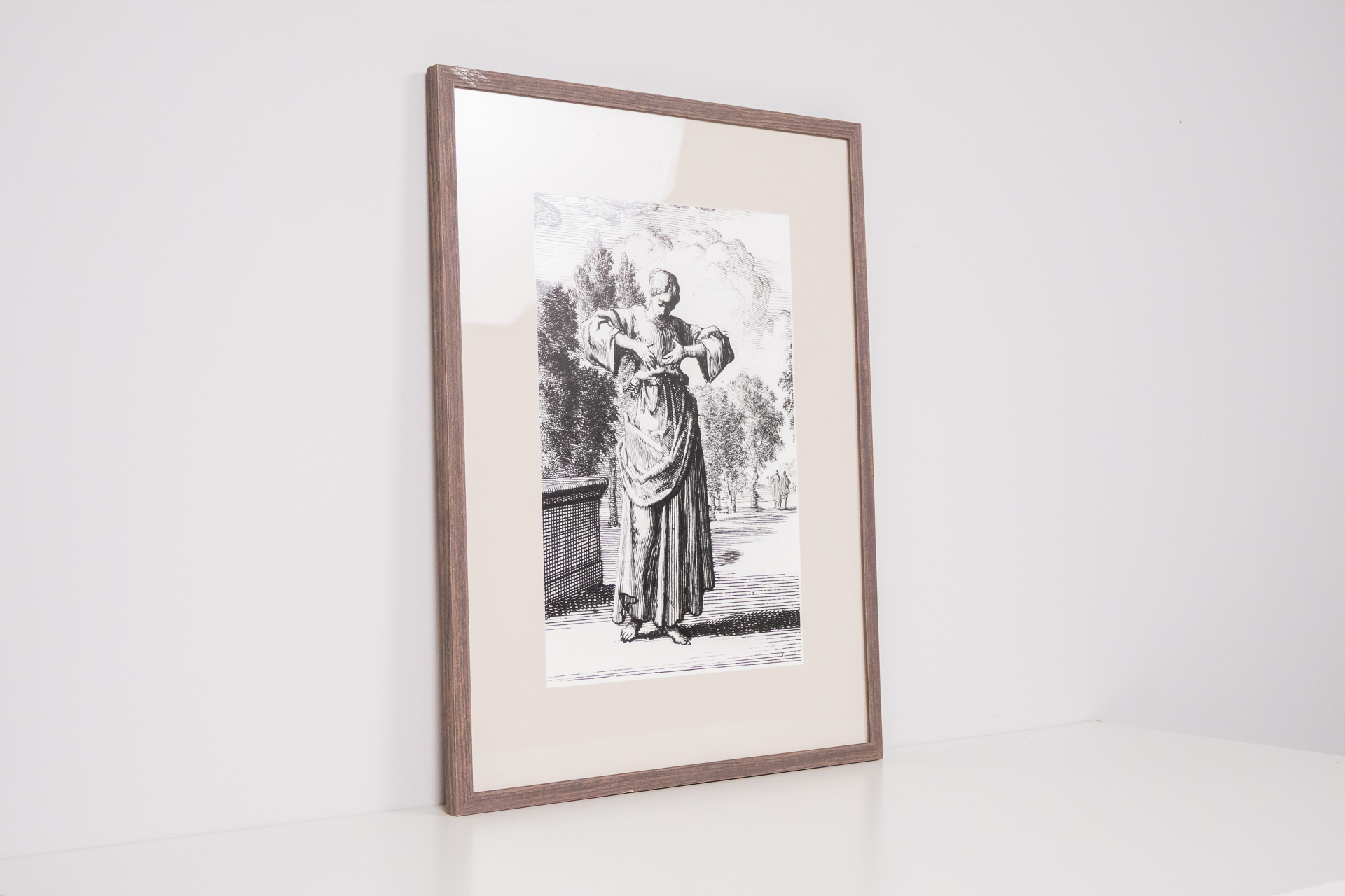 A kép egy női figurát ábrázol, aki elegáns ruhában áll, háttérben fákkal és egy tájjal. A grafika vonalrajz technikával készült, fekete-fehér színvilágban, részletes árnyékolással. A keret világosbarna fa, modern...