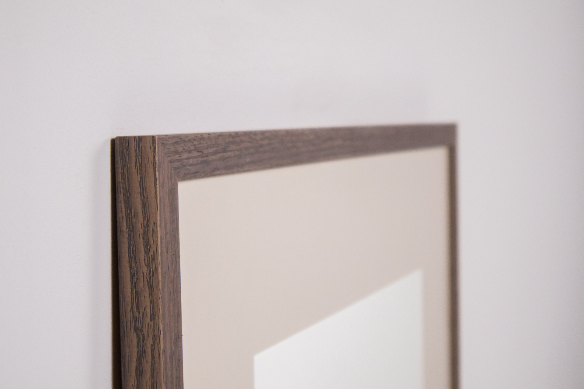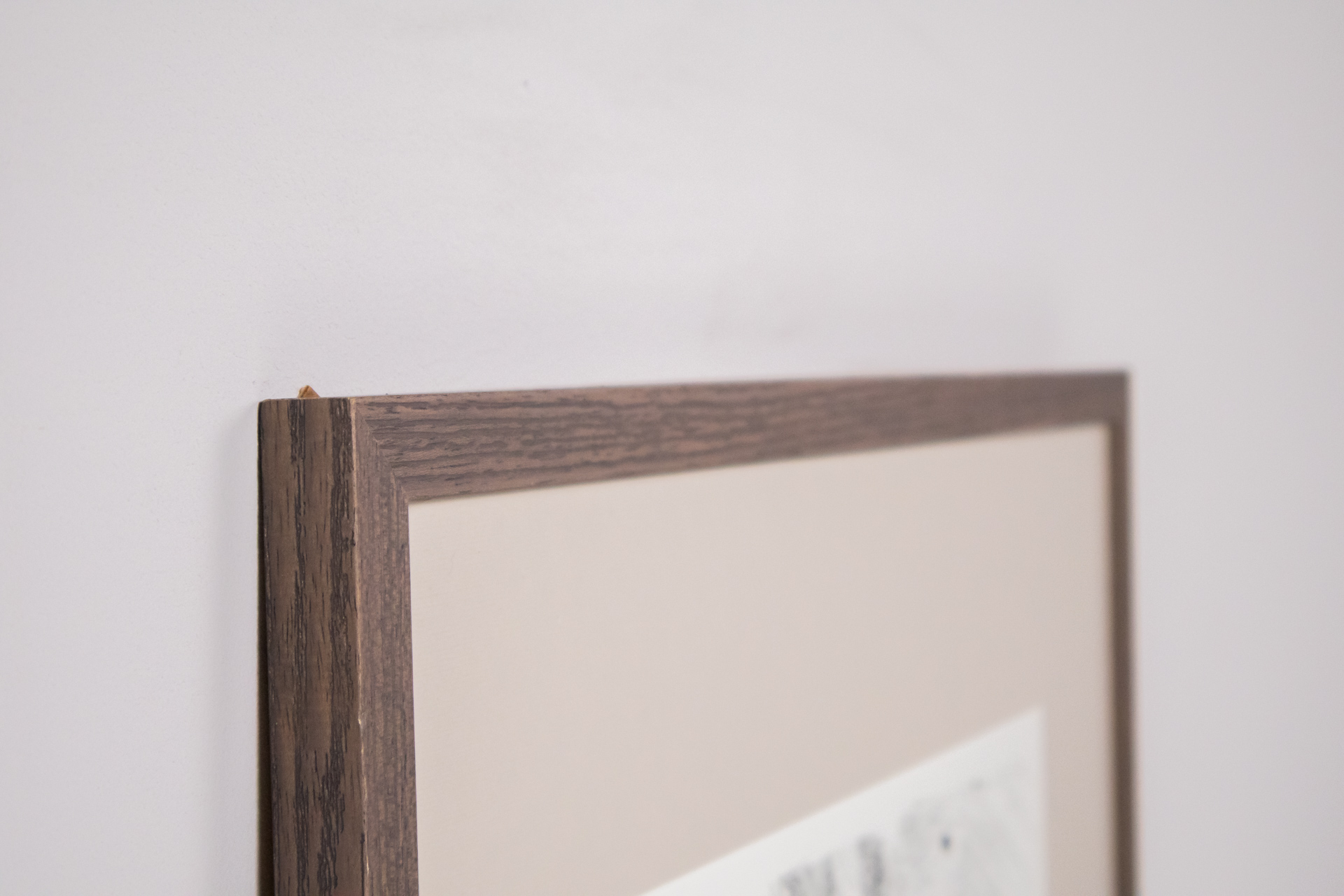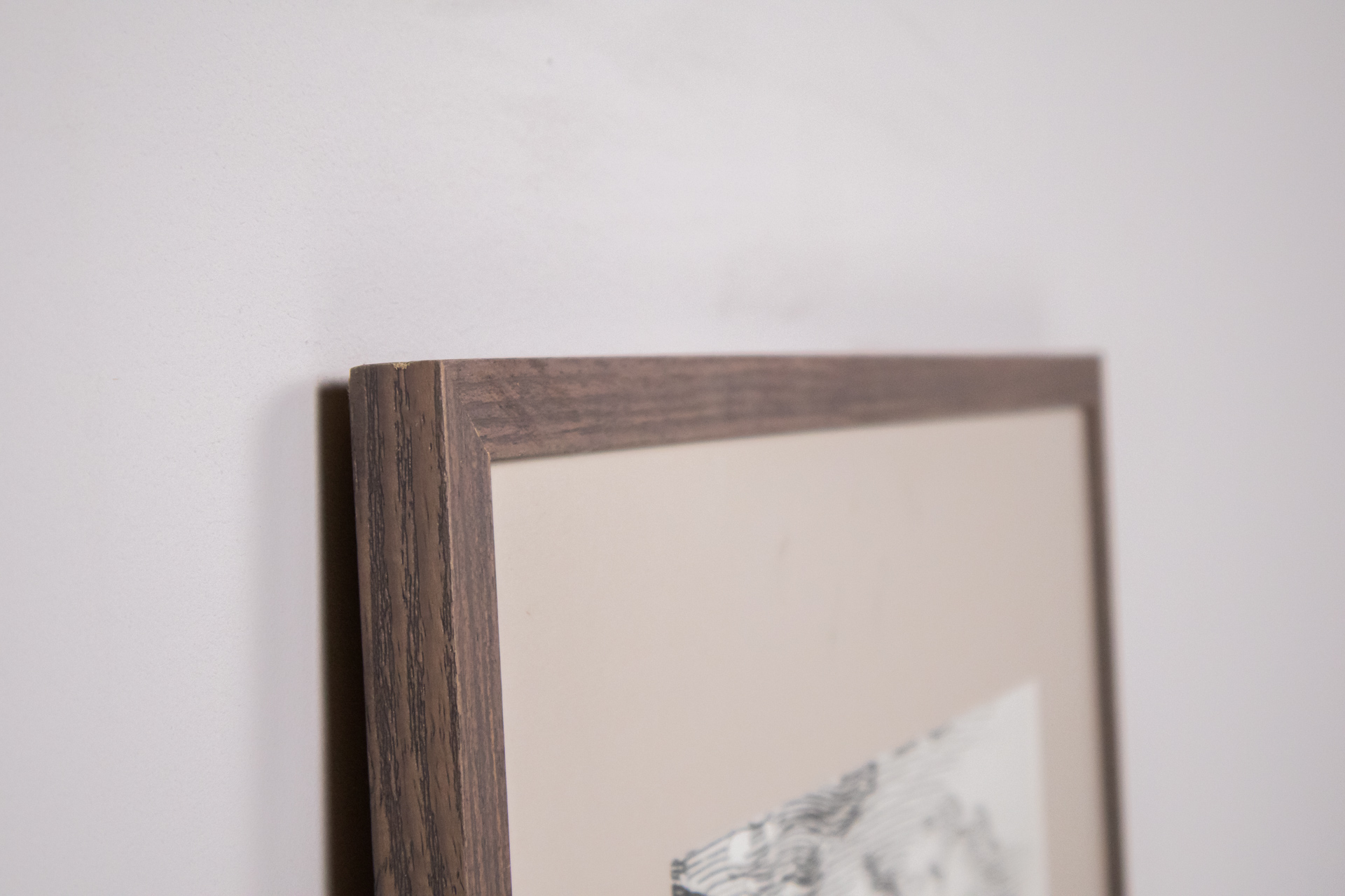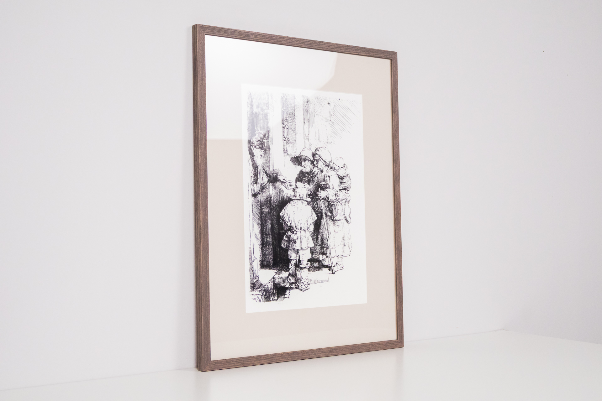 A kép egy női figurát ábrázol, aki elegáns ruhában áll, háttérben fákkal és egy tájjal. A grafika vonalrajz technikával készült, fekete-fehér színvilágban, részletes árnyékolással. A keret világosbarna fa, modern...