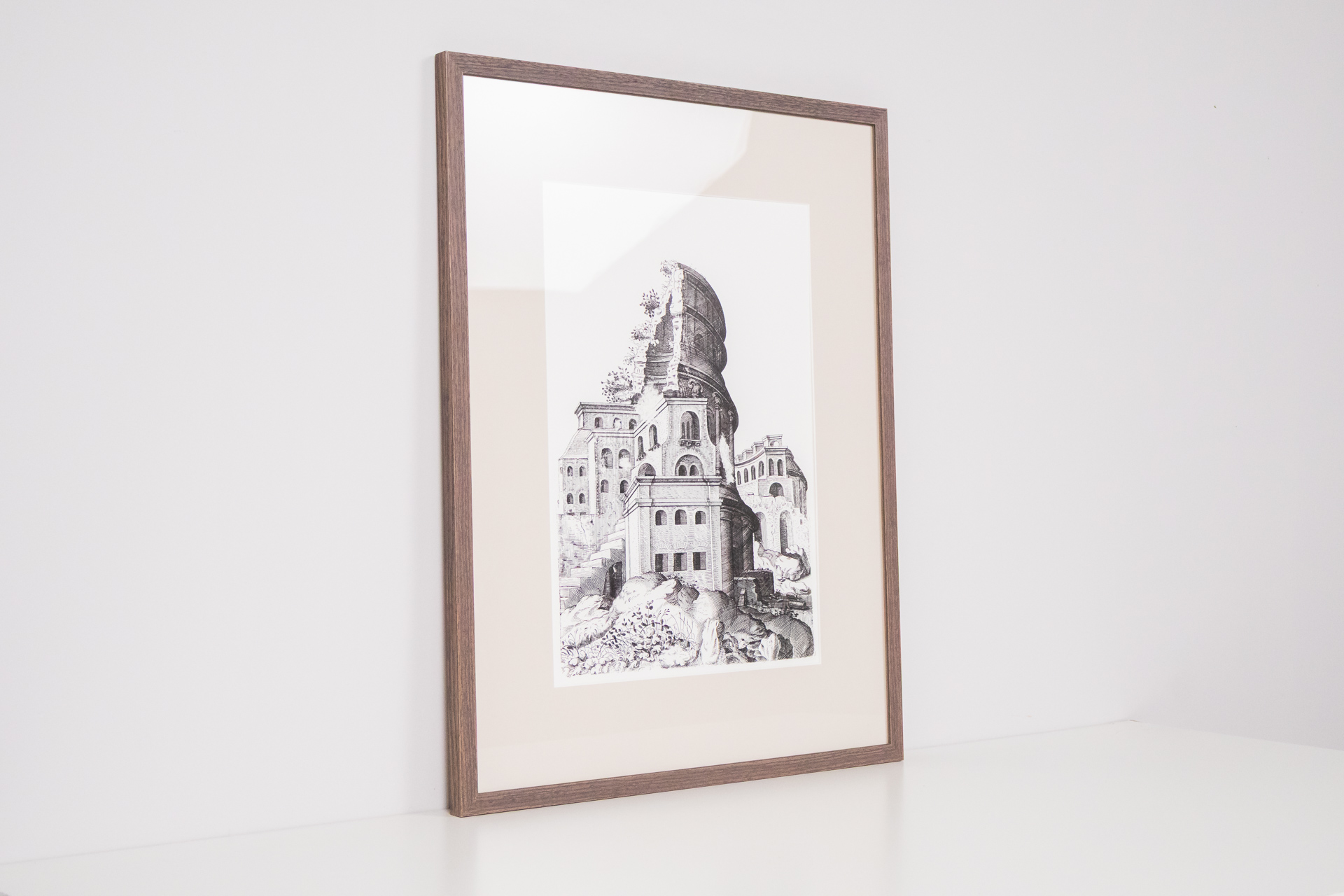 A kép egy romantikus stílusú építészeti tájat ábrázol, részletes vonalakkal és árnyékolással, amely egy romos épületet és annak környezetét mutatja be. A kompozíció a szürke és fekete árnyalatok dominálásával,...