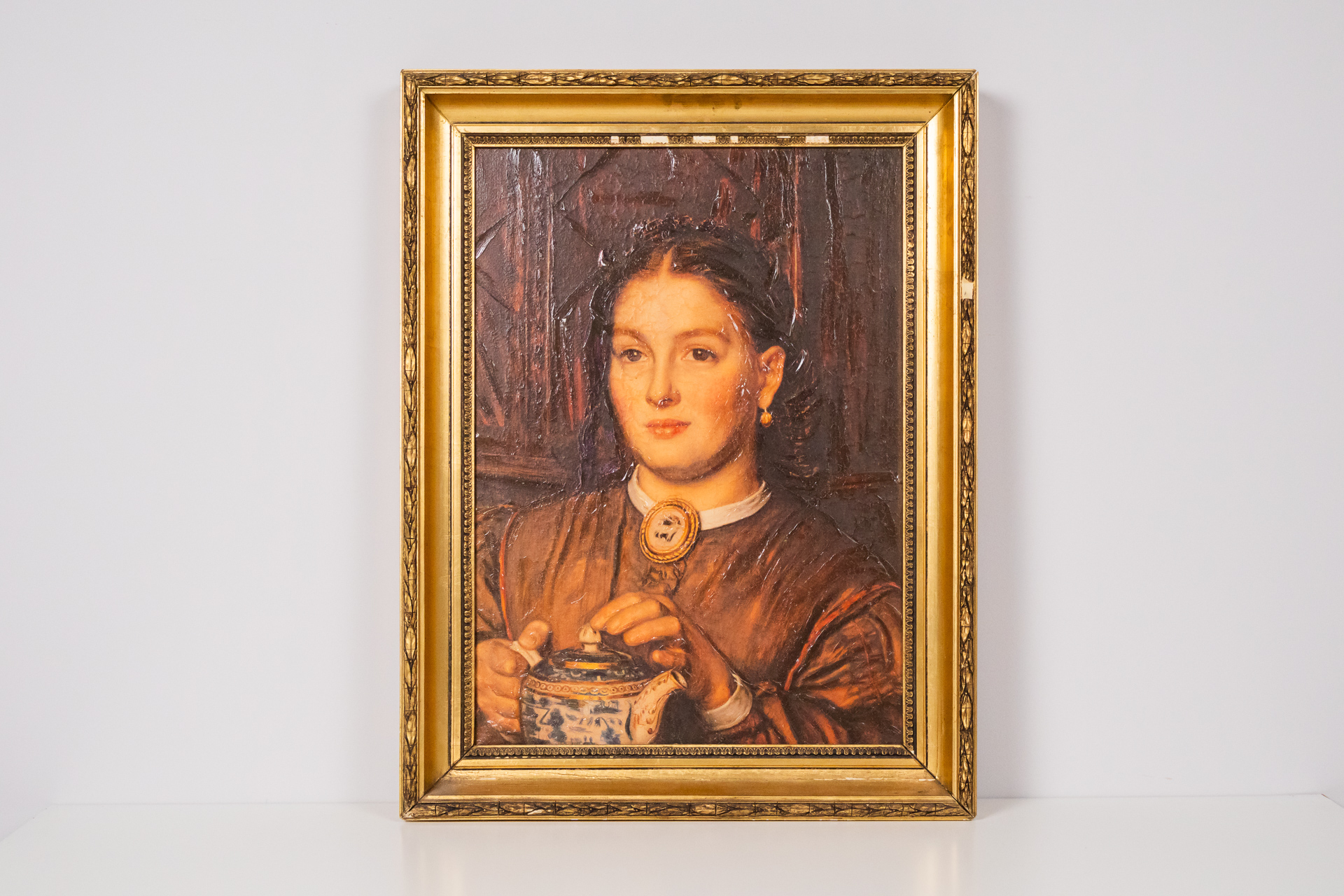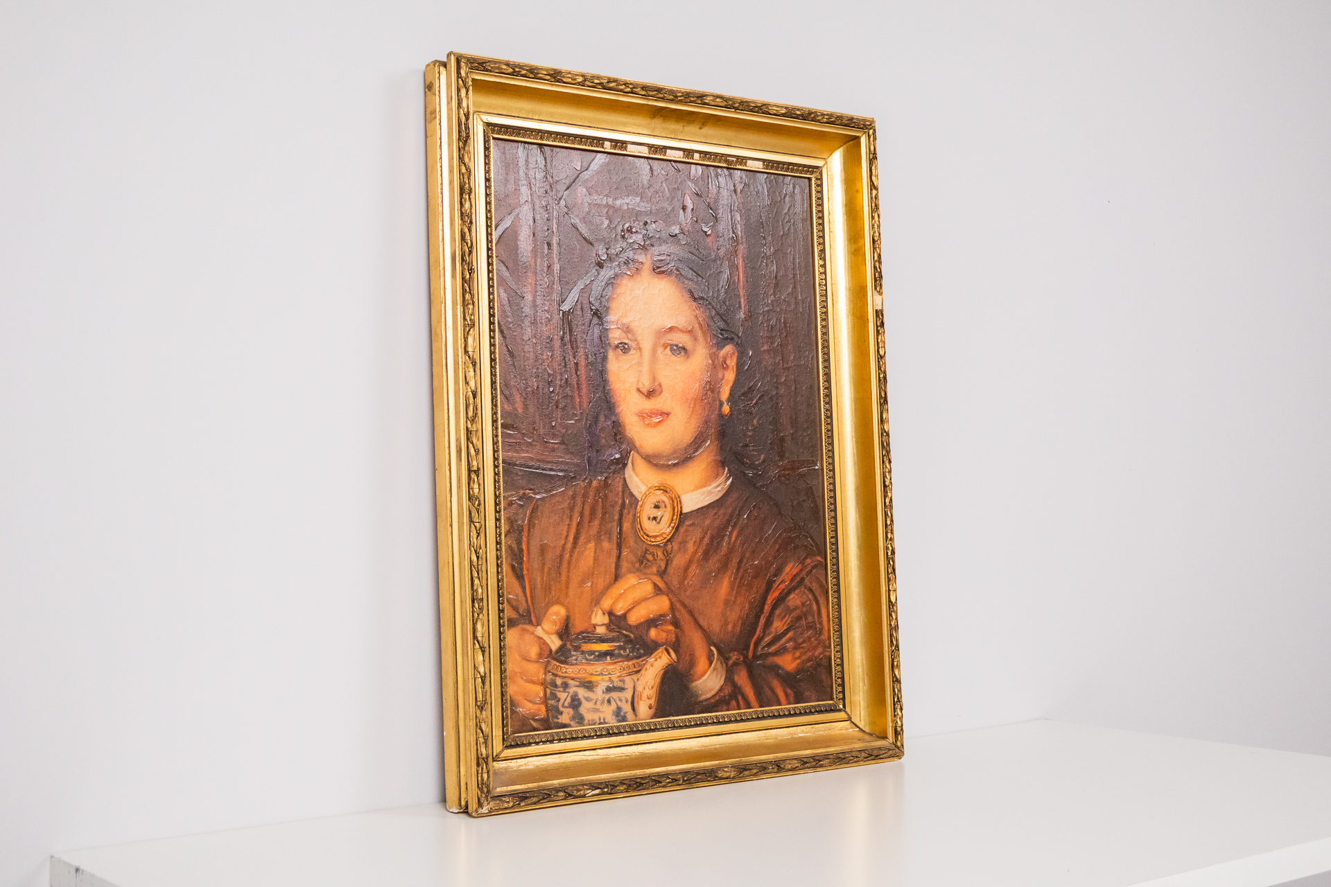 A kép egy fiatal nőt ábrázol, aki egy teáscsészét tart a kezében. A háttér sötét és texturált, míg a nő arca világosabb, részletes kidolgozással. A festmény olajjal készült, a színek meleg tónusúak, dominál a barna...