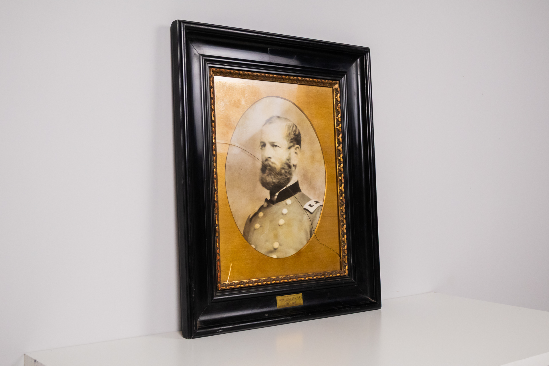 A kép egy férfi portréját ábrázolja, aki katonai egyenruhát visel. A fotó technikával készült, a háttér sárgás árnyalatú, a figura részletesen kidolgozott, a kép tónusai lágyak és sepia hatásúak. A keret fekete, sima...