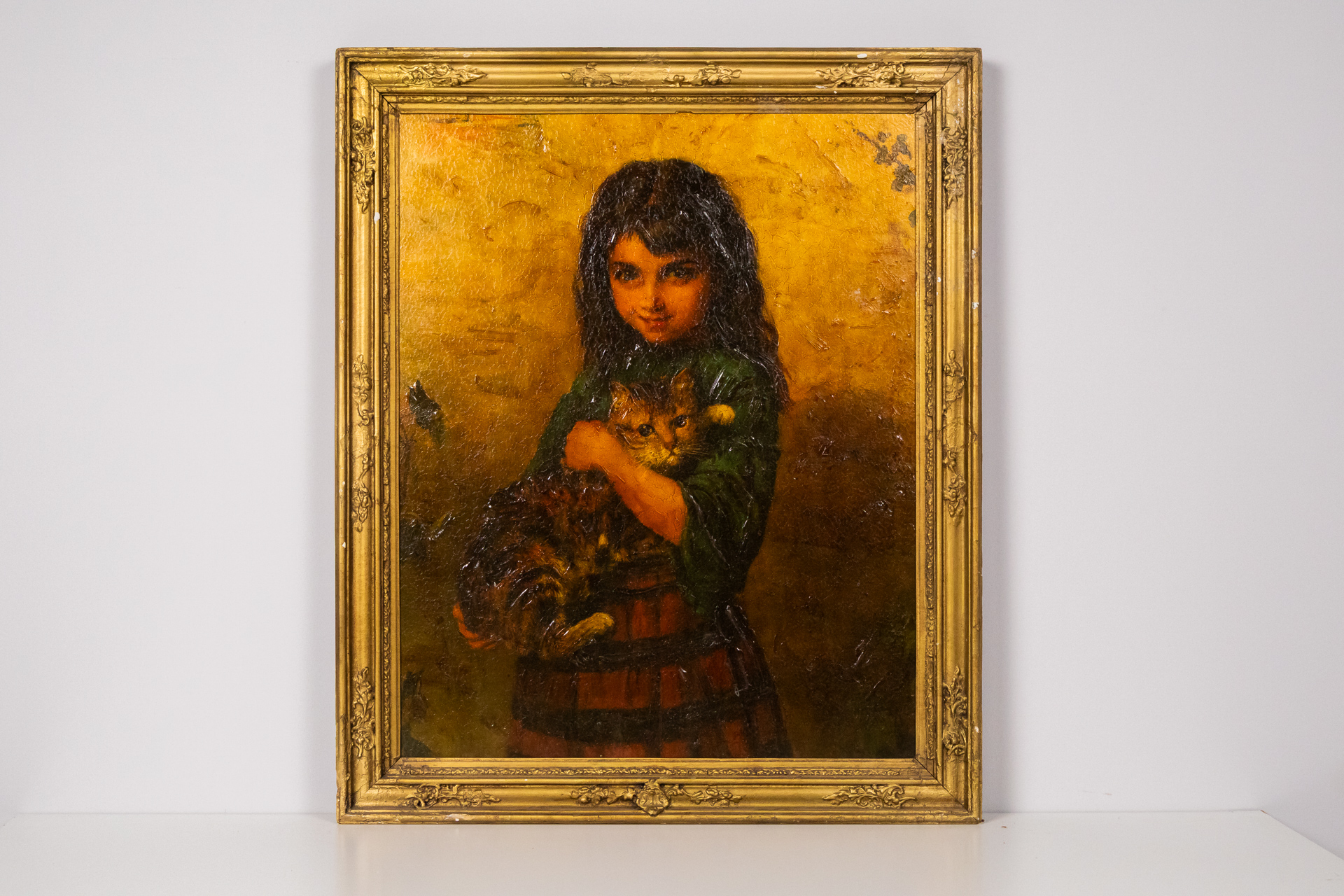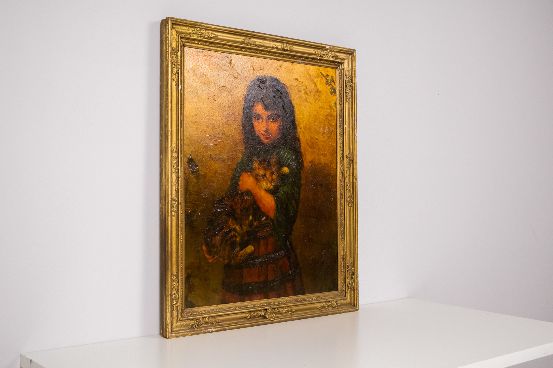 A festmény egy fiatal lányt ábrázol, aki ölelésében tart egy macskát. A háttér meleg, aranysárga árnyalatú, amely kiemeli a figura részleteit. A lány zöld ruhát visel, és a kompozíció lágy, impressionista...