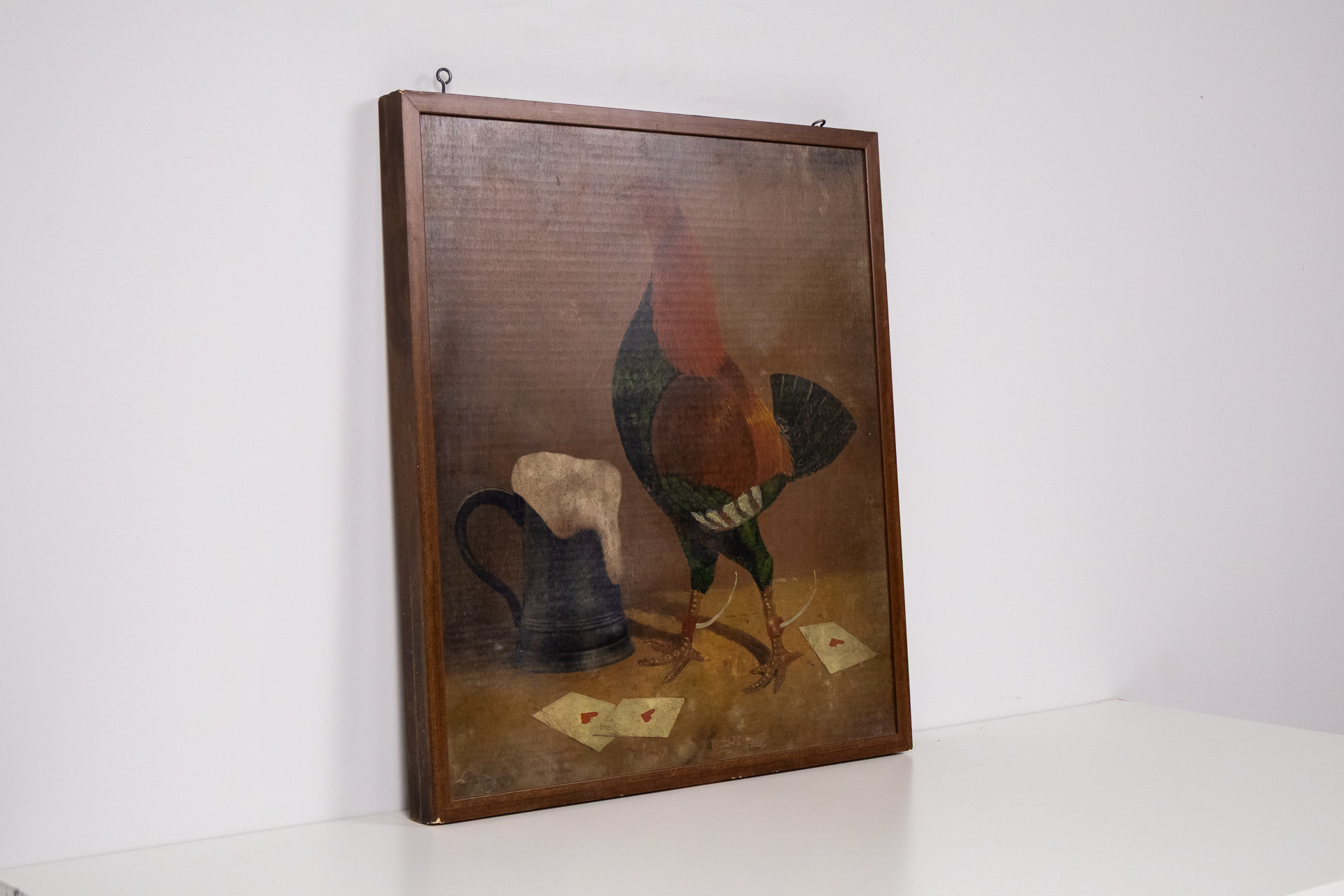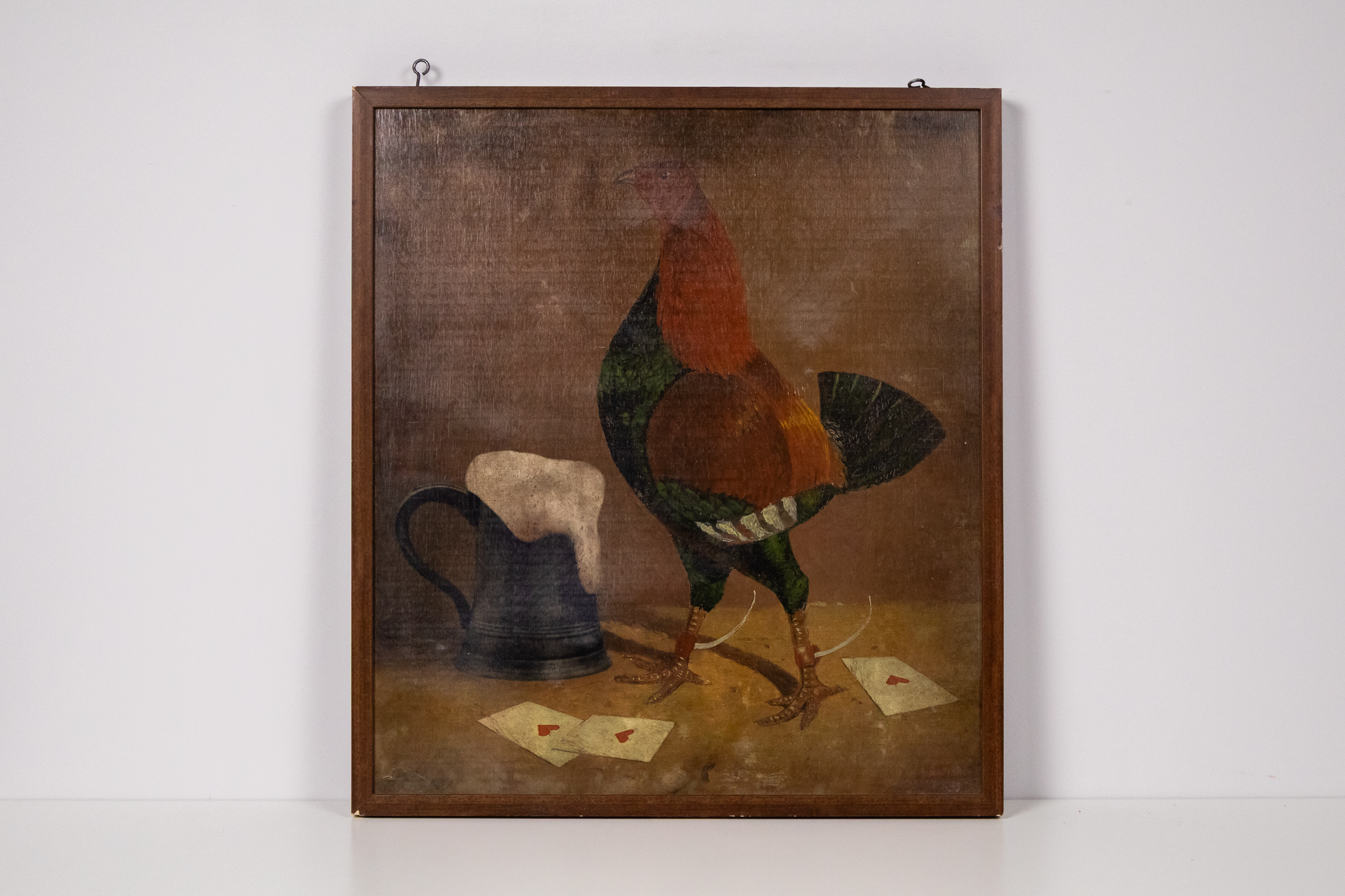A kép egy kakast ábrázol, amely egy korsó sör mellett áll, a háttérben kártyák láthatók. A festmény technikája olaj, vásznon készült, a színek melegek, dominál a barna, zöld és vörös árnyalat. A kakas részletesen...