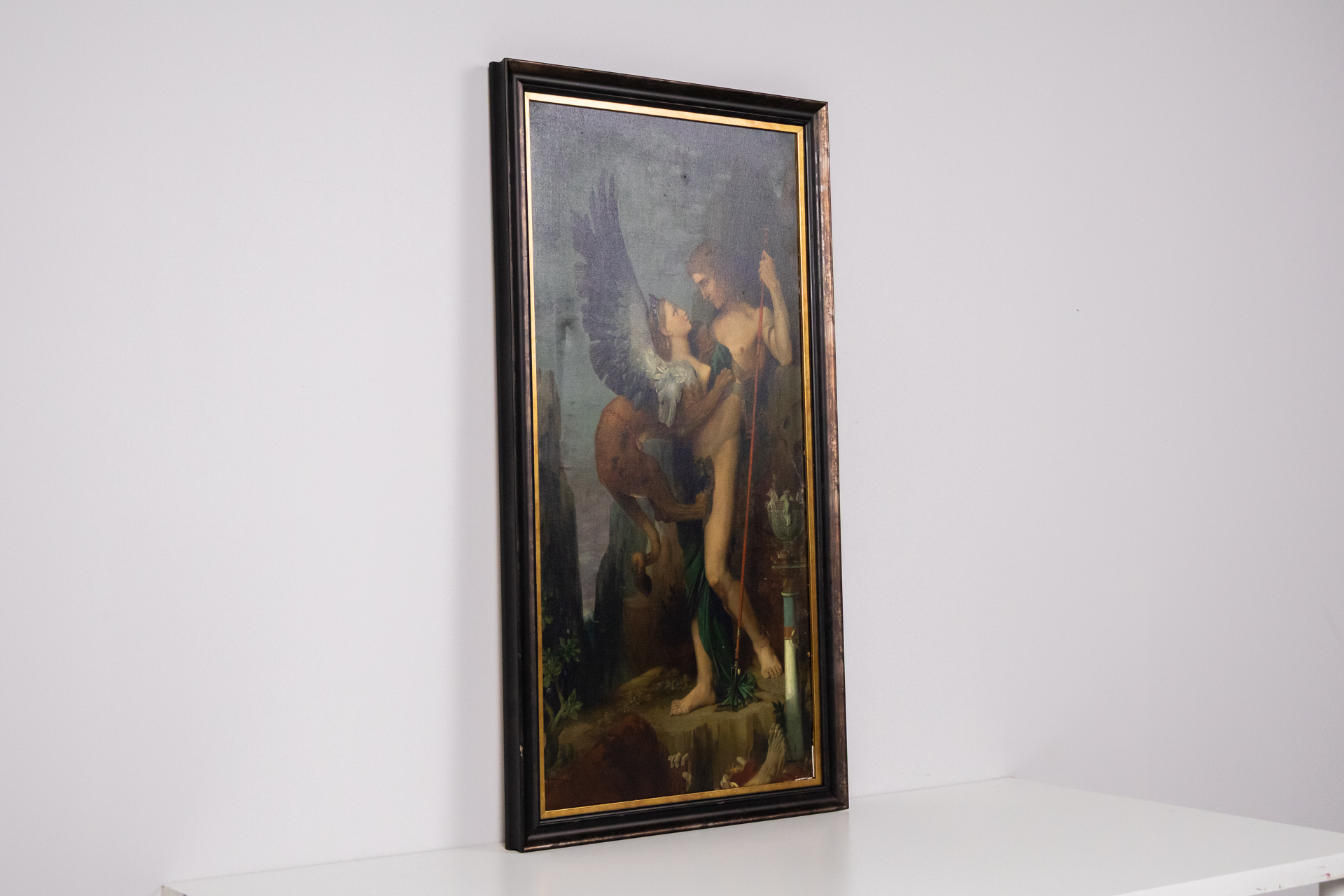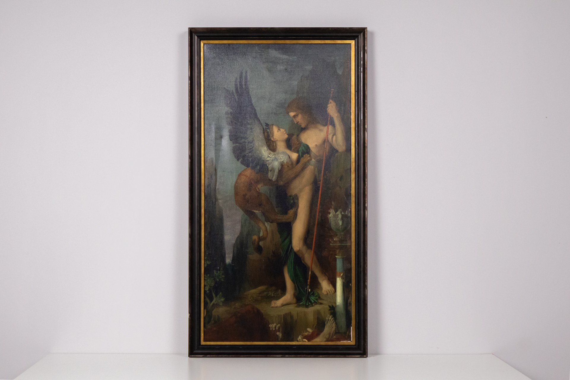 A festmény egy mitológiai jelenetet ábrázol, ahol egy nőalak hatalmas hattyút tart a karjaiban, míg egy kisfiú figyeli őt. A háttér sötét, sejtelmes, a nőalak színes ruházata élénk árnyalatokban pompázik. Az...