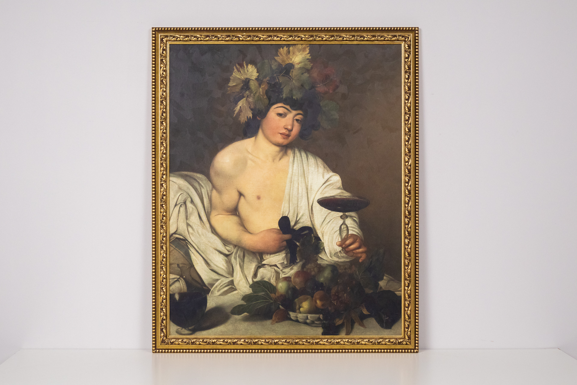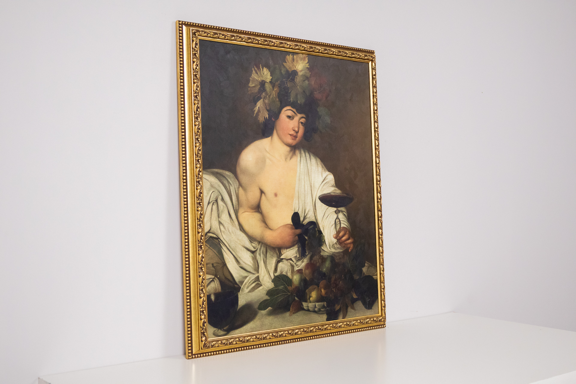 A festmény Bacchust, a bor és a szőlő istenét ábrázolja, aki egy gyümölcsökkel teli asztal mellett ül. A figura félmeztelen, fehér drapériát visel, és szőlőlevelekből készült koszorú díszíti a fejét. A háttér sötét,...