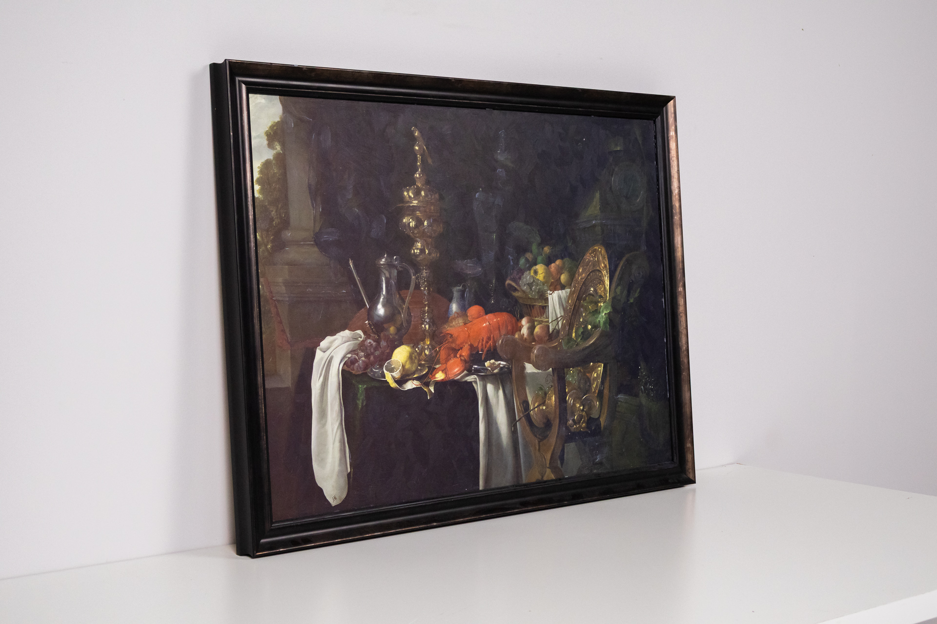Barokk stílusú csendélet, gazdag színvilággal és részletes kidolgozással. Az asztalon gyümölcsök, zöldségek és fémből készült edények találhatók, a kompozíció meleg színekkel és árnyékokkal játszik. Az összhatás...