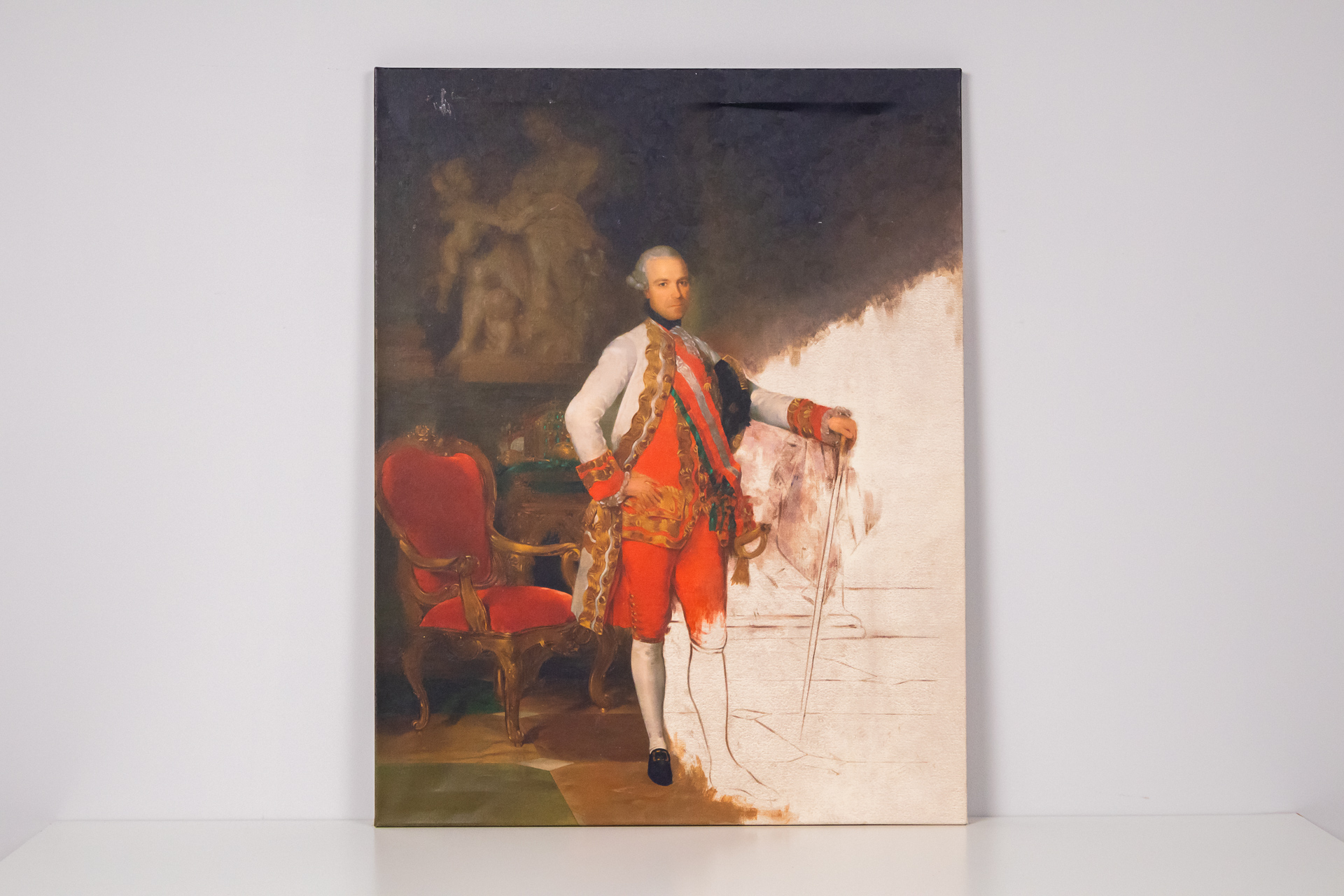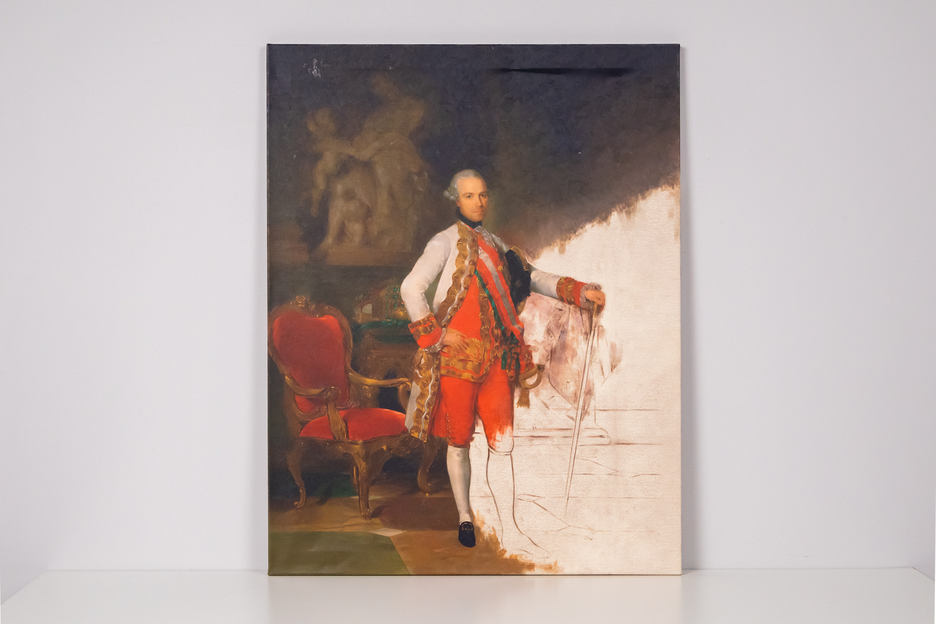 A festmény egy férfi portréját ábrázolja, aki díszes ruhában áll, kezében egy fehér botot tartva. A háttérben látható egy piros bársonyszék és szobrászati elemek, amelyek a gazdagságot és a hatalmat sugallják. A...