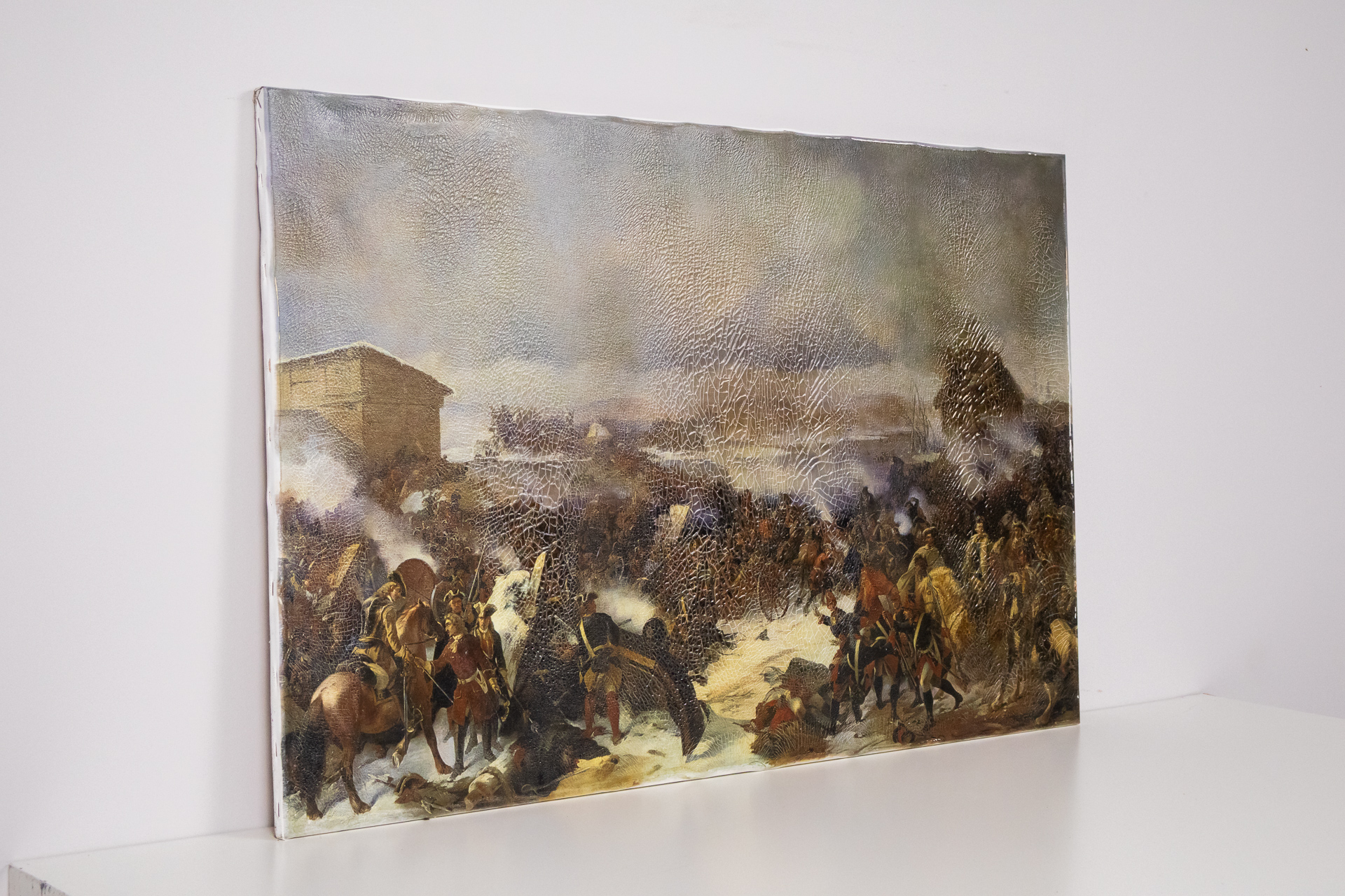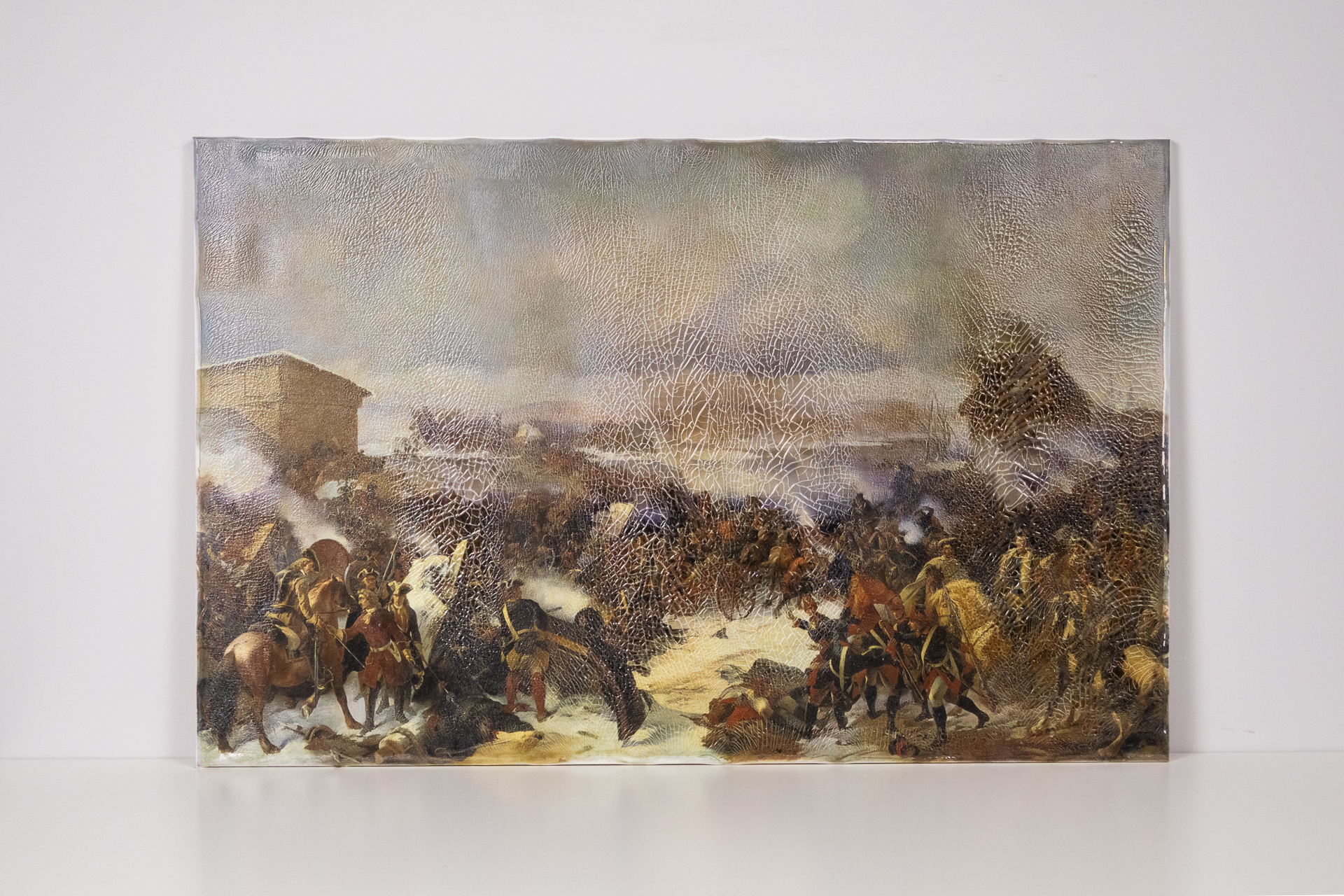 A festmény egy történelmi csata jelenetét ábrázolja, ahol lovas katonák és gyalogosok harcolnak egymással. A háttérben egy épület látható, amely a csata helyszínét jelzi. A festmény részletes ecsetvonásokkal készült,...