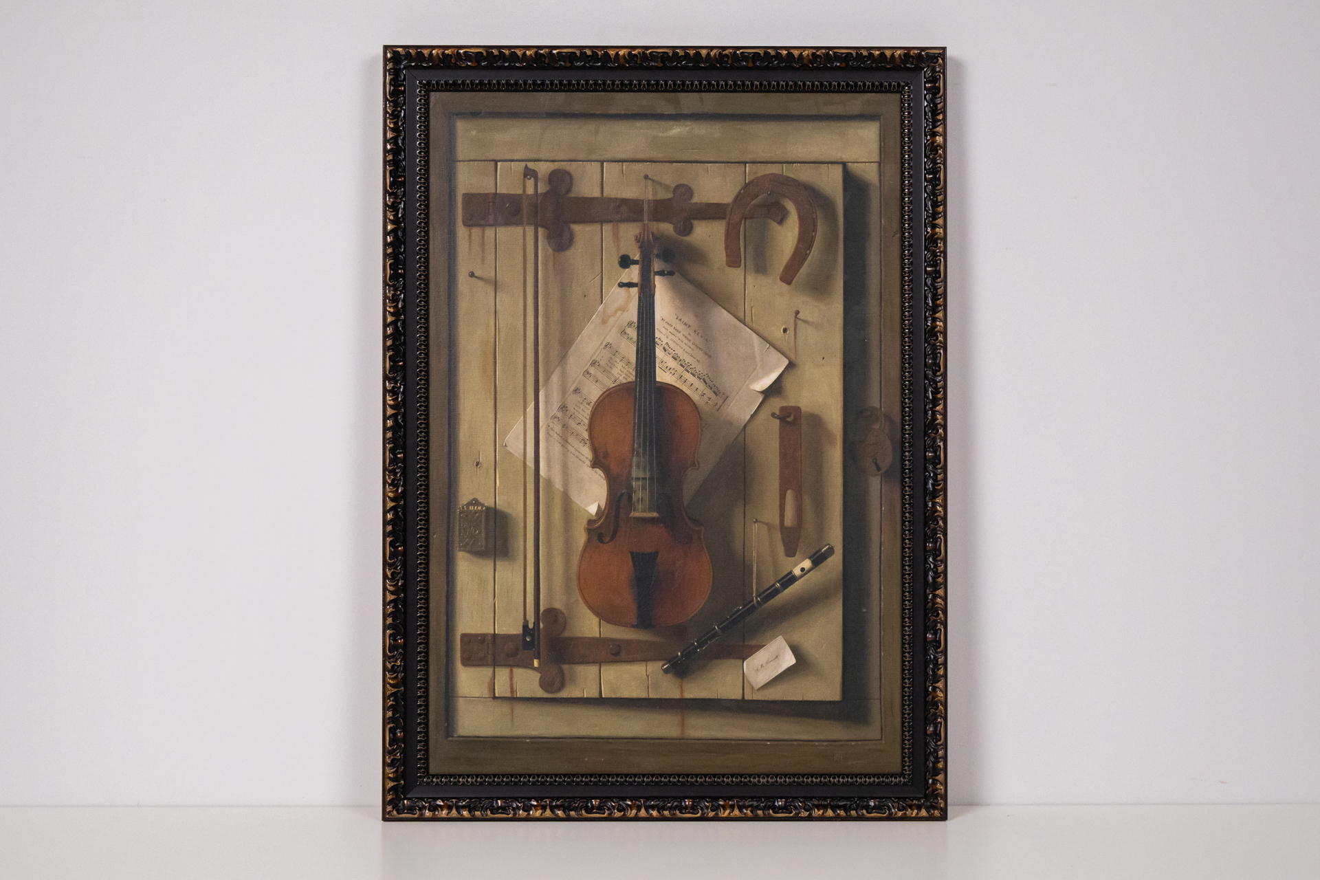 Realista stílusú csendélet, amely egy hegedűt és különféle hangszerkészítő eszközöket ábrázol. A háttérben világos, fából készült fal látható, amelyen a hangszer és a kiegészítők elhelyezkednek. A kompozíció gazdag...