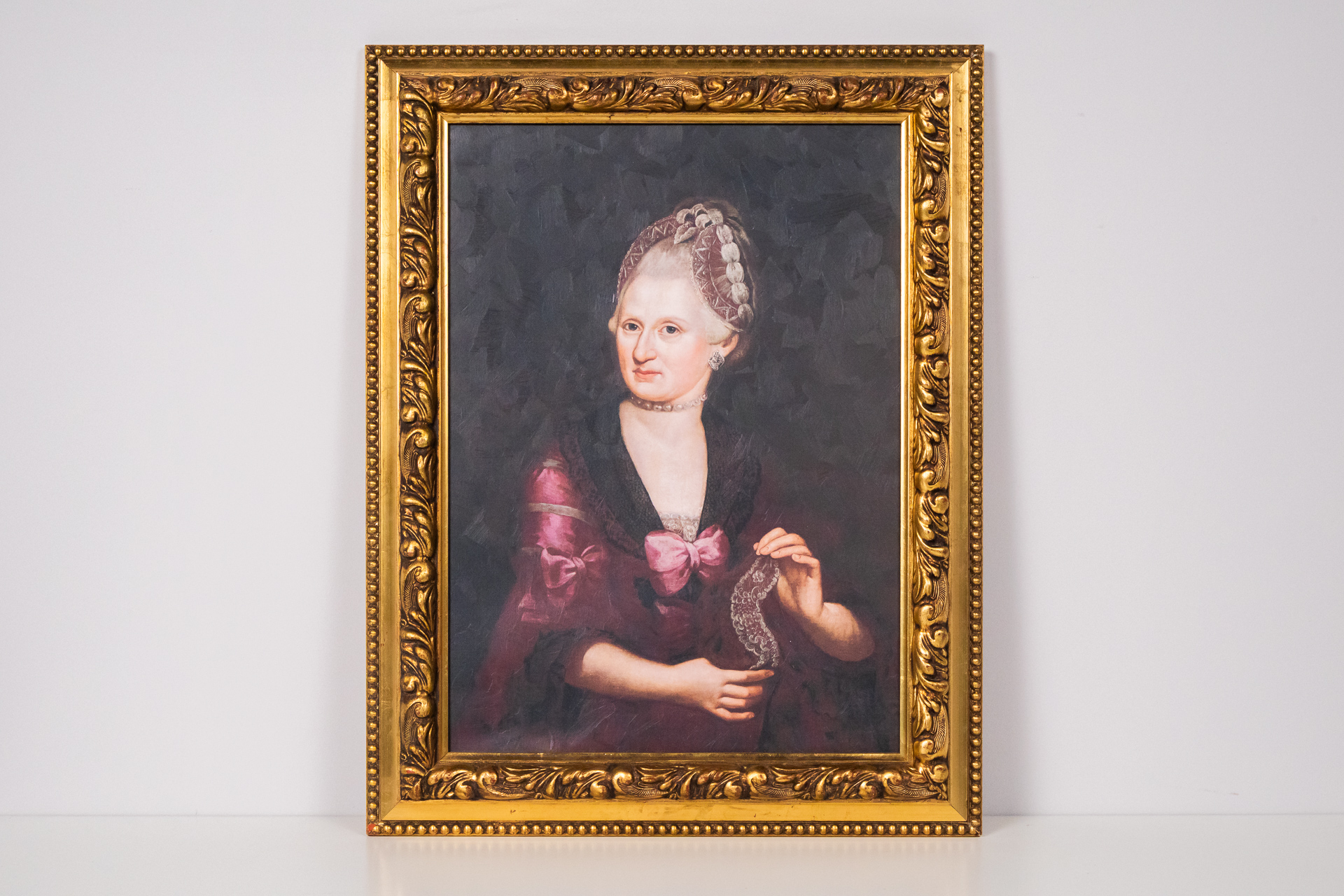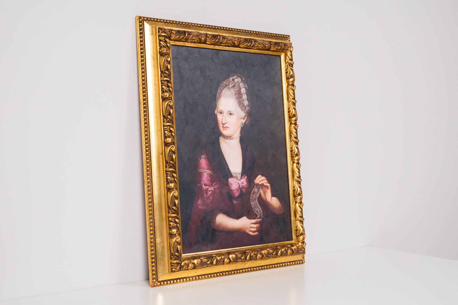 A festmény egy női portrét ábrázol, aki rózsaszínű ruhát visel, és a kezében egy díszes sálat tart. A háttér sötét, ami kiemeli a figura világos arcát és részletes frizuráját. A festmény olajjal készült, a részletek...