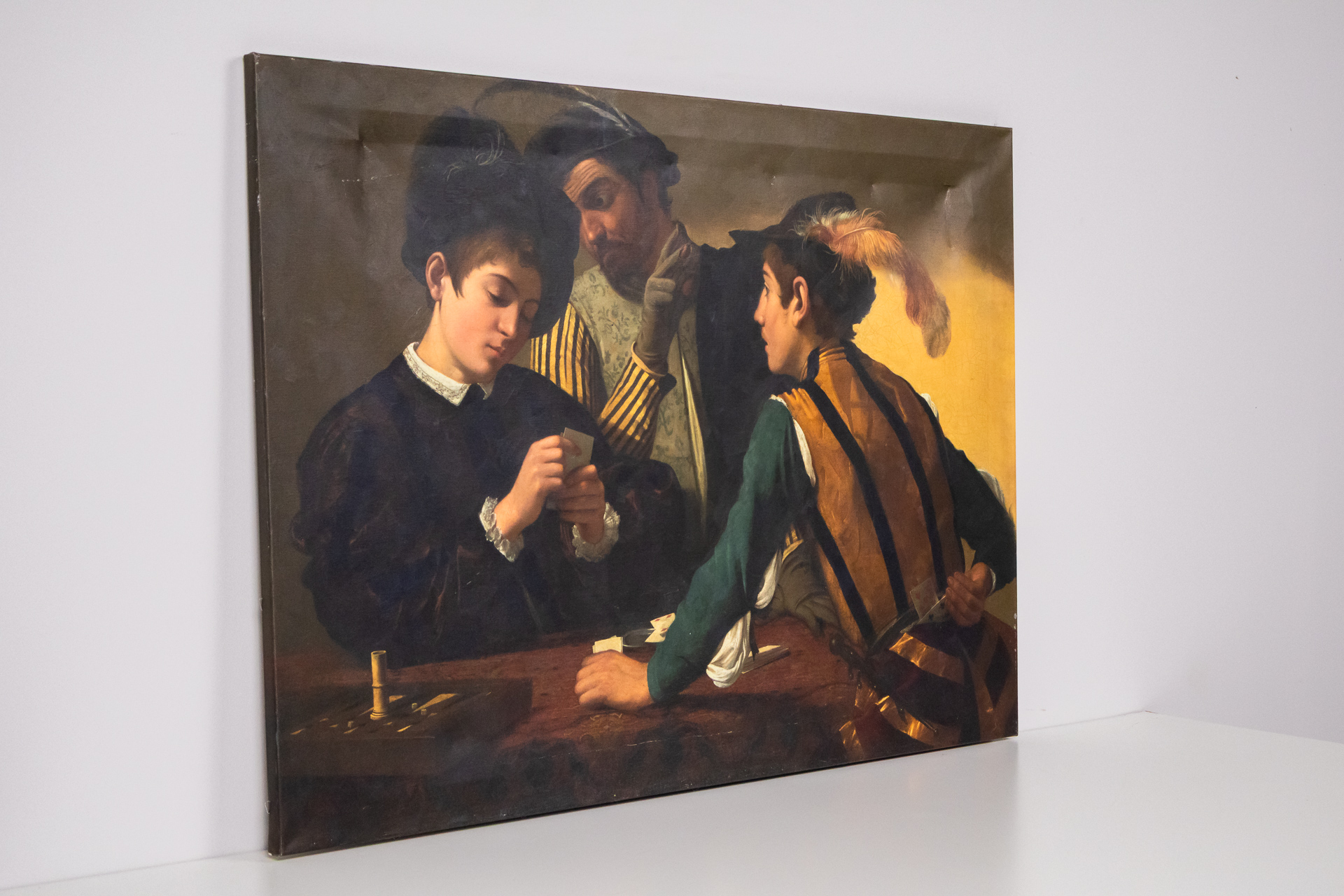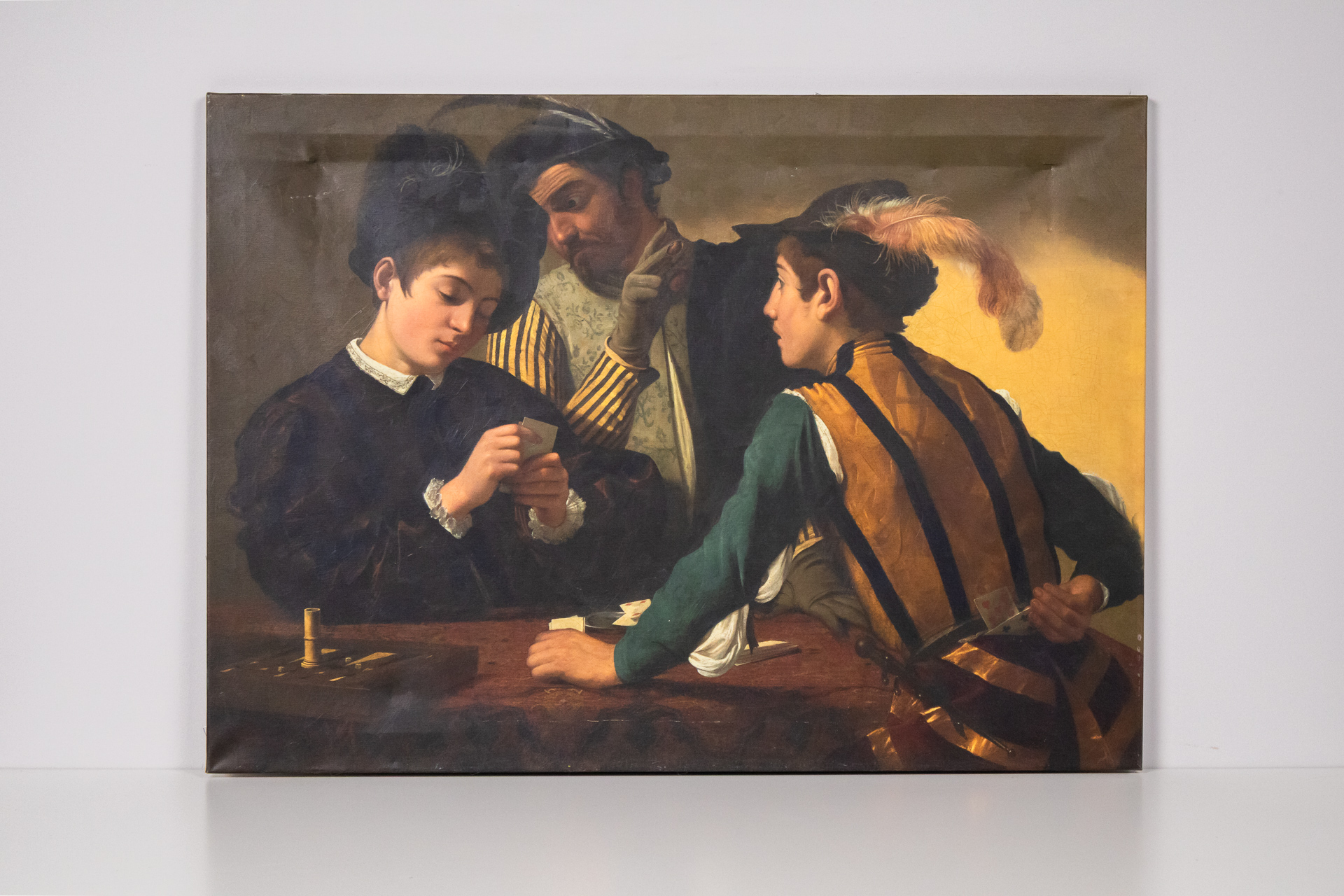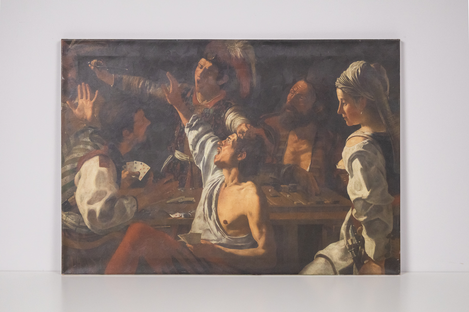 Barokk stílusú festmény, amely kártyázó férfiakat ábrázol egy sötét háttér előtt, élénk fény-árnyék kontrasztokkal. A középpontban egy fiatal férfi ül, akinek a ruházata részletesen kidolgozott, míg a többiek...