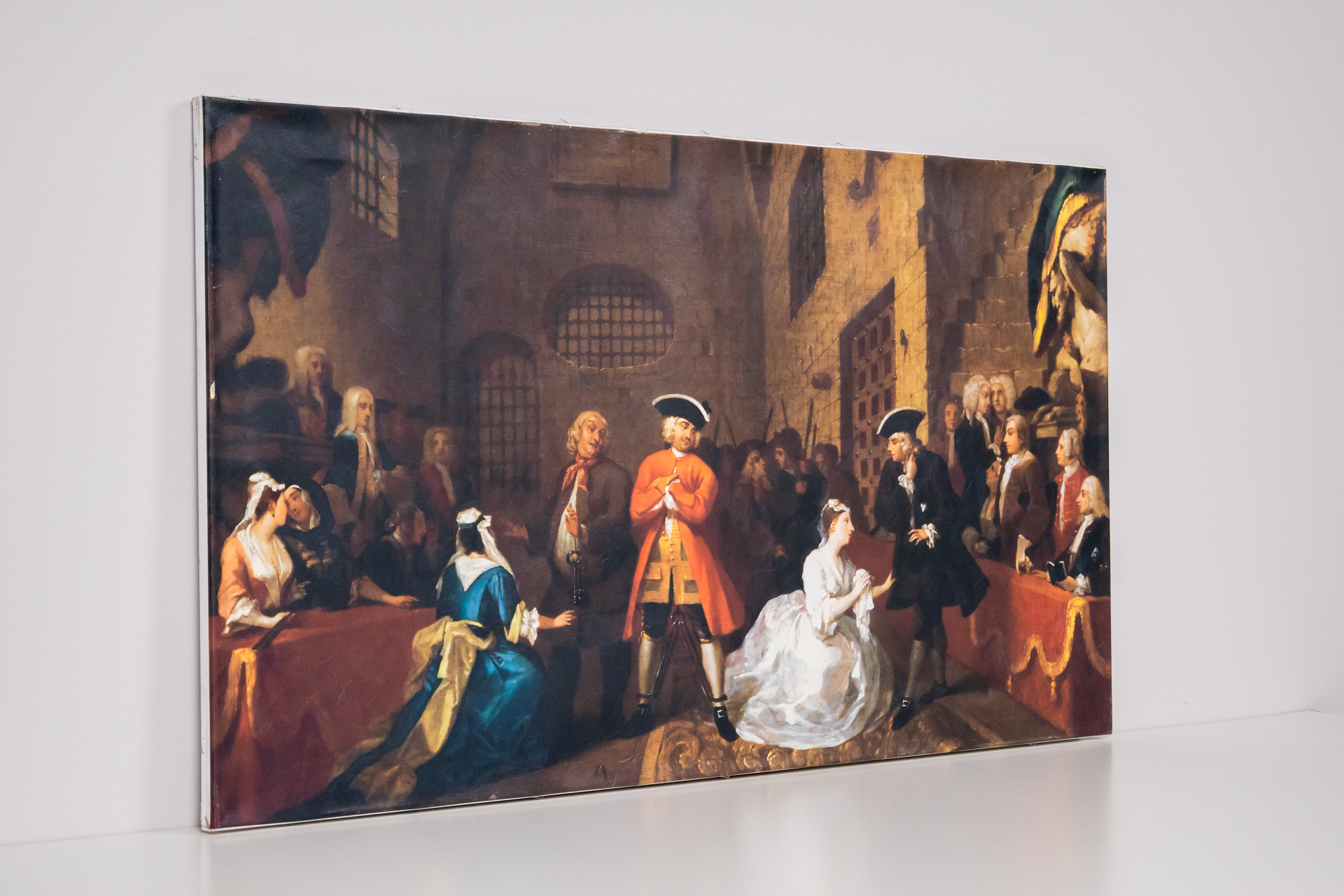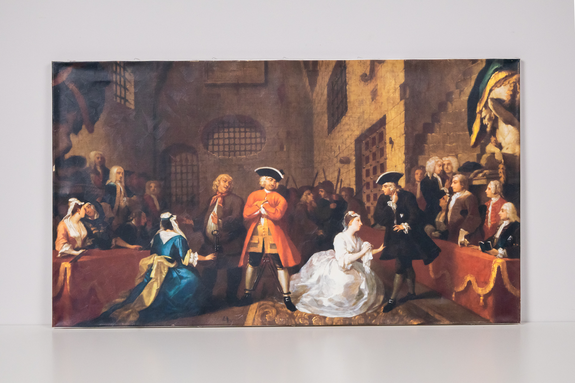 A festmény egy történelmi eseményt ábrázol, ahol több karakter interakcióban van egy bírósági vagy tárgyalási színtéren. A jelenet gazdag részletekkel és drámai kifejezésekkel van tele, a háttérben látható falak és...