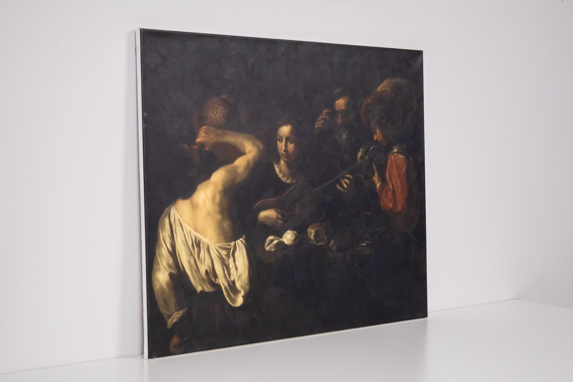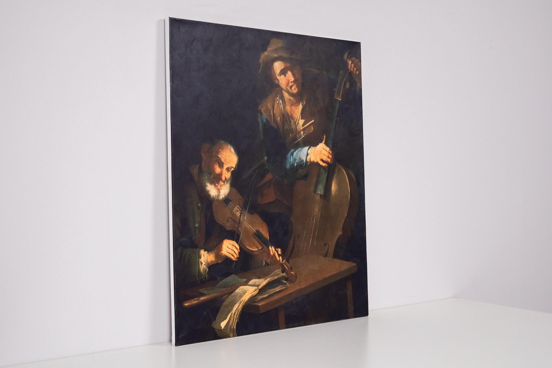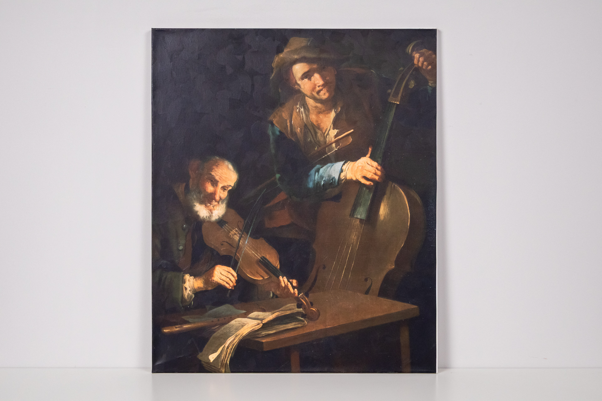 A festmény két zenészt ábrázol, akik egy asztalnál ülnek, az egyik hegedül, míg a másik csellón játszik. A háttér sötét, a fény a zenészekre irányul, hangsúlyozva az arcuk kifejezését és a hangszerük részleteit. A...