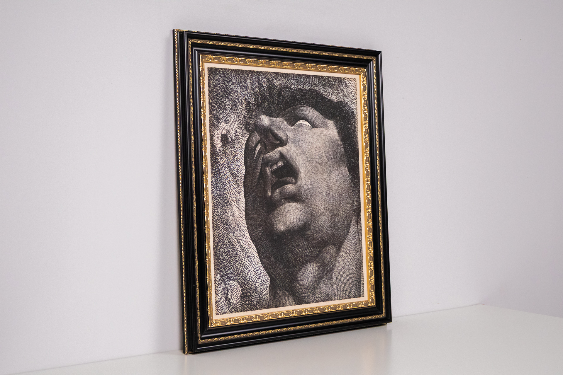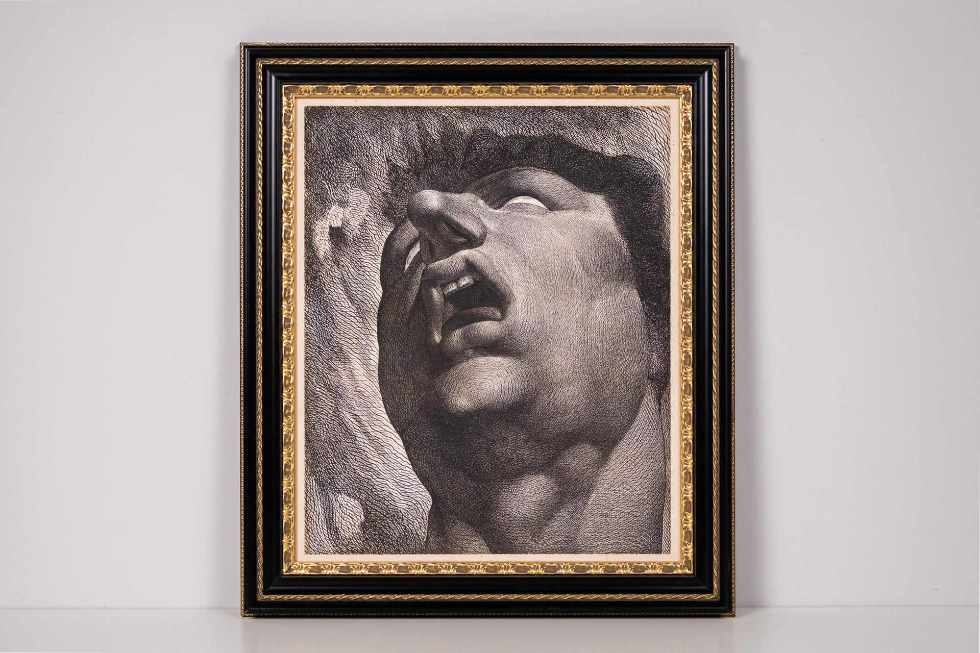 Expresszionista stílusú portré, amely egy érzelmekkel teli férfi arcát ábrázolja, aki hátradőlve, nyitott szájjal kiált. A kép sötét tónusú, erőteljes vonalvezetéssel és kontrasztos árnyékokkal készült, hangsúlyozva...