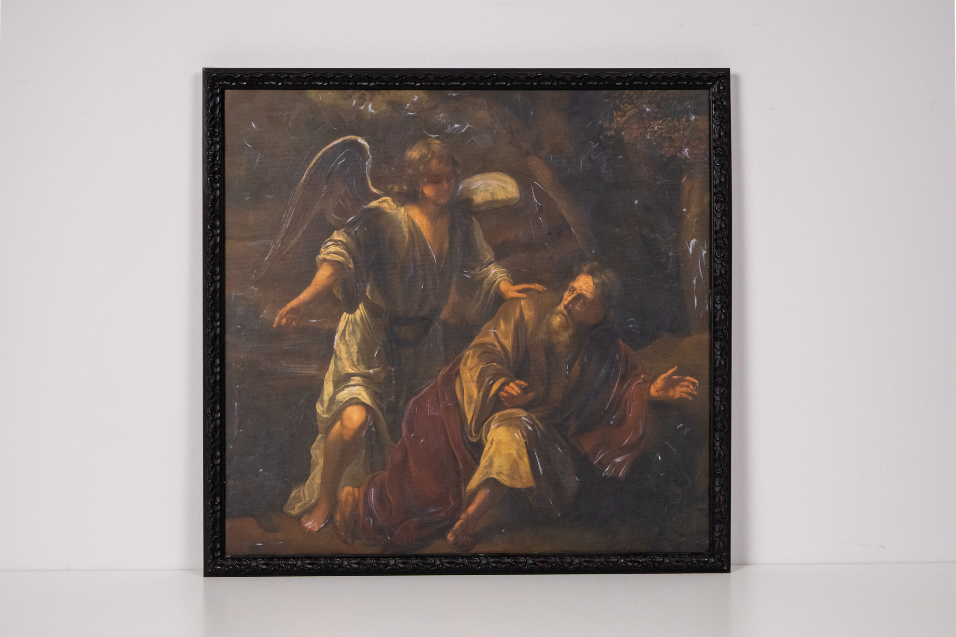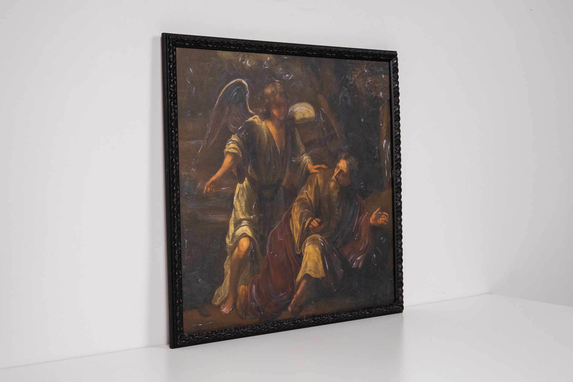 A festmény egy angyalt és egy idős férfit ábrázol, akik egy sötét háttér előtt állnak. Az angyal világos ruhában, szárnyakkal jelenik meg, míg a férfi szomorú arckifejezéssel néz fel rá. A festmény olajjal készült,...
