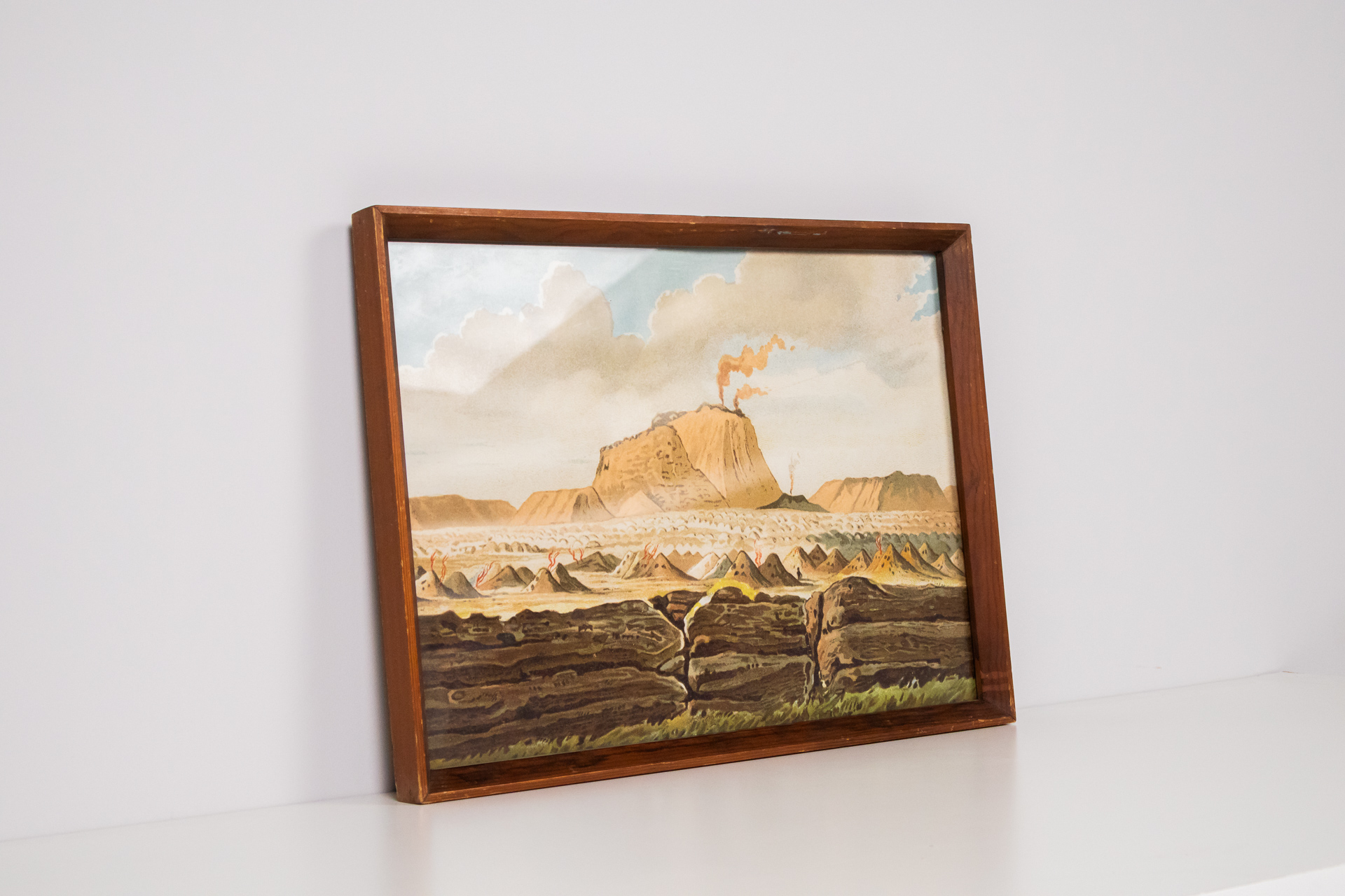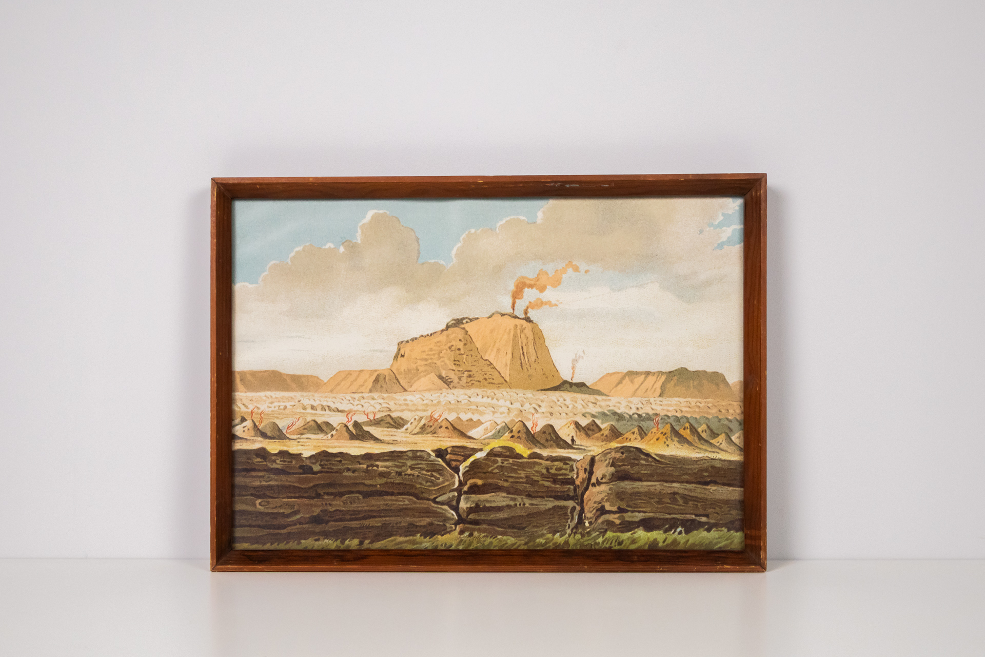 A kép egy tájképet ábrázol, melyen egy hegy és ipari kémények láthatók, amelyek füstöt bocsátanak ki. A háttérben felhős égbolt és hegyek láthatók, míg az előtérben különböző színű dombok és földrétegek jelennek meg....
