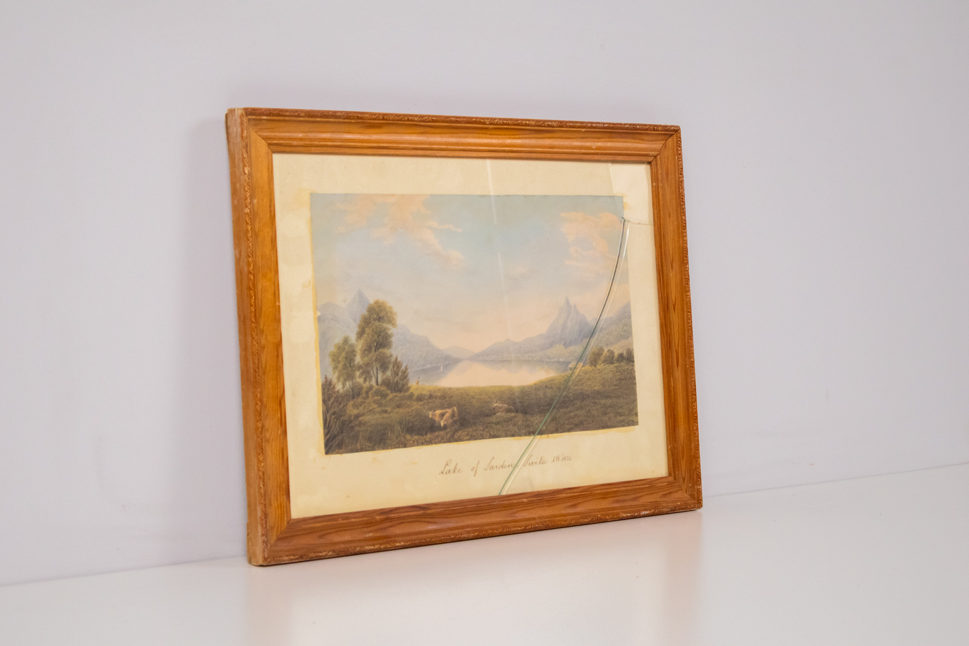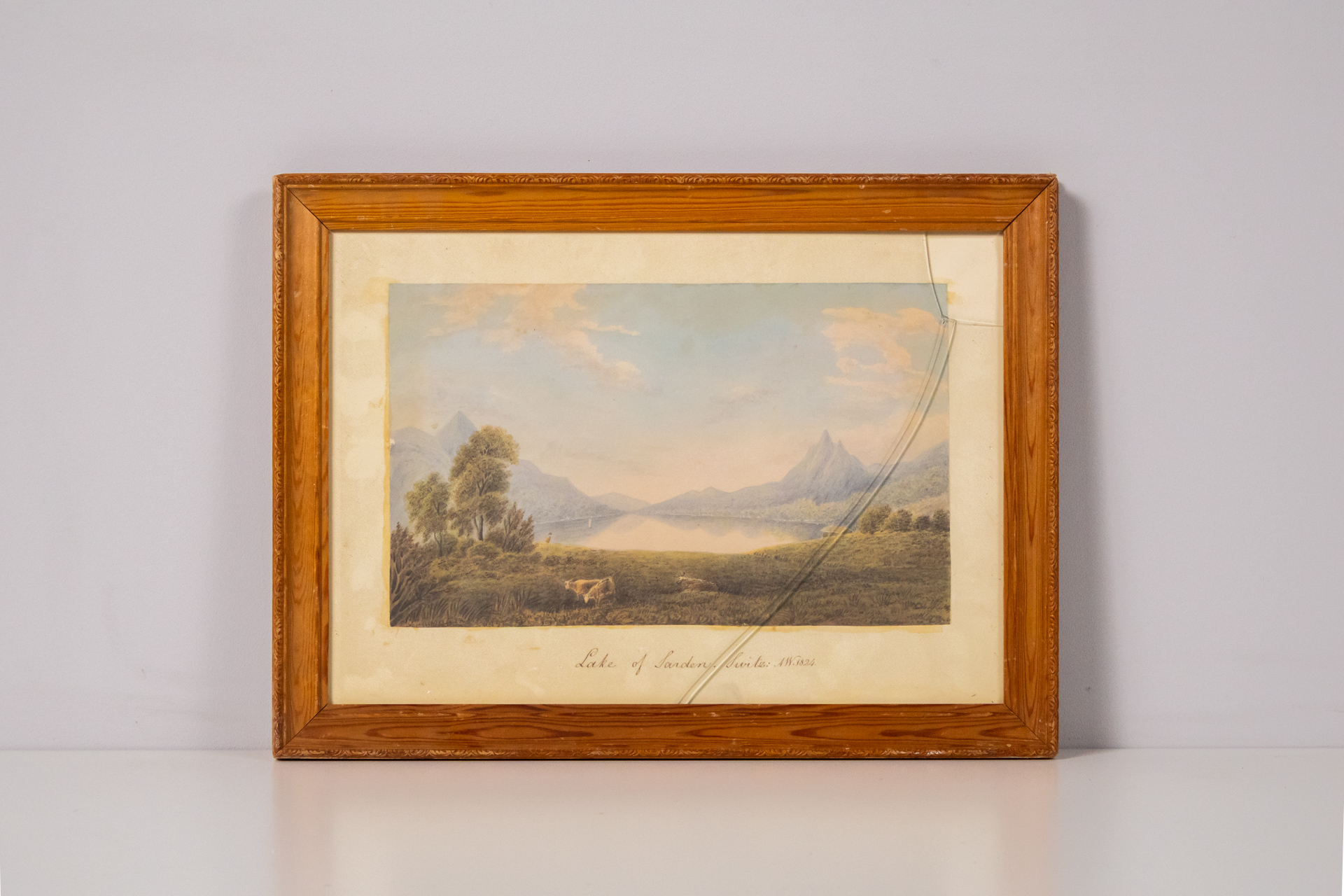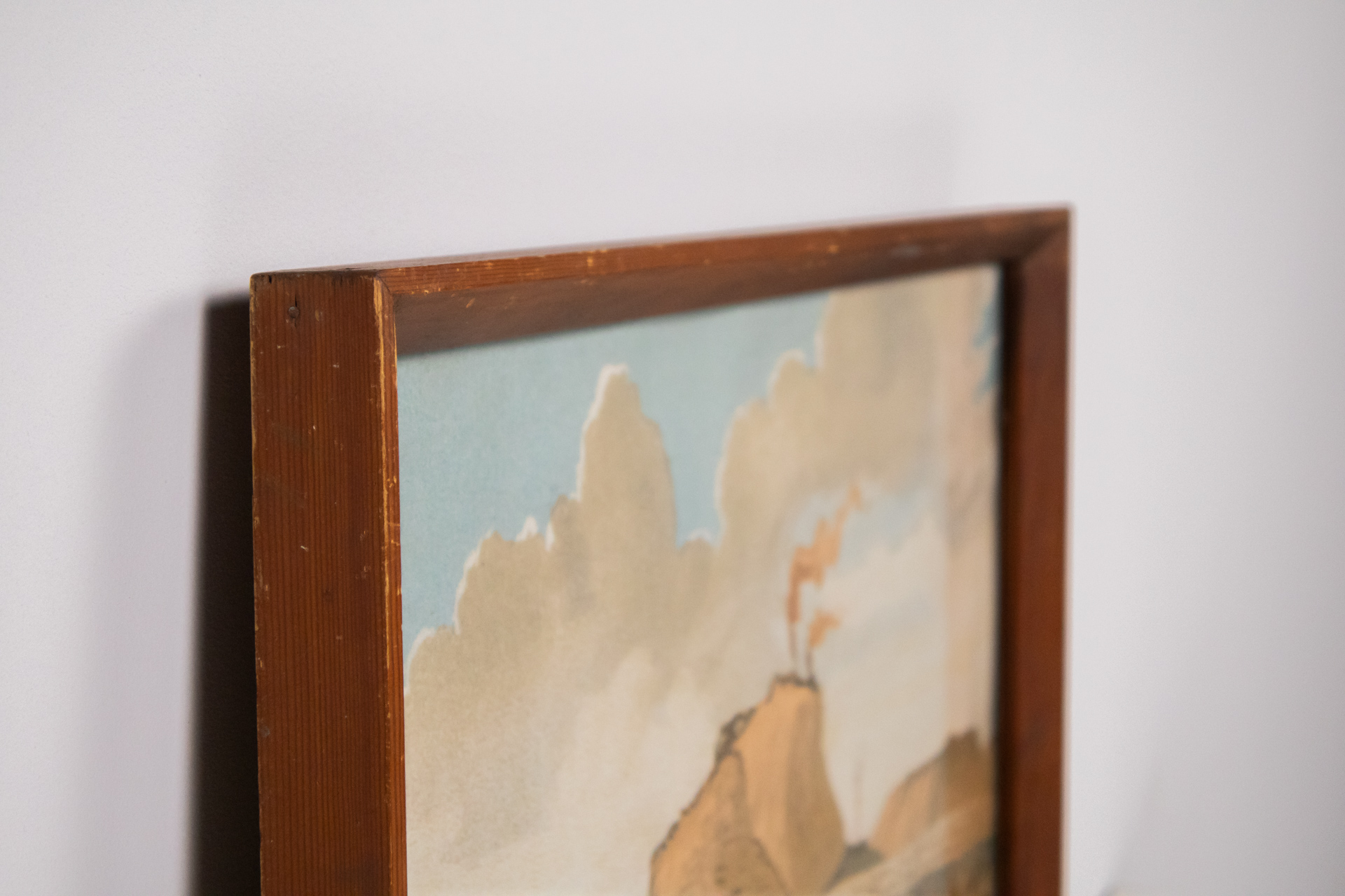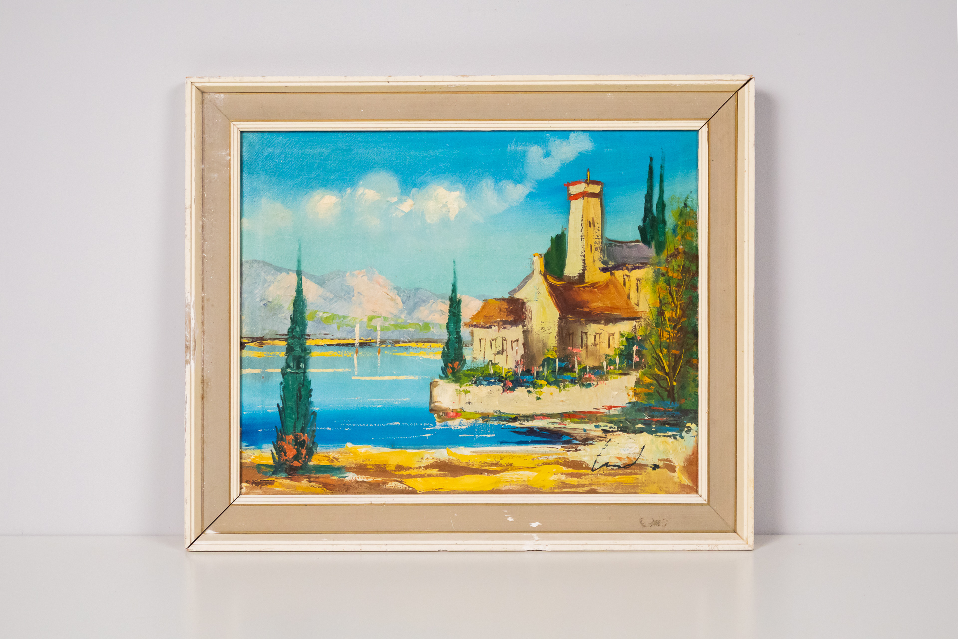 Élénk színekkel készült tájkép, amely egy vízparti jelenetet ábrázol, a háttérben hegyekkel és fenyőfákkal. A festmény domináló színei a kék, zöld és sárga árnyalatok, a házak meleg tónusúak, piros tetővel. A keret...