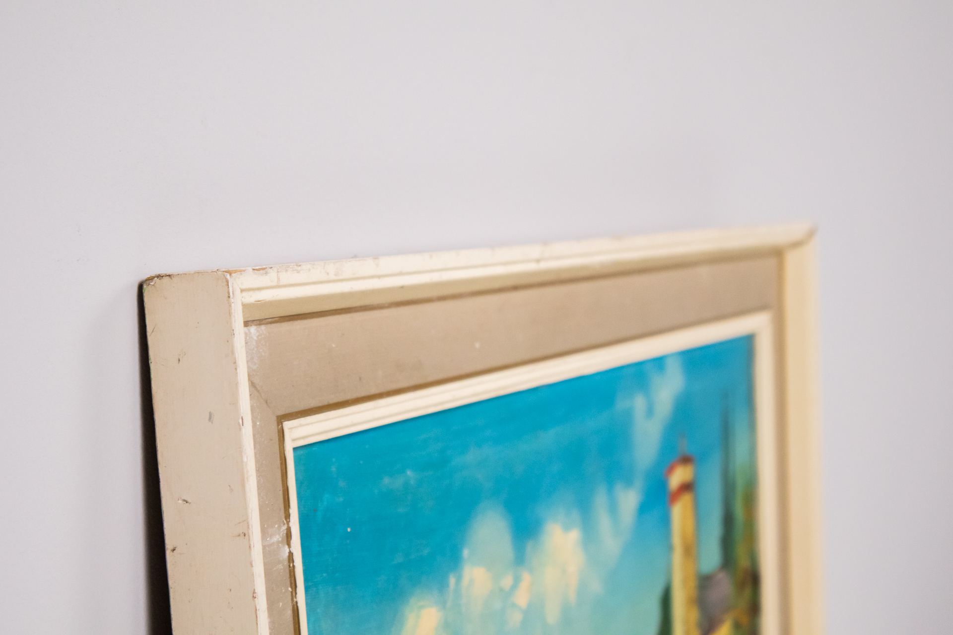 A kép egy vízparti városképet ábrázol, ahol a háttérben épületek és hajók láthatók. A festmény színes, élénk tónusokkal készült, a kék ég és a víz dominál. Az épületek részletesen kidolgozottak, a vízparti jelenet...