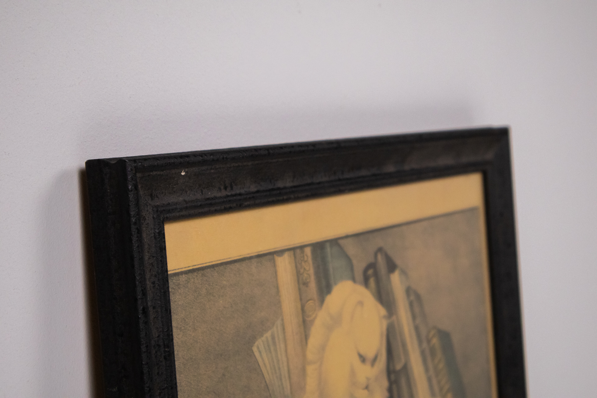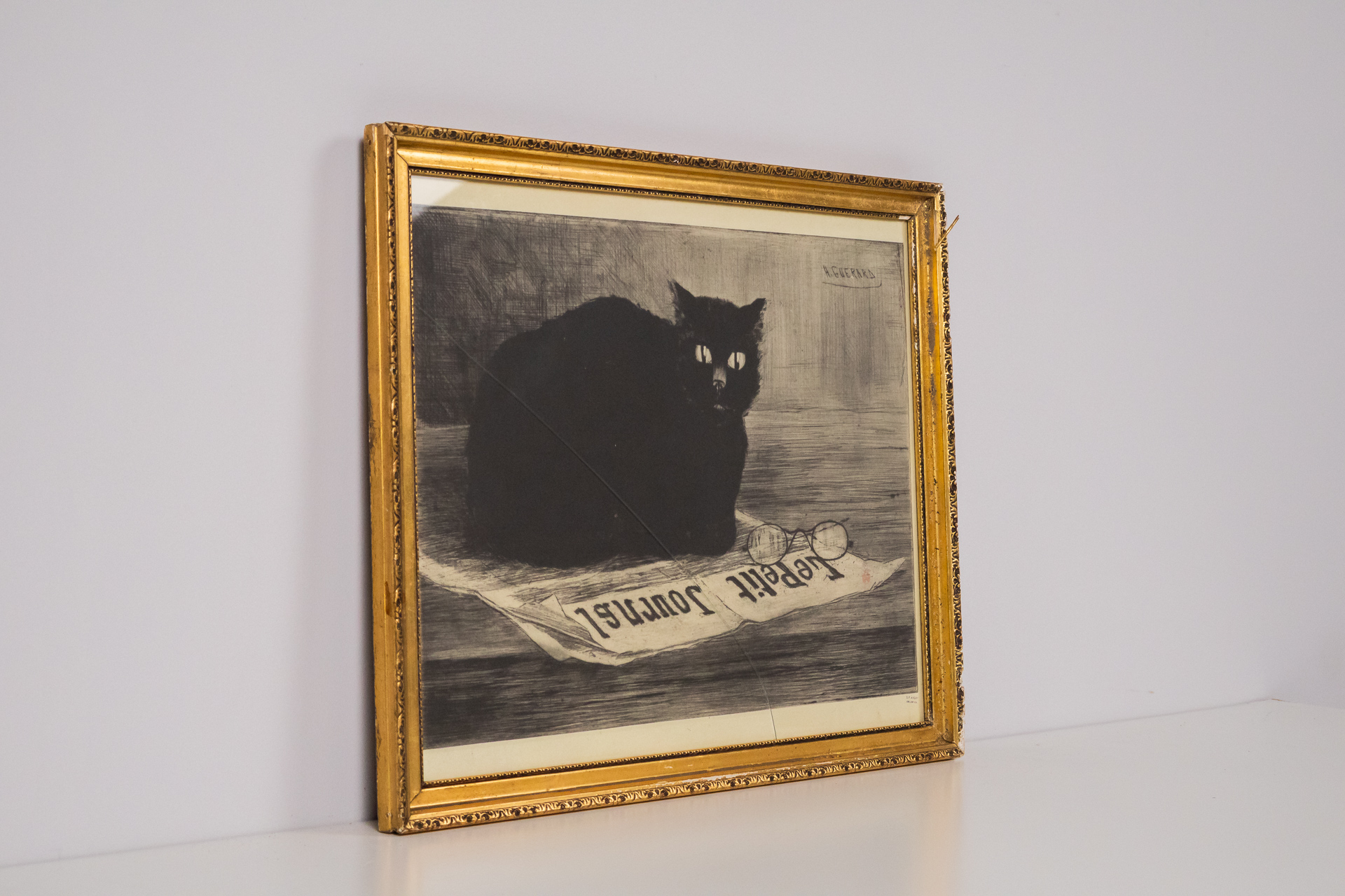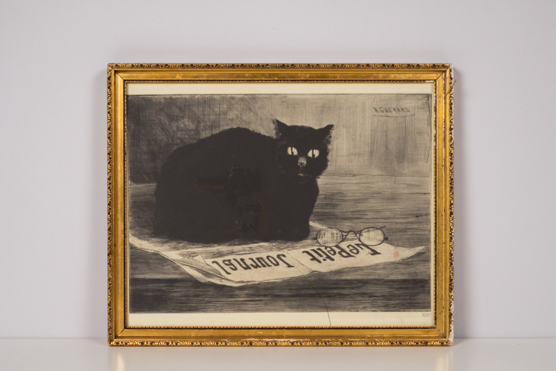 A kép egy fekete macskát ábrázol, amely egy újságra fekszik, a háttérben lágy, szürke árnyalatokkal. A macska szemei élénk fehér színűek, ami kontrasztot teremt a sötét bundájával. A technika valószínűleg metszet...