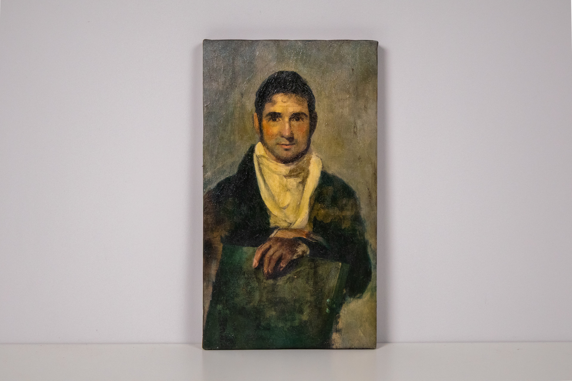 A festmény egy fiatal férfit ábrázol, aki zöld színű ruhát visel, fehér sállal a nyakában. Az arckifejezése barátságos, a háttér homályos, pasztell színekben. Az olajfestmény technikája lágy ecsetvonásokkal dolgozik,...