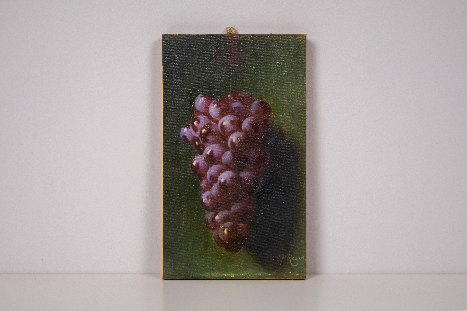 Realista stílusú csendélet, amely egy gazdag lila szőlőfürtöt ábrázol, sötét zöld háttér előtt. Az ecsetvonások finomak, a fény-árnyék játék kiemeli a gyümölcs textúráját és térbeliségét. A festmény vászonra készült...
