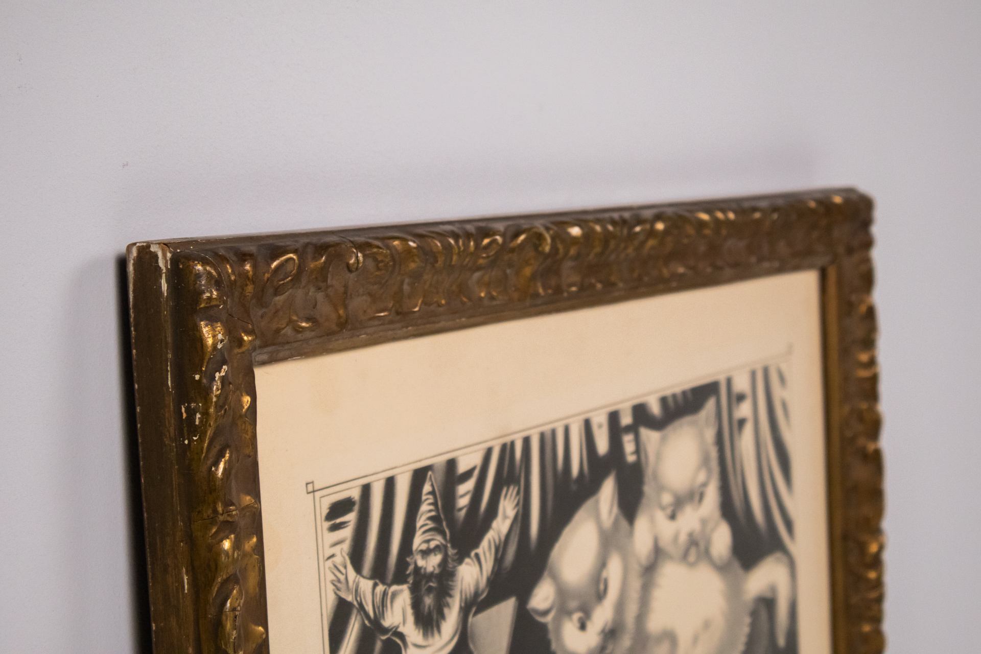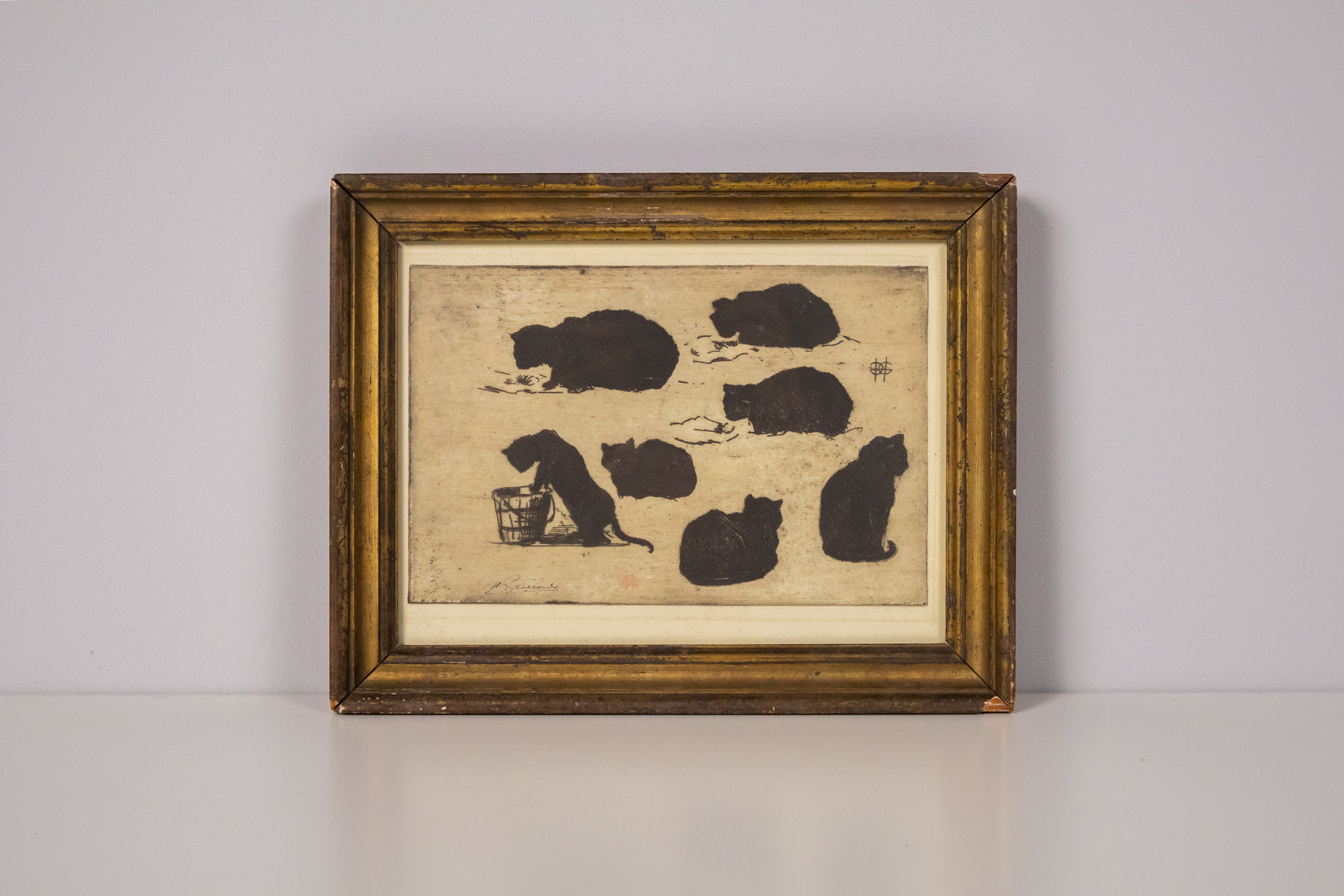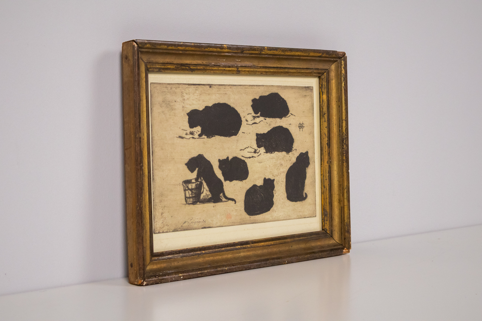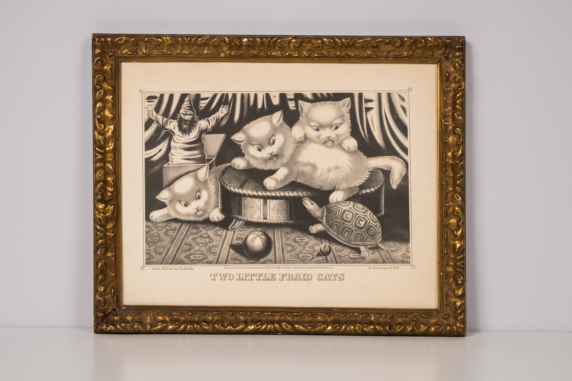A kép egy aranyozott keretben elhelyezett, fekete-fehér illusztrációt ábrázol, amely két aranyos cica játékát mutatja be. Az egyik cica a doboz szélén ül, míg a másik a földön fekszik, egy teknősbéka társaságában. A...