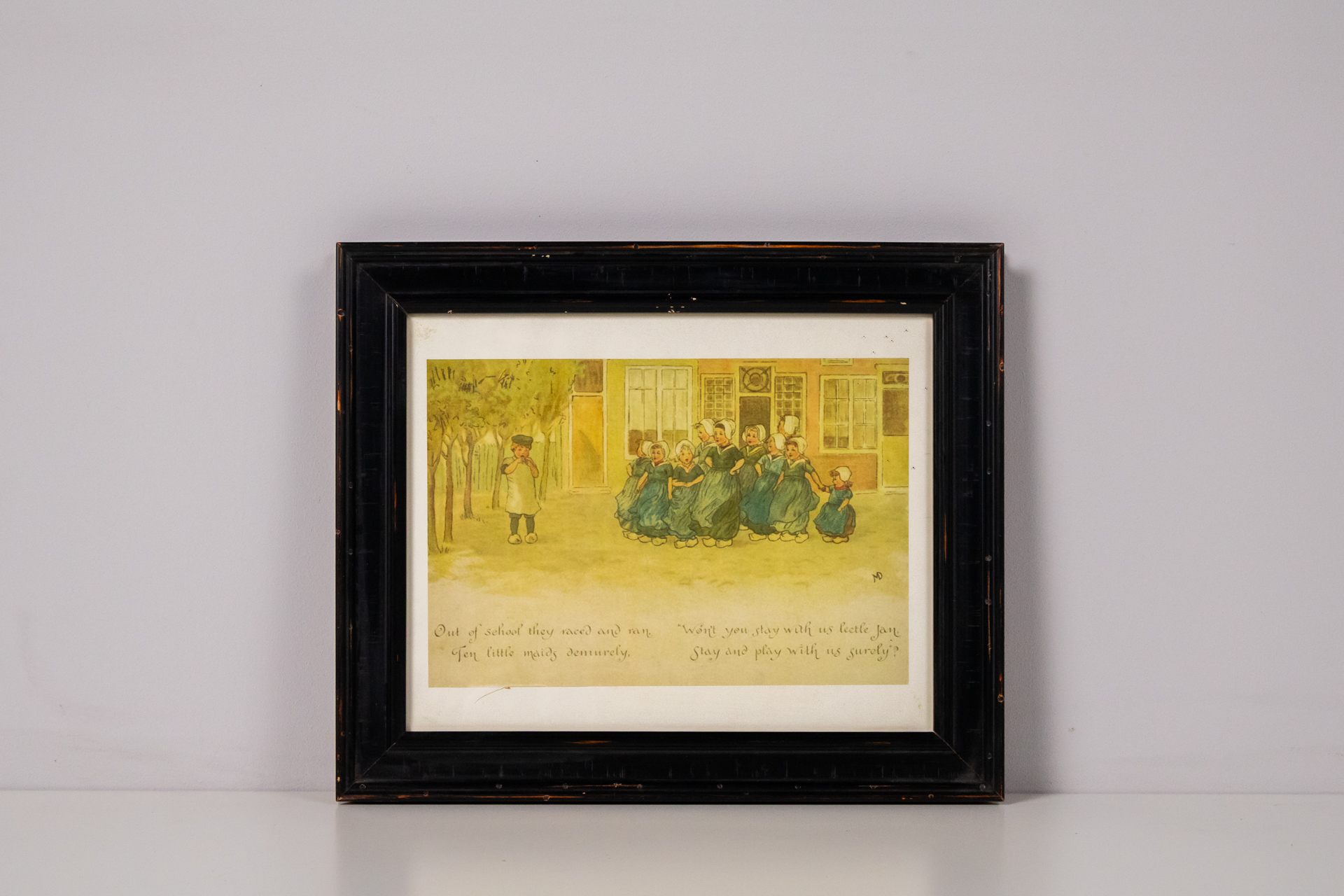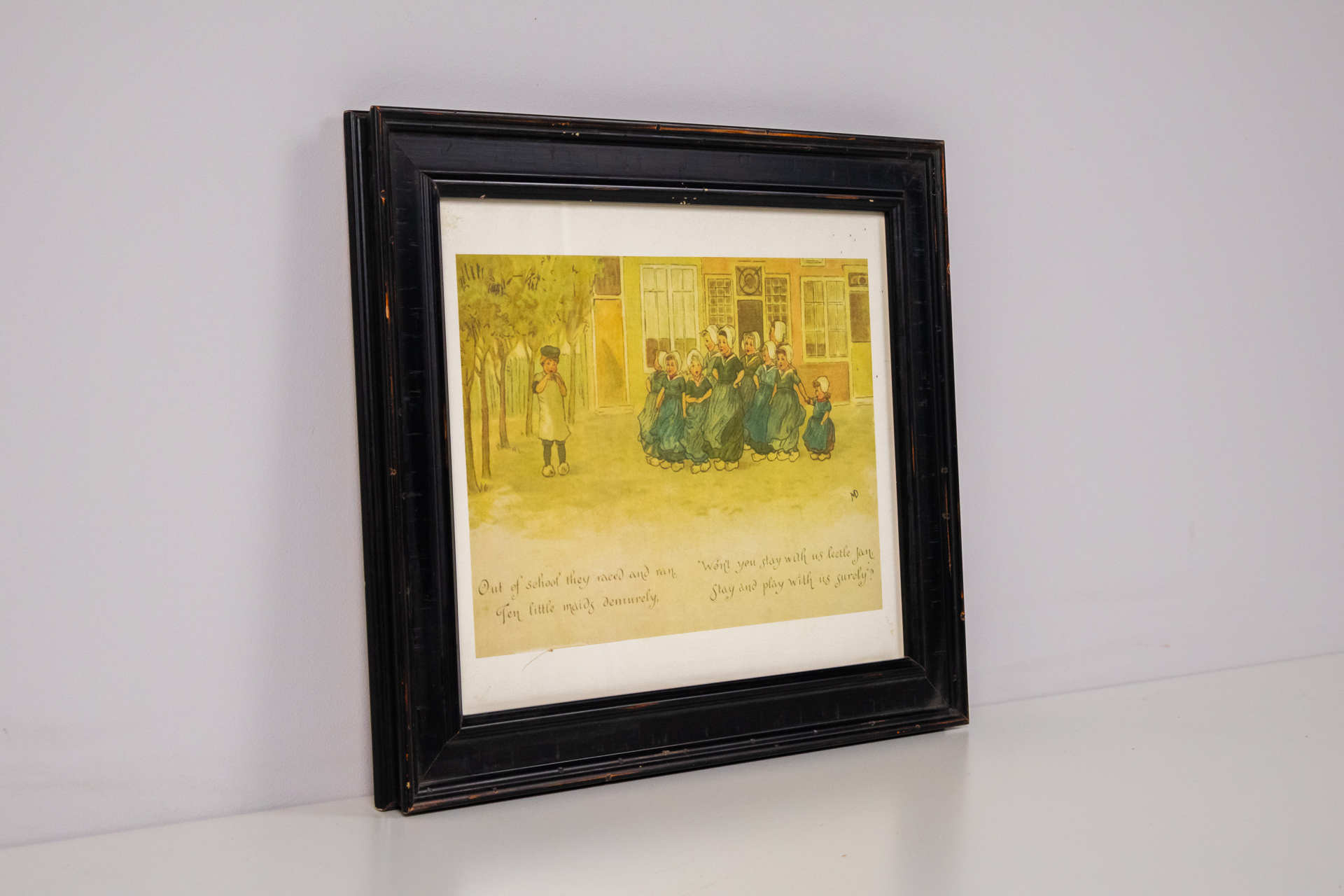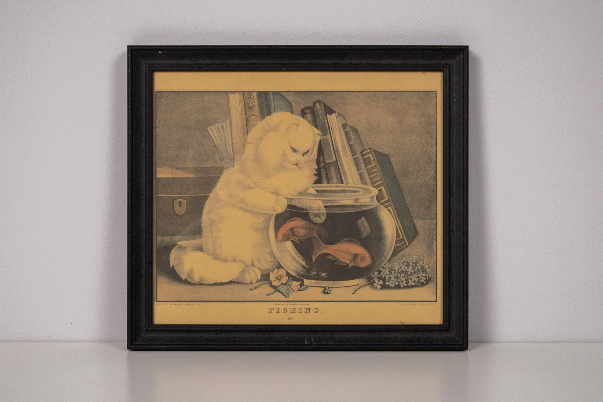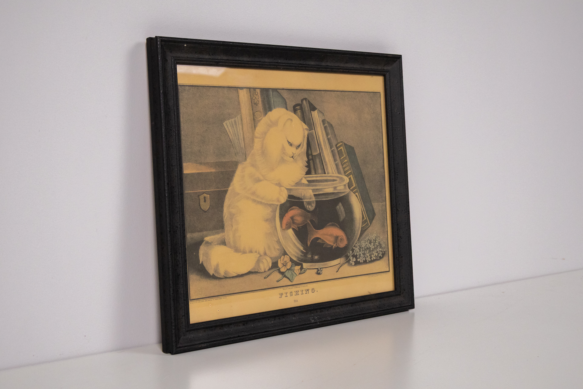 A kép egy aranyozott keretben elhelyezett, fekete-fehér illusztrációt ábrázol, amely két aranyos cica játékát mutatja be. Az egyik cica a doboz szélén ül, míg a másik a földön fekszik, egy teknősbéka társaságában. A...