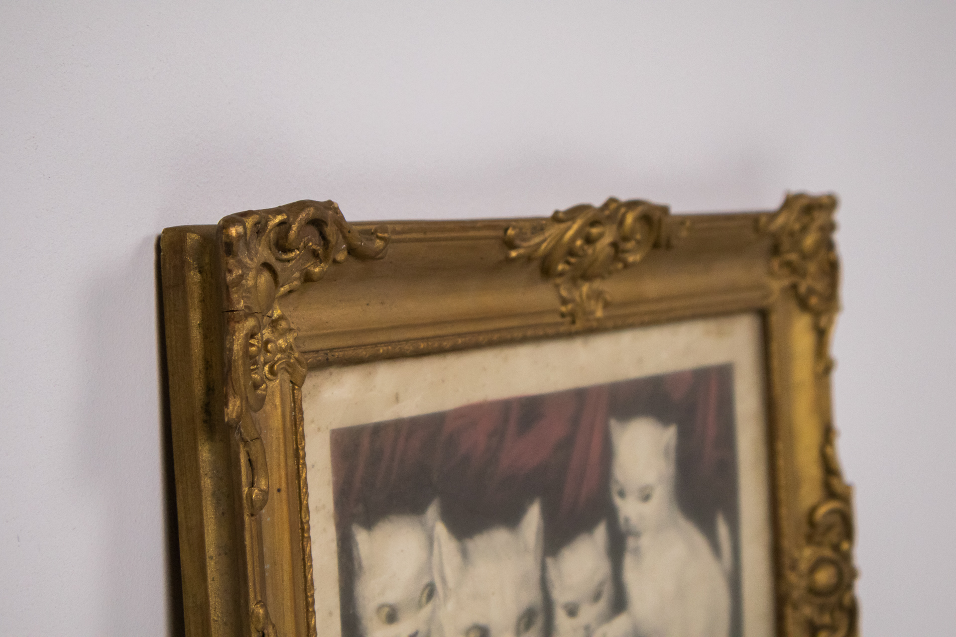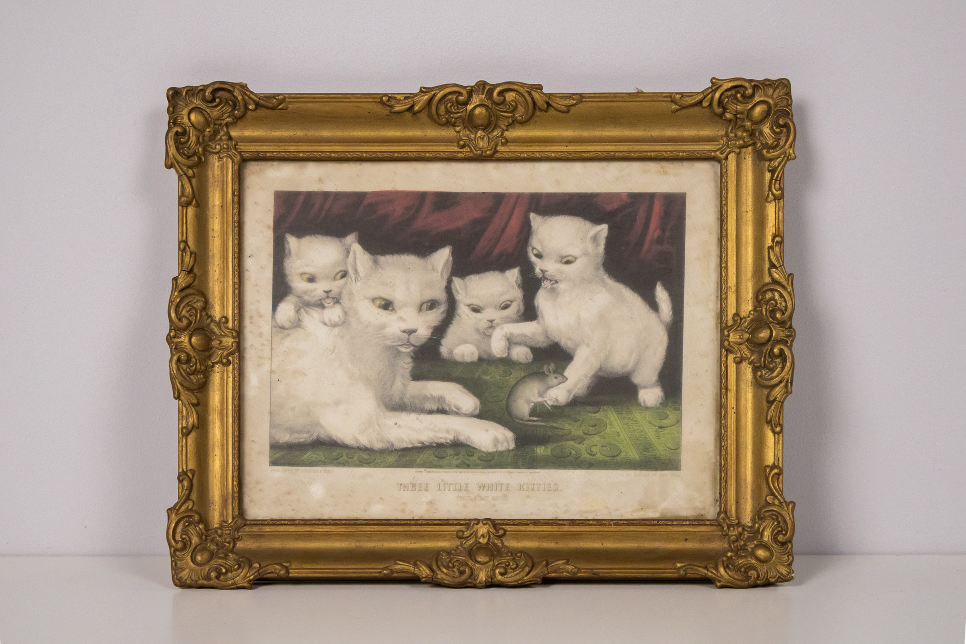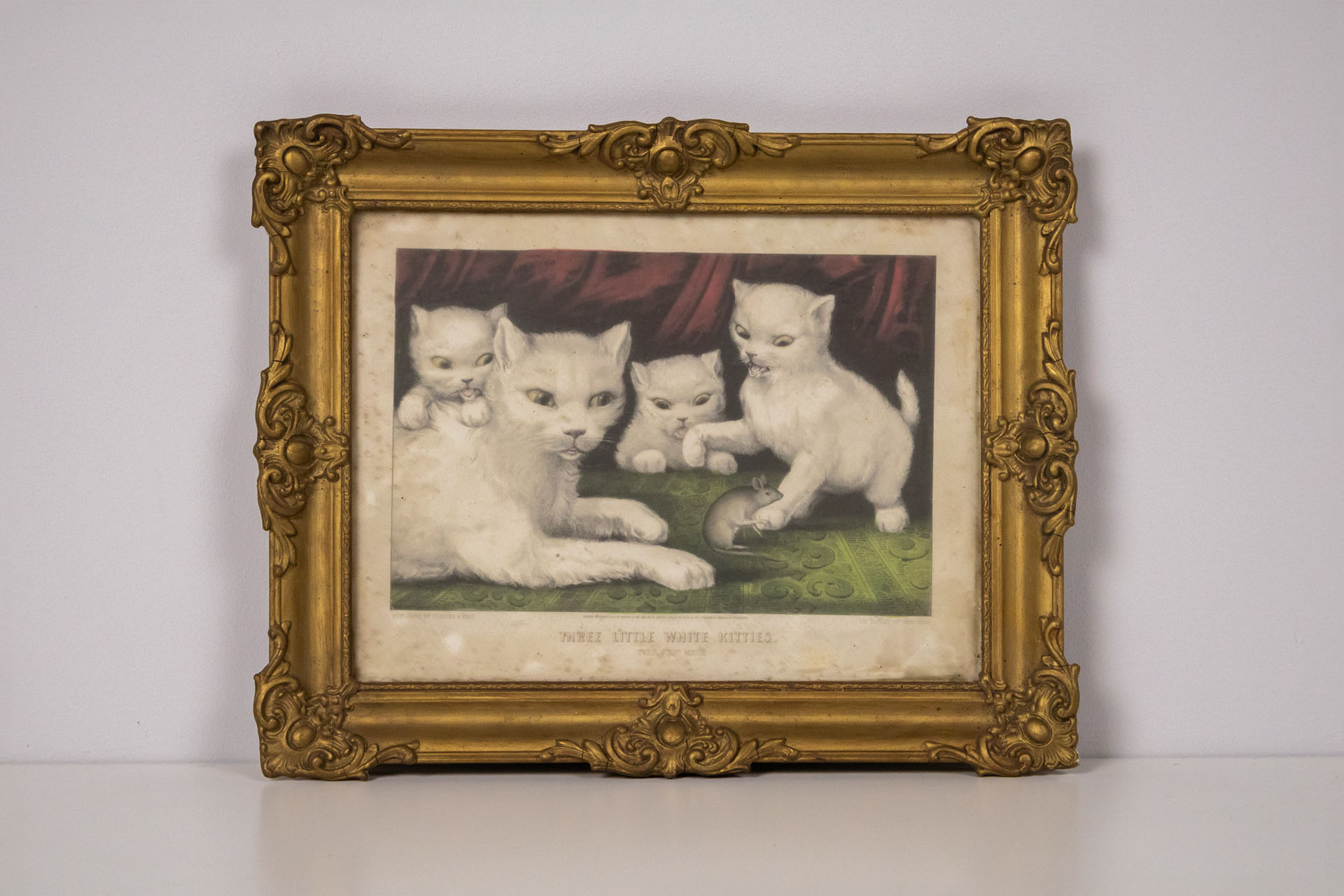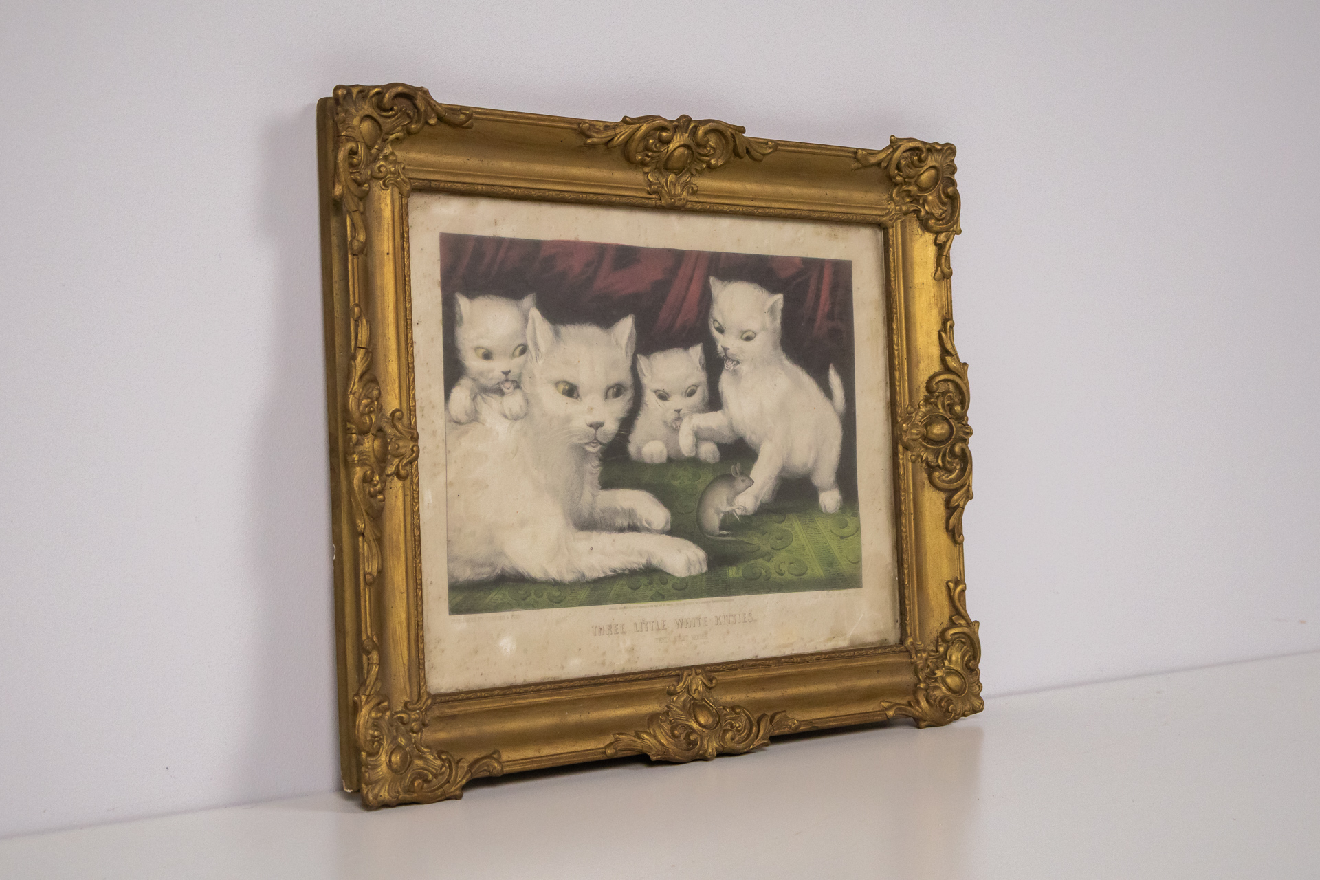 A kép négy fehér macskát ábrázol, akik játékos pózban vannak, egy zöld szőnyegen. Az állatok részletesen kidolgozottak, a háttér sötétvörös drapériával van kiemelve. A festmény színei lágyak, a fehér macskák és a...
