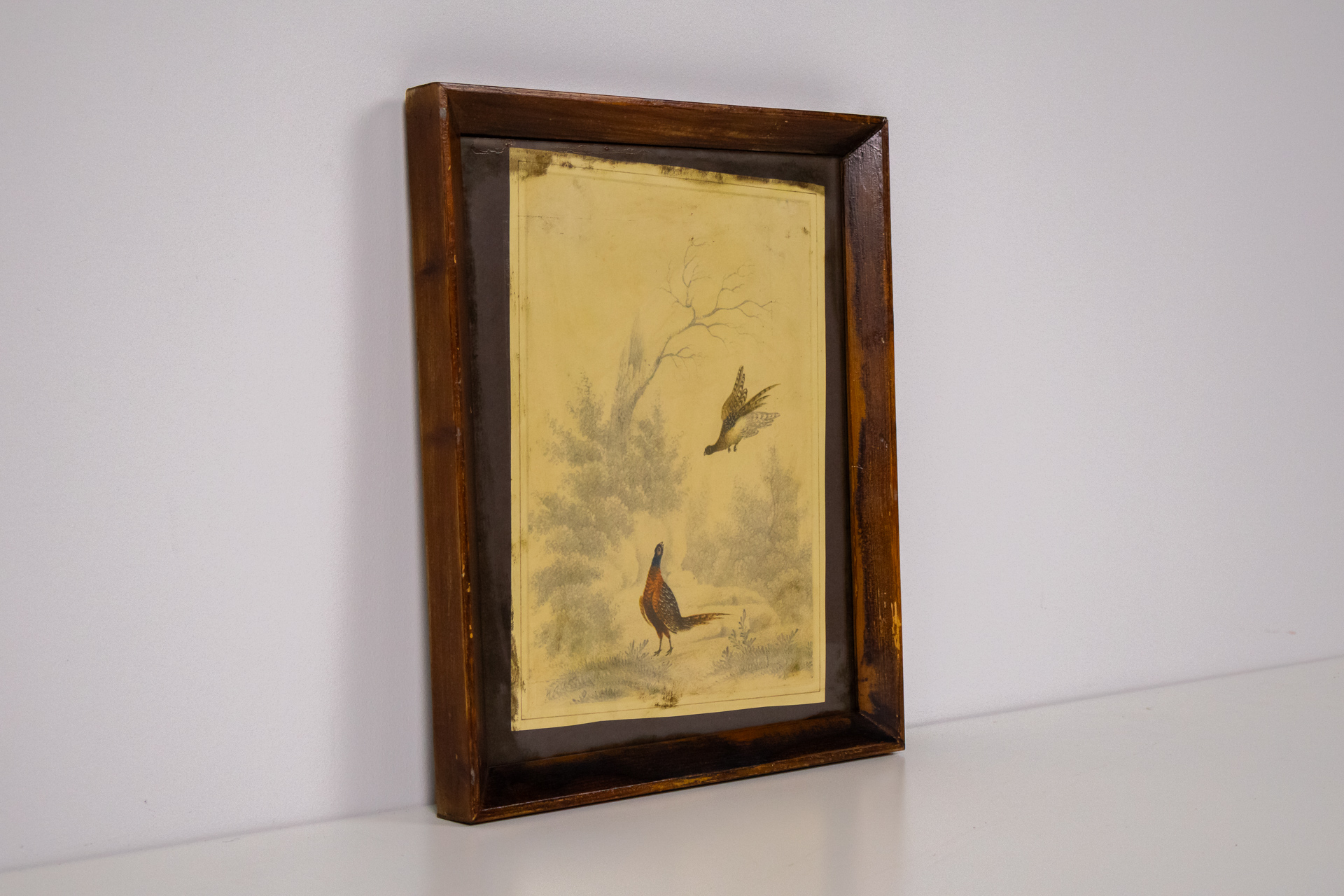 A kép egy madárjelenetet ábrázol, ahol egy színes madár áll a földön, míg egy másik madár repül a háttérben. A háttérben fák és bokrok láthatók, a kompozíció lágy, pasztell színekkel készült. A technika valószínűleg...
