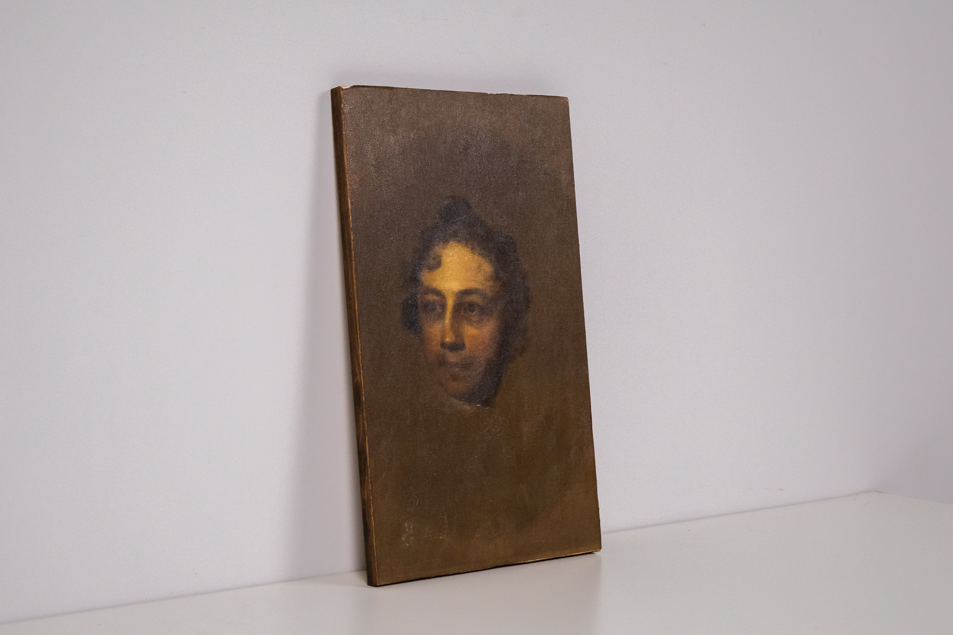 A kép egy arcképet ábrázol, amely a háttérben lágy, egységes barna tónusokkal van megfestve. Az arckép részletesen kidolgozott, a haj és az arc árnyékolása finom ecsetvonásokkal készült. A festmény technikája olaj, a...