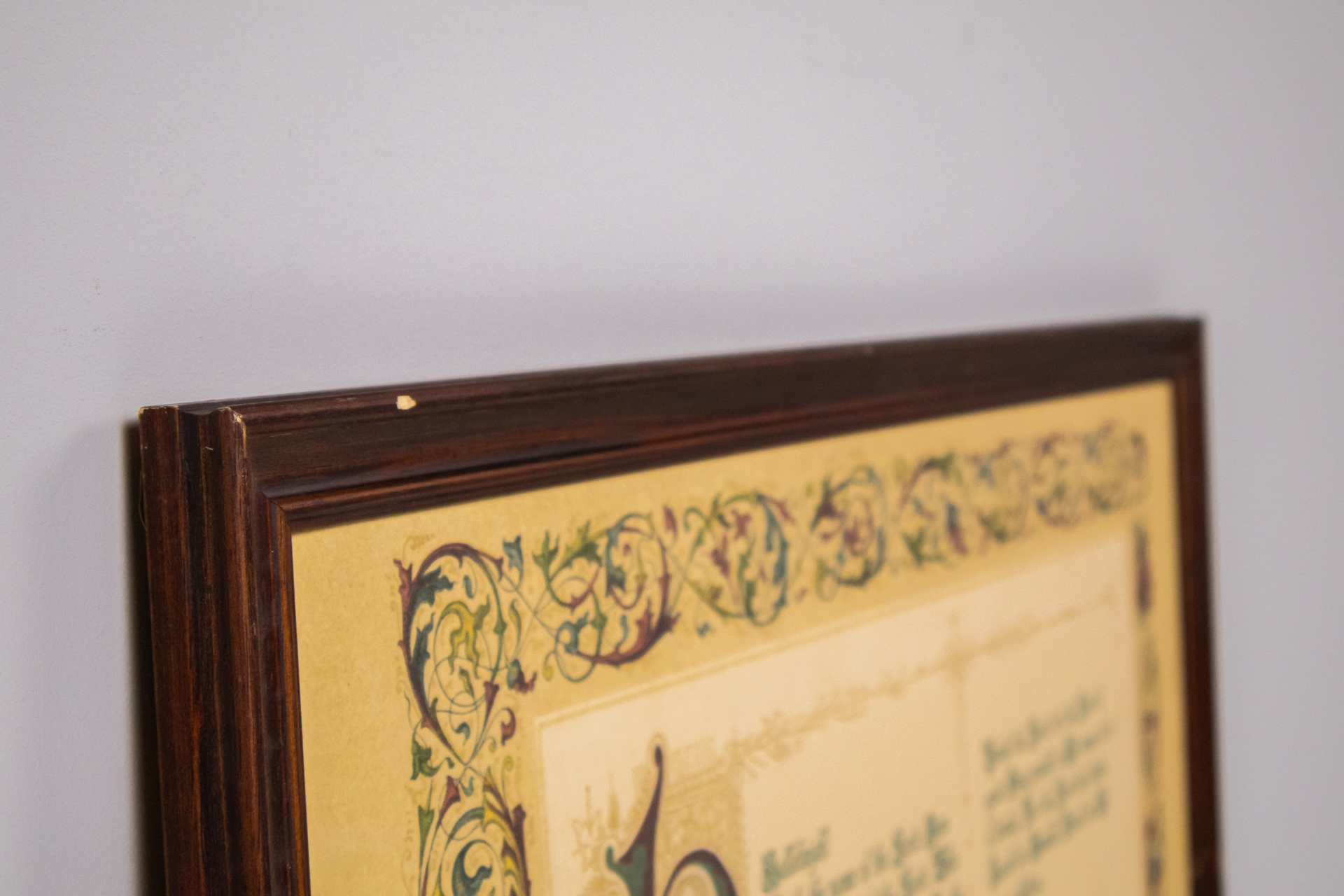 A kép egy díszes, kalligrafikus stílusú bibliai idézetet ábrázol, amely a hit fontosságát hangsúlyozza. Az idézetet színes virágmotívumok keretezik, a háttér világos bézs színű. A keret sötétbarna fából készült,...