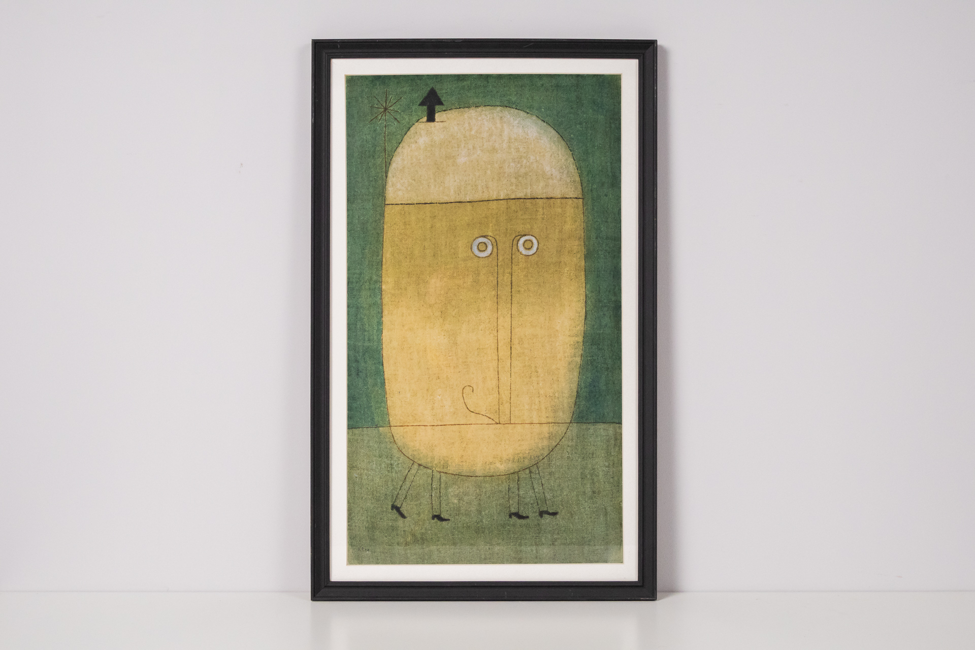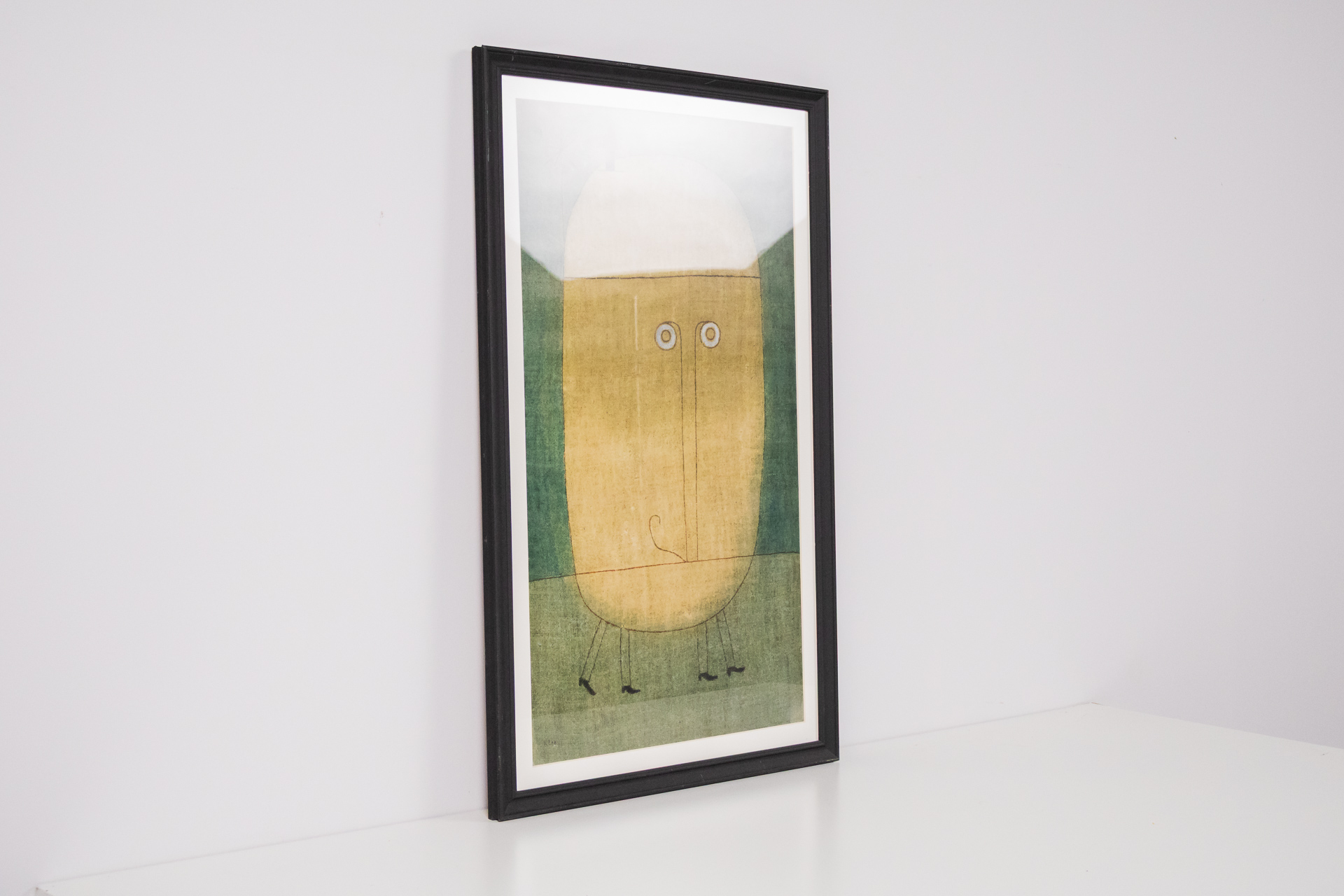 Absztrakt stílusú portré, amely egy egyszerű, stilizált arcot ábrázol. Az aranysárga háttér előtt zöld és barna árnyalatok jelennek meg, a figura minimalista vonásokkal és kifejező szemekkel rendelkezik. A kompozíció...