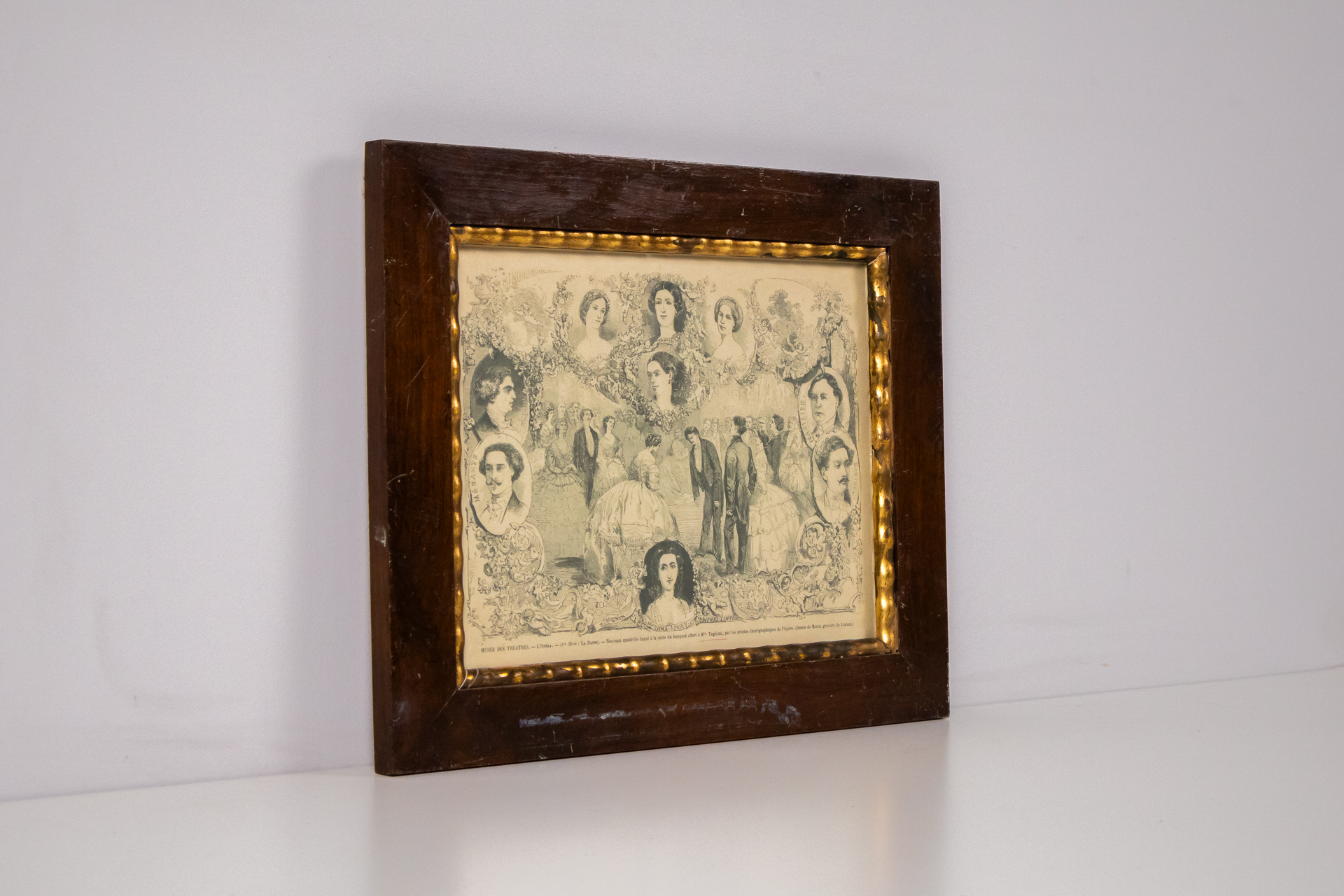 A kép egy 19. századi stílusú grafikai alkotás, amely több női és férfi portrét ábrázol, díszes virágmotívumokkal keretezve. A háttérben elegáns ruhákba öltözött személyek láthatók, a részletek finom vonalakkal és...