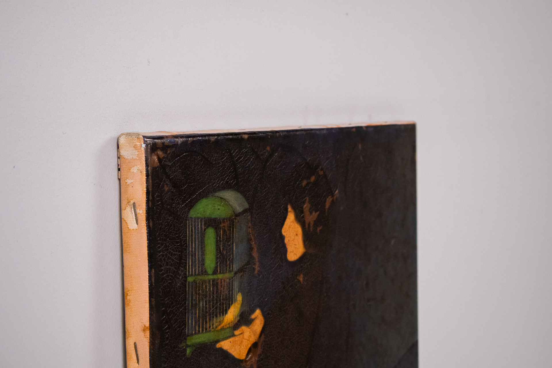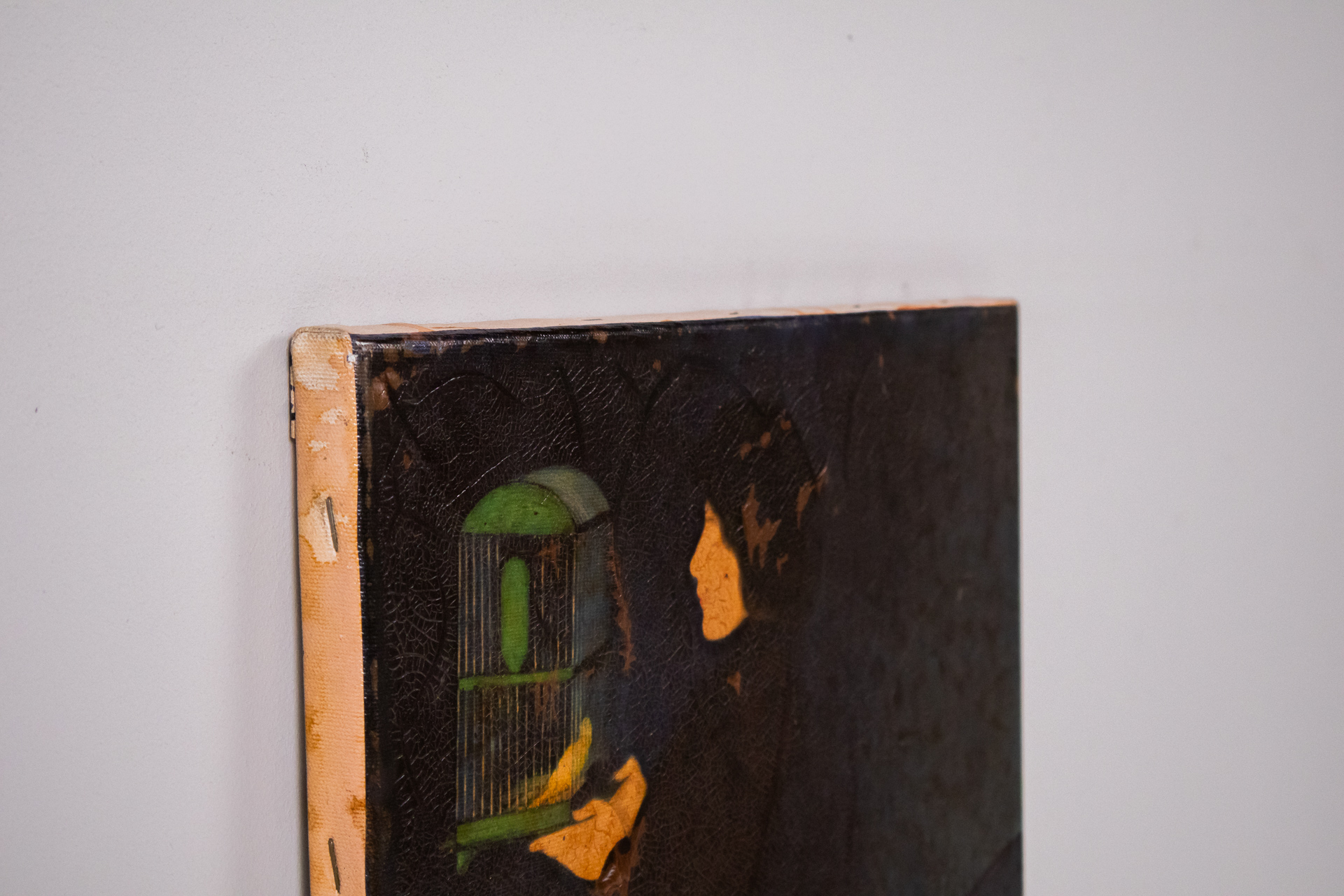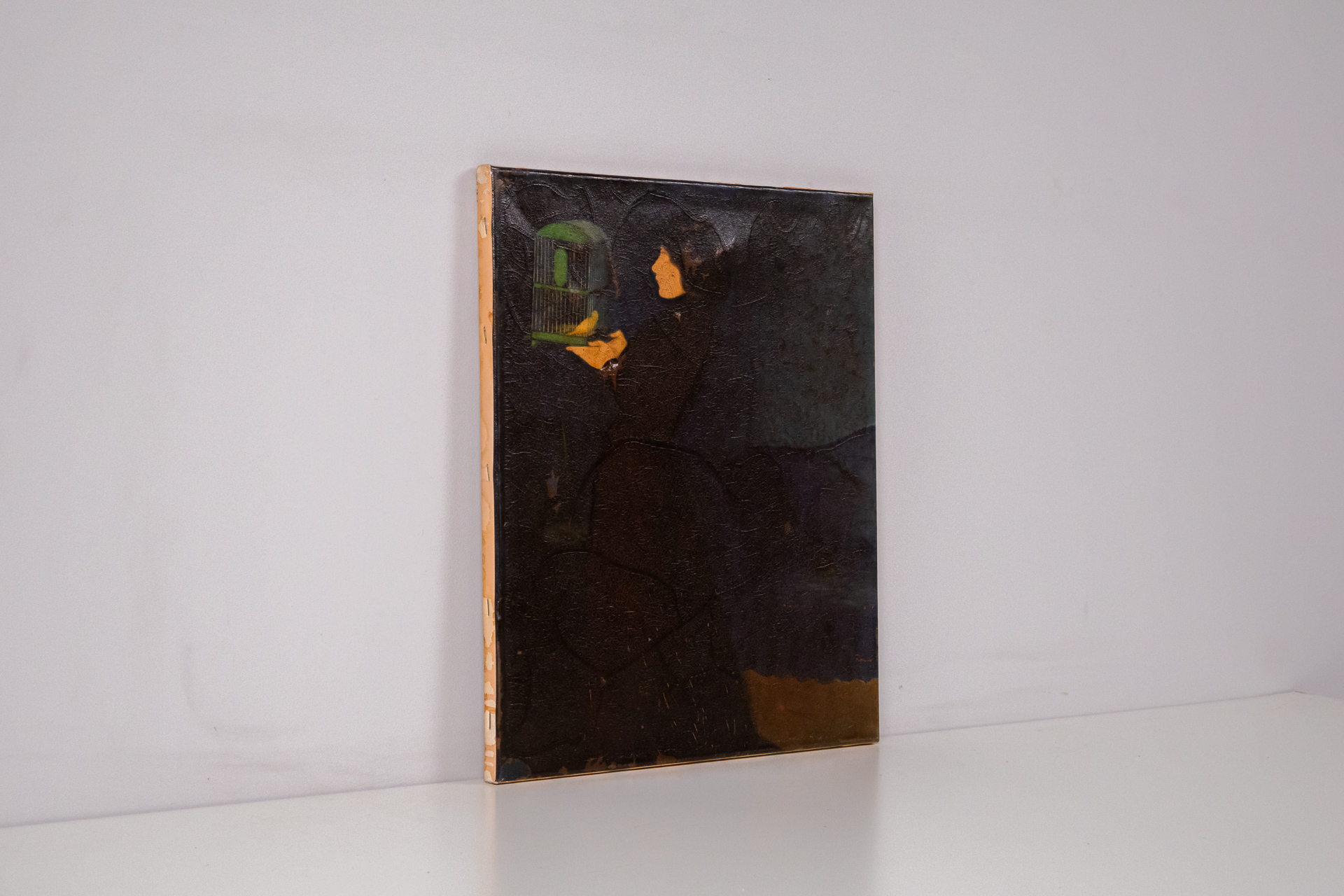 A festmény egy női alakot ábrázol, aki egy madárkalitkát tart a kezében. A háttér sötét, a figura és a kalitka élénkebb színekkel van kiemelve. A technika olajfestmény, a stílus modern, a kompozíció hangsúlyozza a nő...